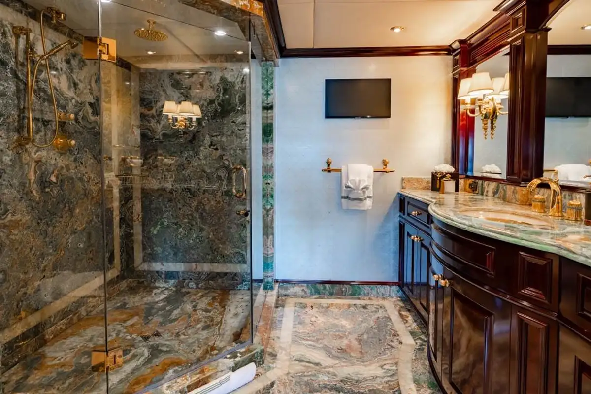 A stand-out feature is the elegant interior in mahogany and marble, designed by the renowned Evan K Marshall. Wide salons and lounges with sociable clusters of silk-upholstered seating, ornate ceilings, high-gloss varnished counters, marble-topped bars and gold fittings define her luxurious look and feel.