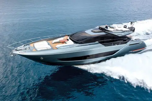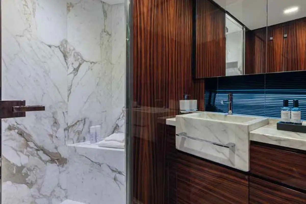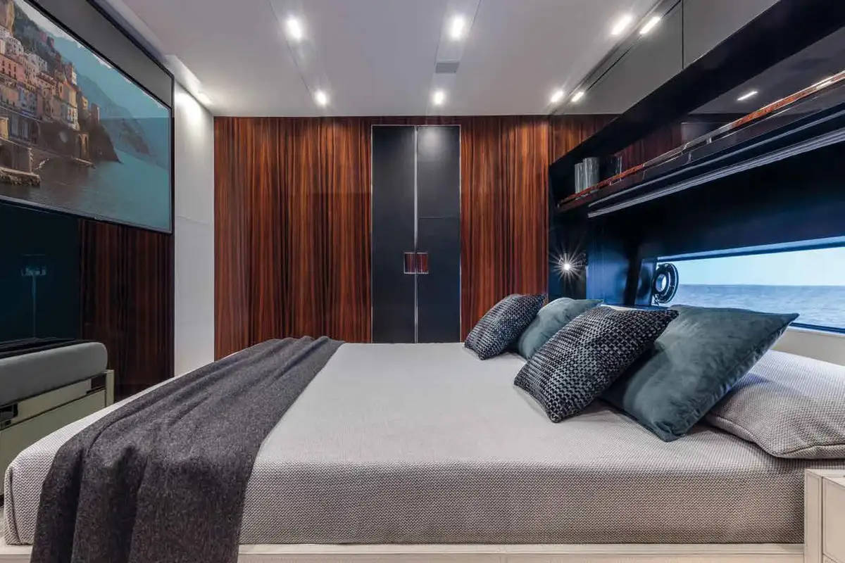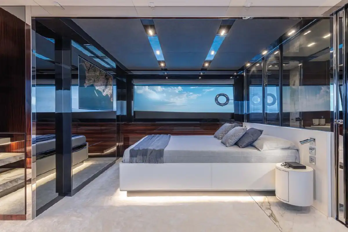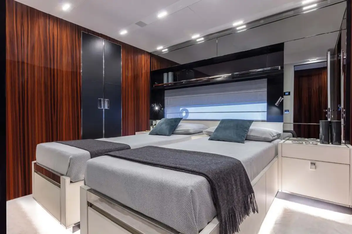 Inside, the yacht exudes contemporary elegance, blending fine woods, bespoke furnishings, and ambient lighting to create a refined and welcoming atmosphere. The main deck lounge is a haven of relaxation and also offers a space for interior dining if you're looking for some time out of the elements. She accommodates up to eight guests in four beautifully appointed cabins, including a full-beam master cabin complete with an en suite and walk-in wardrobe, a VIP suite, a convertible twin VIP cabin, and a twin cabin, each showcasing Riva’s signature attention to detail and comfort.