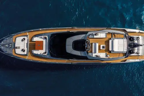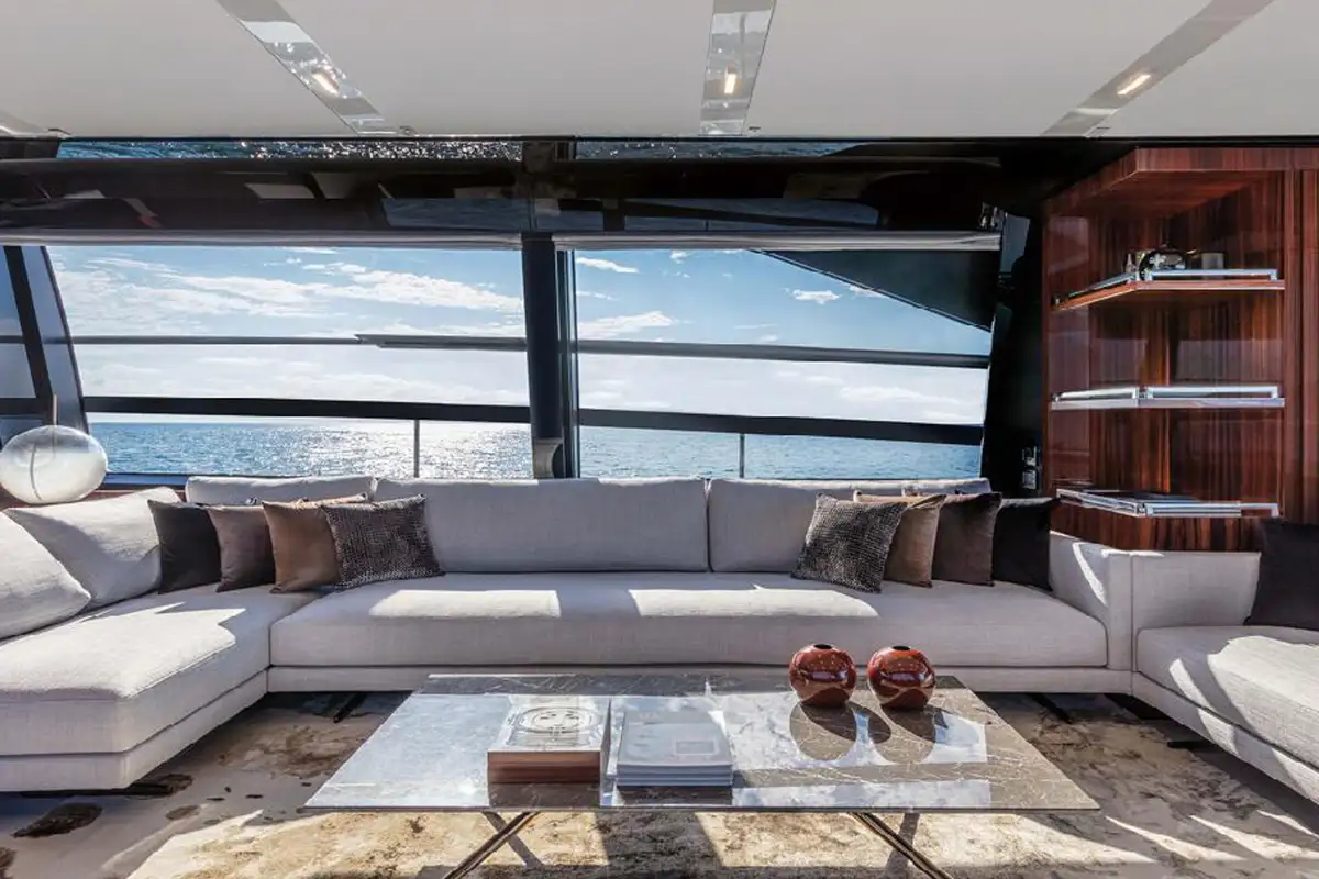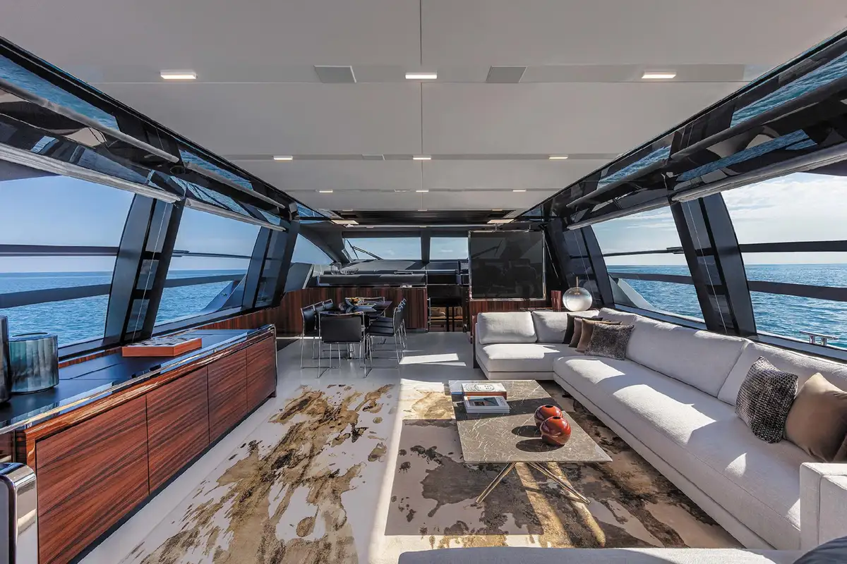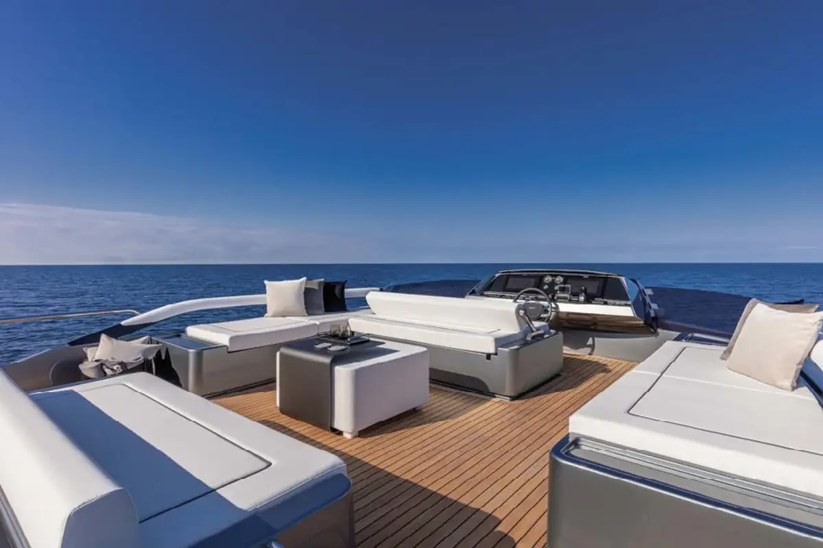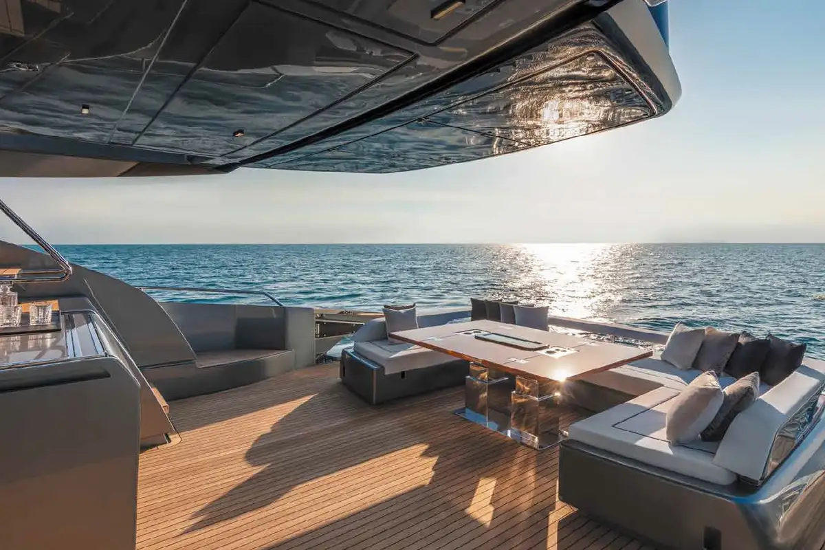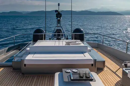 Her expansive exterior decks are thoughtfully arranged for both relaxation and entertainment, and is the perfect space to take in all of the splendour that the ocean has to offer. Heading up to the flybridge, you'll find a comfortable seating arrangement with a sunpad, and below there is a spacious aft dining and seating area, suitable for al fresco dining in the shade. What's better, is that this area is also convertible into another sunpad, perfect for cooling off after a swim. The foredeck, with its wide expansive views and seating, offers the perfect location for a sunset cocktail.
