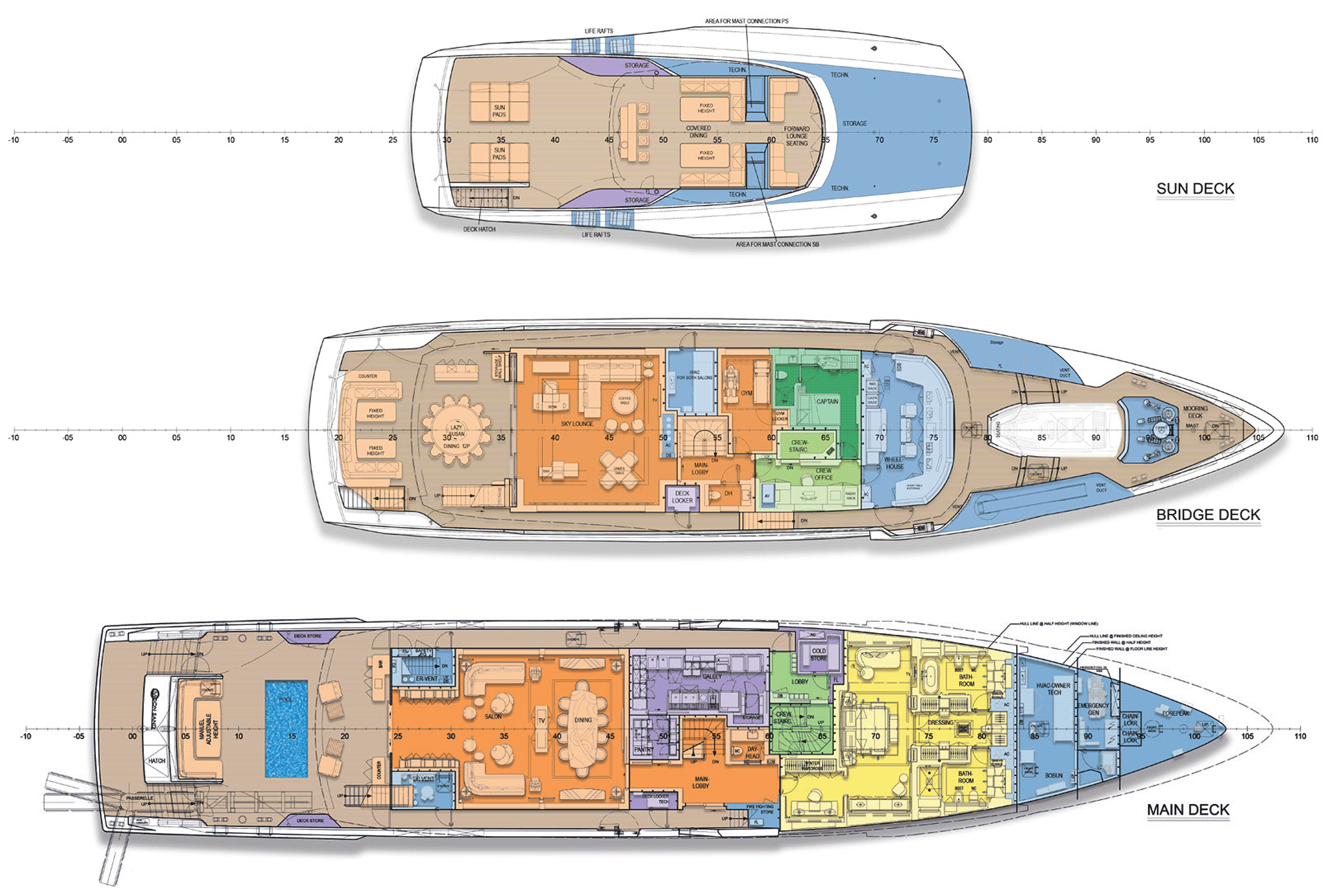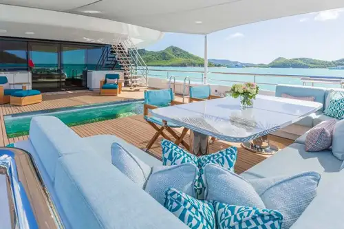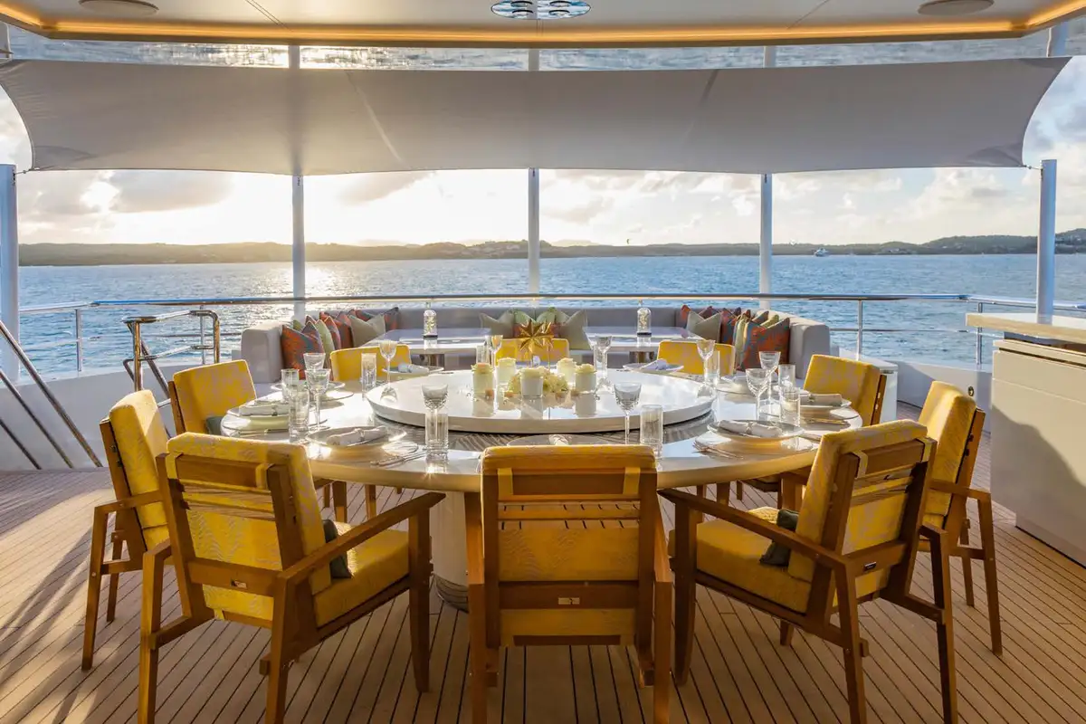 The sundeck is another superbly designed open-air living space with reclining triple-size day beds, a sit-up bar, a dining area and observation seats up front with the best view on board. The upper aft deck is the main outdoor dining zone, ideal for special occasions, with a big round table and sofas aft.