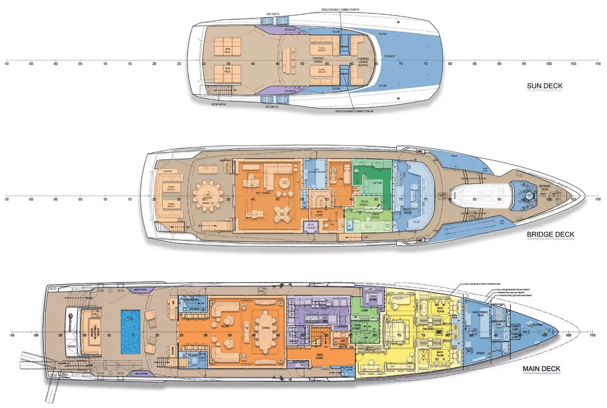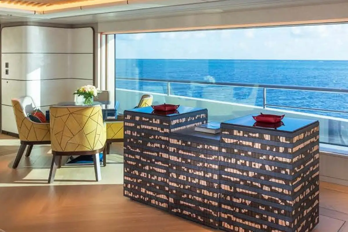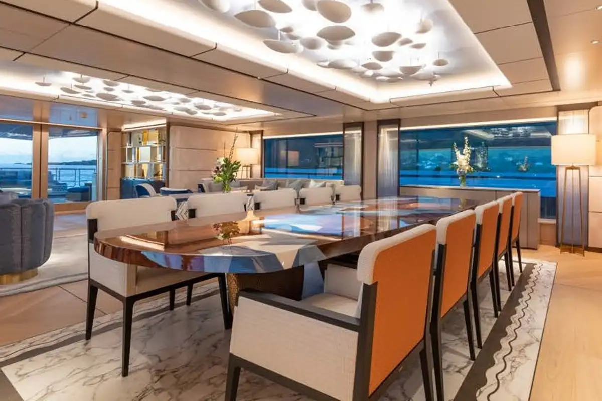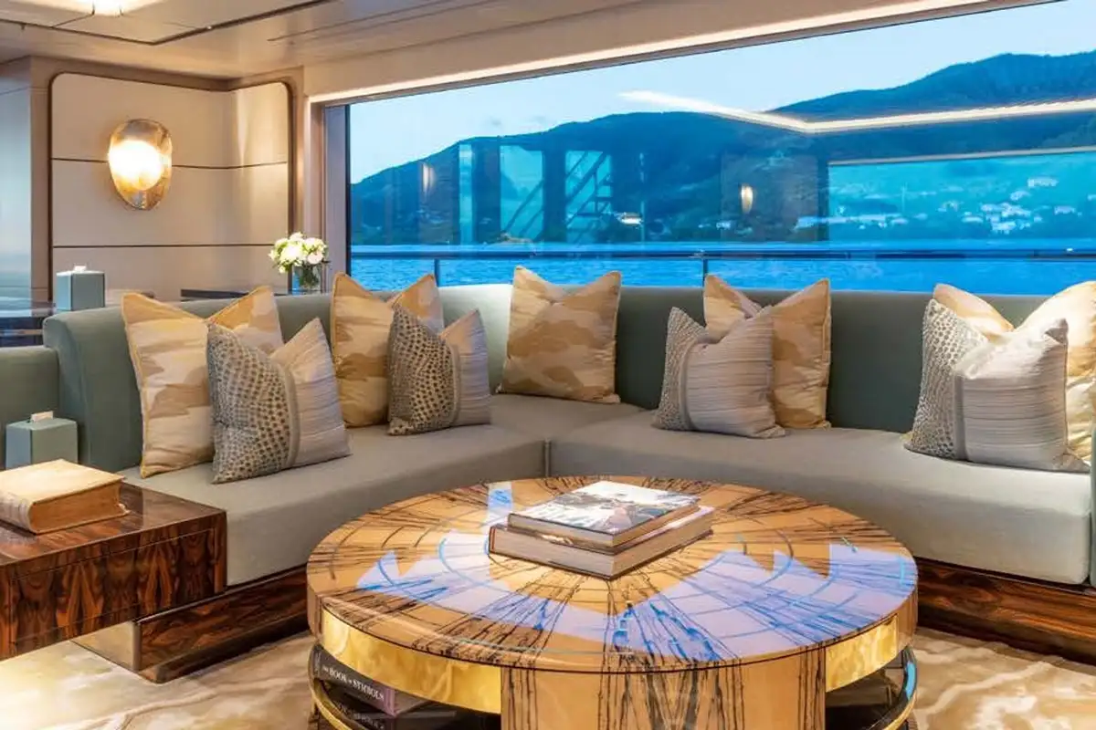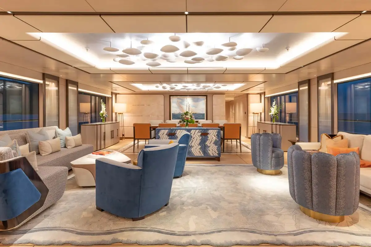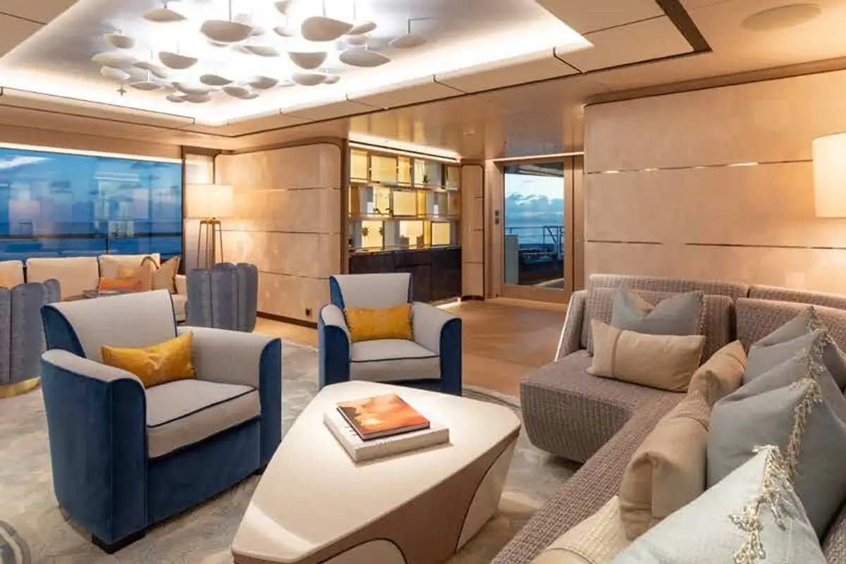 Her interior is designed and fitted out to a world class standard by the renowned Bannenberg & Rowell studio in a sumptuous, tactile and inviting contemporary style, with bespoke one-off pieces of furniture, cool module seating and state-of-the-art lighting systems that create a cosy, easygoing atmosphere. Huge plate glass windows bring the seascape into the main social spaces and bathe them with natural light.