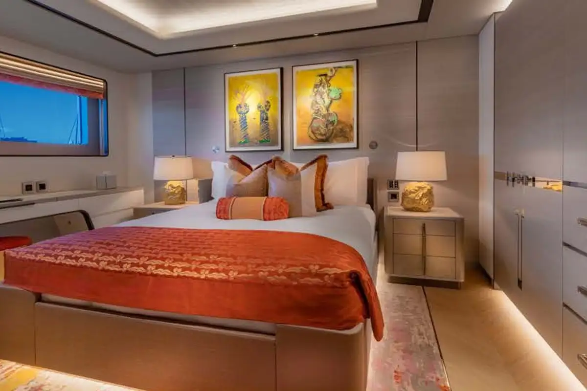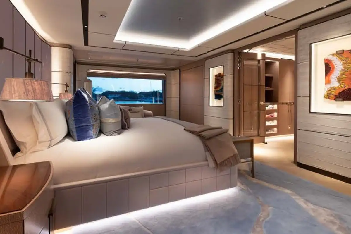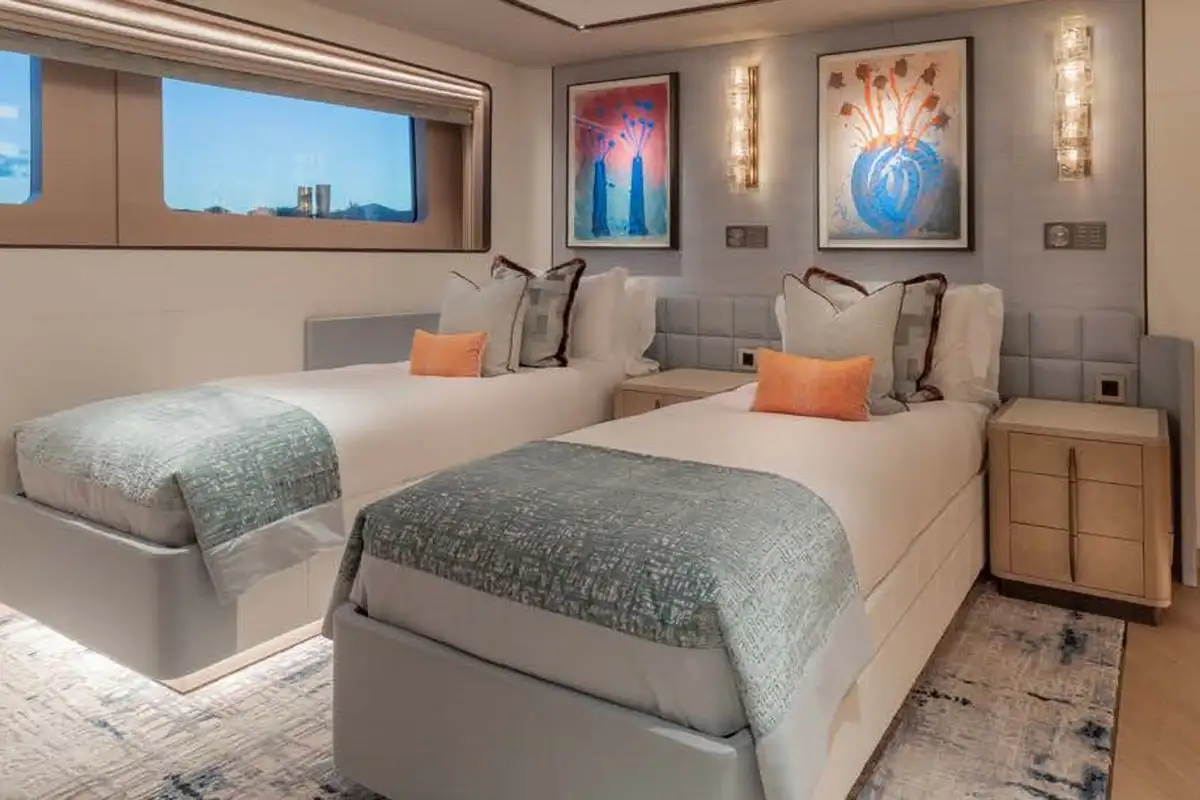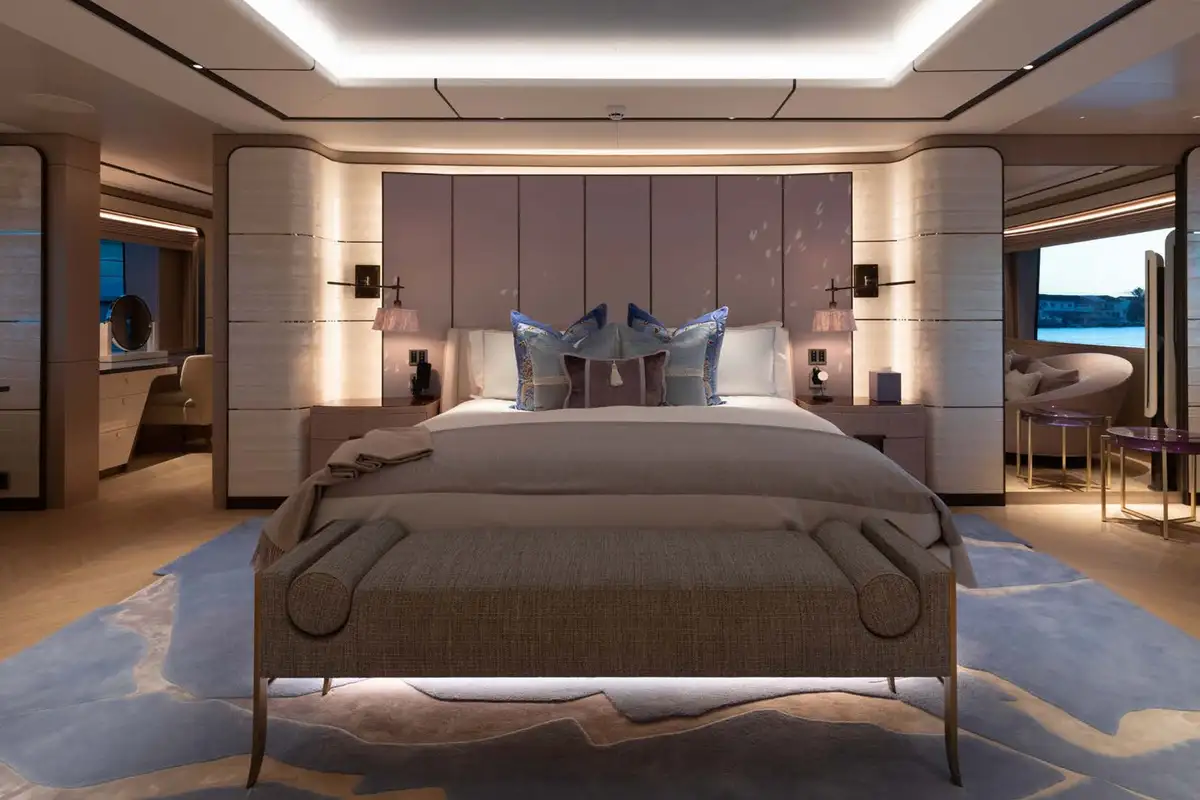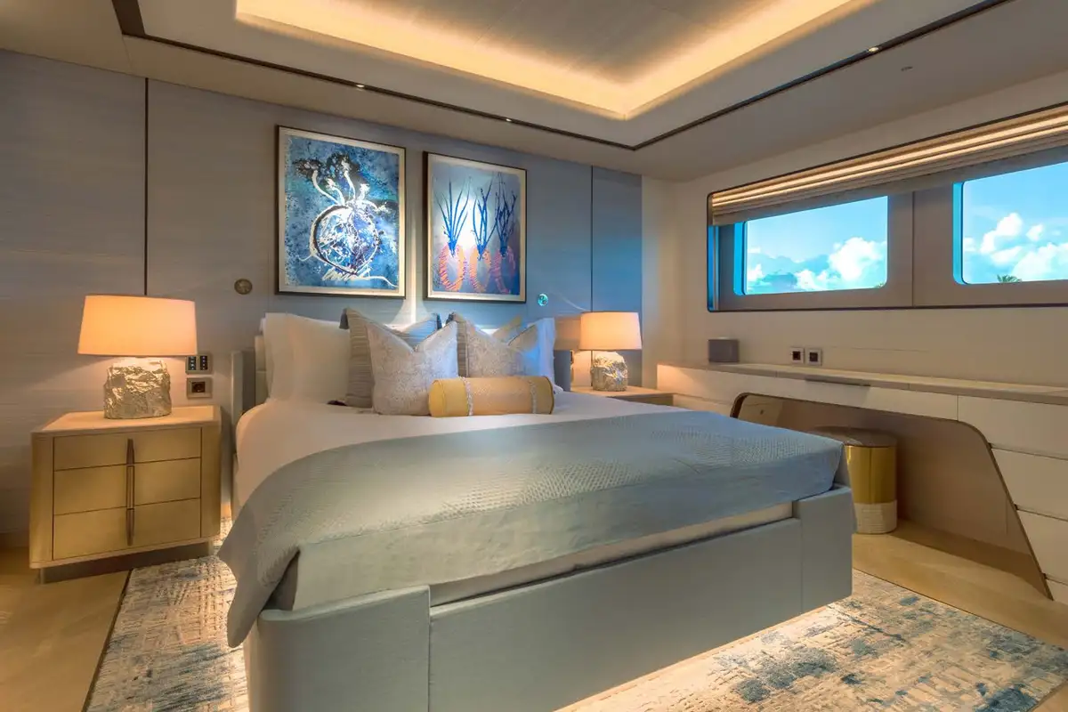 The master suite is a stunning full-beam space with private study and lounge areas. The VIP suite can also be configured with its own private lounge. All guest cabins have excellent sea views through large windows and are beautifully finished in a relaxed contemporary style.