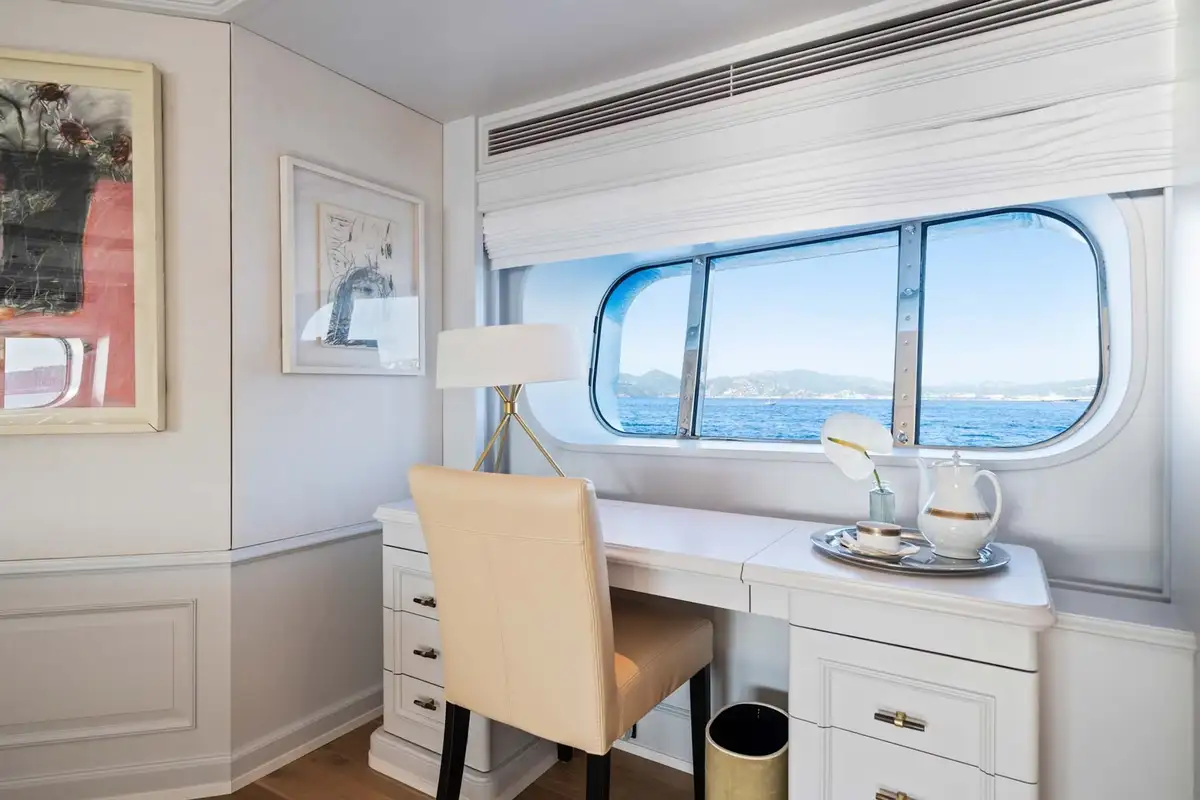 Open your eyes to views of the anchorage glittering through the windows of your master stateroom. The ornate panelling and deep carpet underfoot creates an ambiance of easy luxury you as you dress for breakfast. This is one of six equally fine cabins aboard, so you know that your party of 12 will have all slept well.