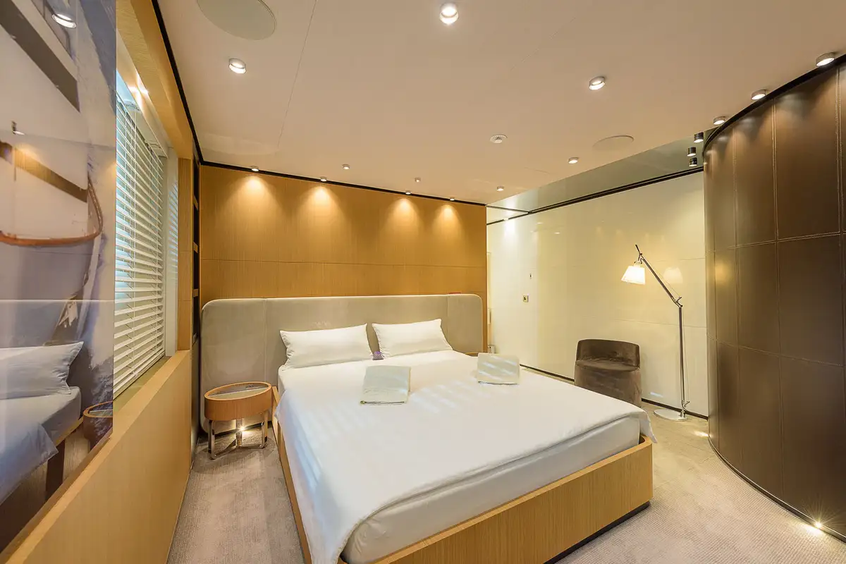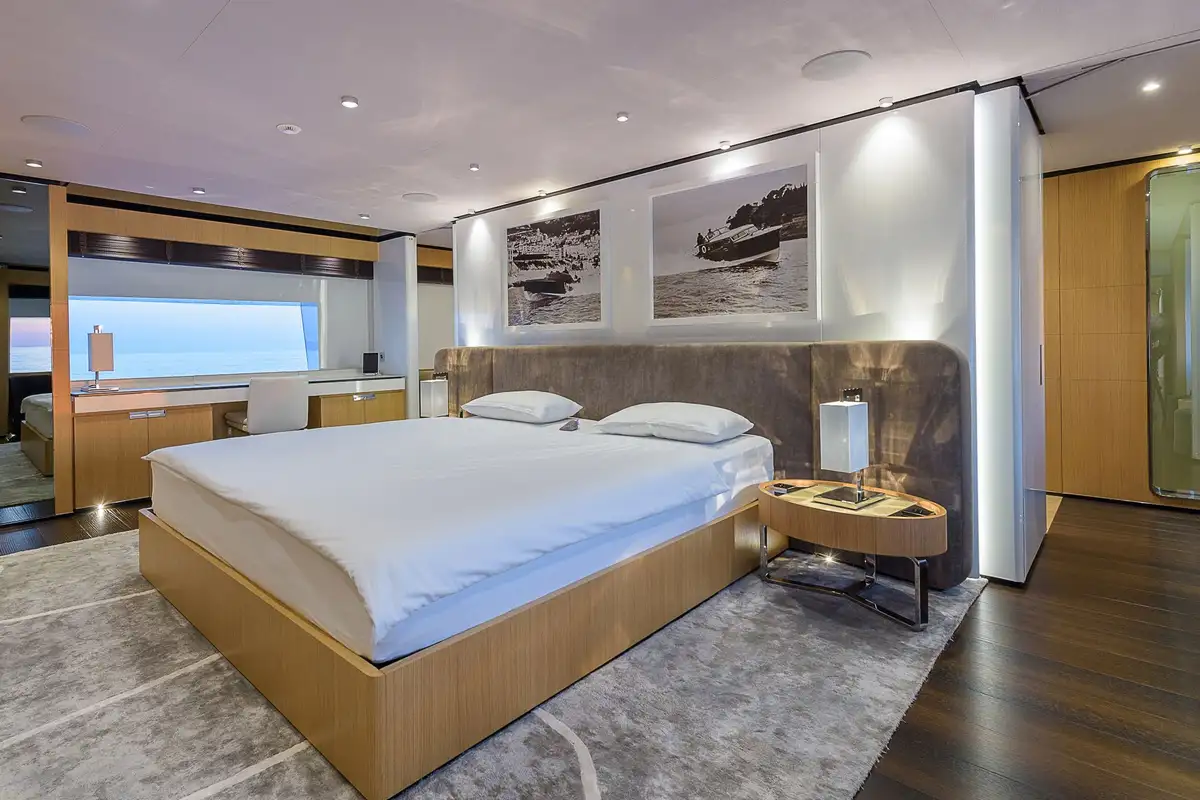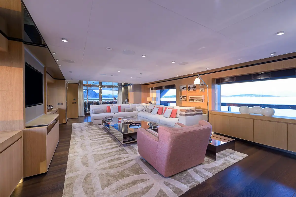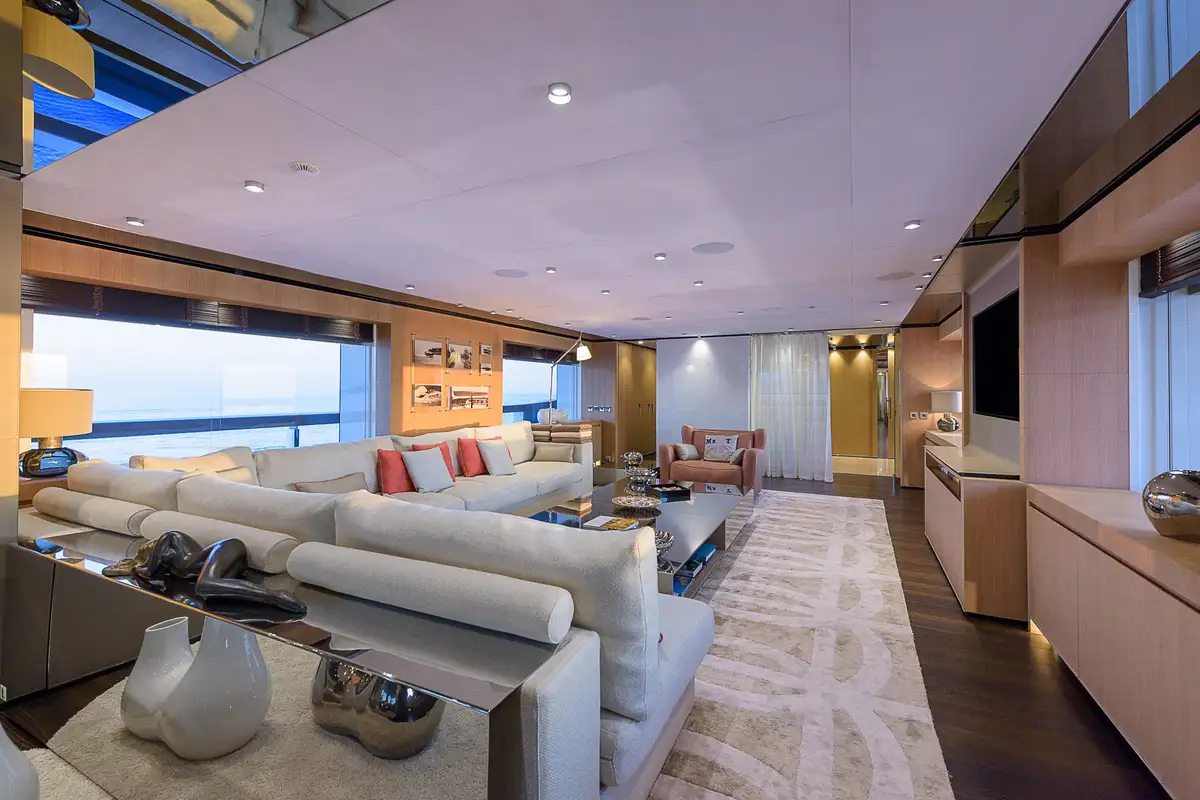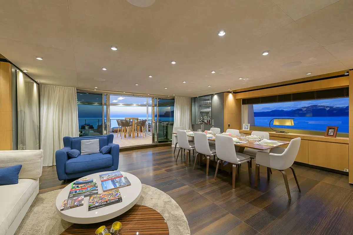 The day’s exertions have you craving some quiet time, so head back to the yacht where the main deck lounge is calling. This sprawling space is ideal for relaxation, with oversized windows, an enormous L-shaped sofa and a calming neutral colour scheme. Snuggle up with loved ones to watch a film on the large TV or, for a little solo time, the upper deck sky lounge and aft deck provide the perfect sanctuary to curl up with a good book.