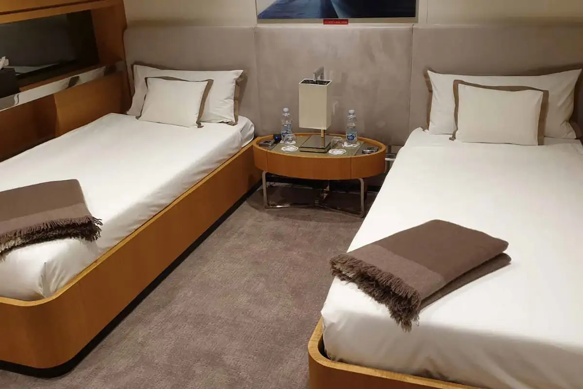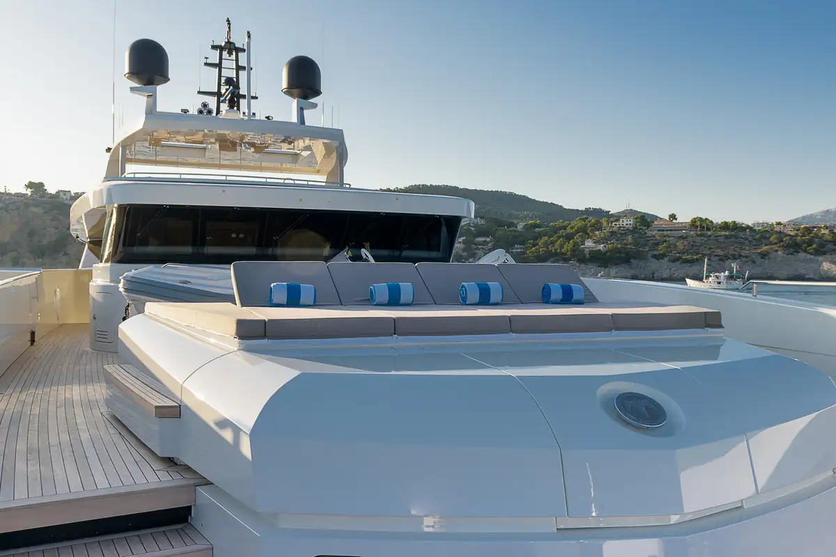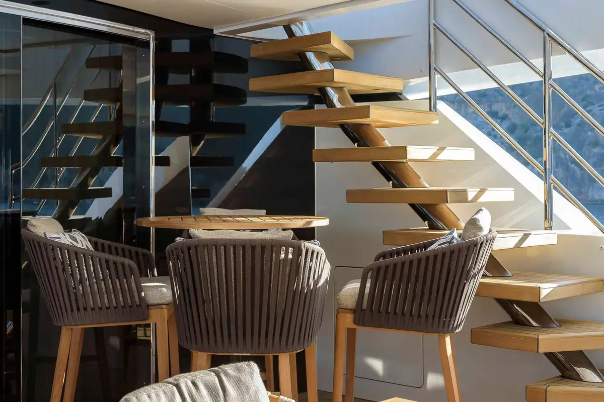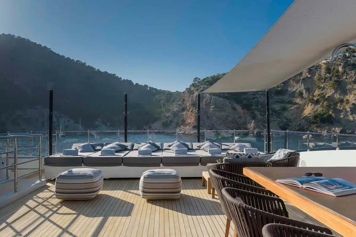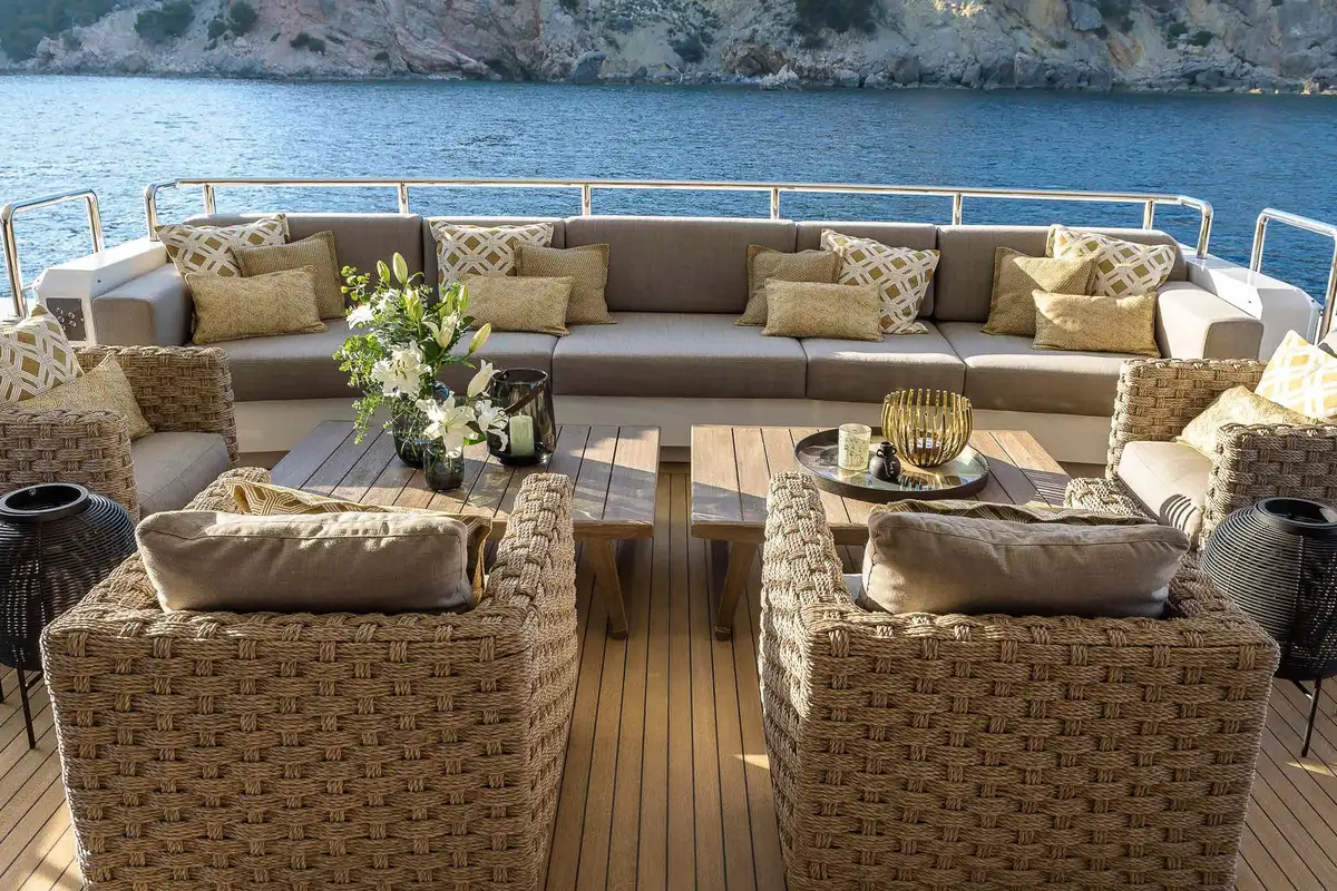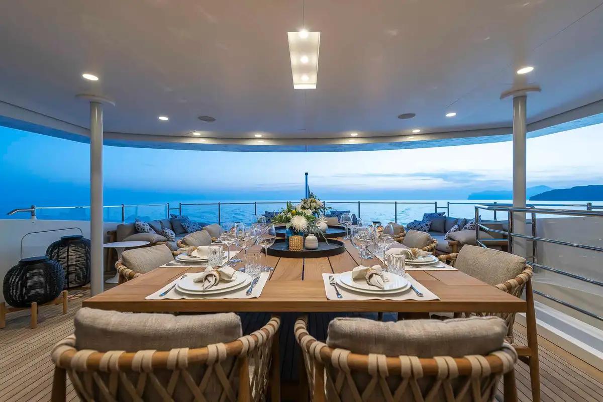 The day’s exertions have you craving some quiet time, so head back to the yacht where the main deck lounge is calling. This sprawling space is ideal for relaxation, with oversized windows, an enormous L-shaped sofa and a calming neutral colour scheme. Snuggle up with loved ones to watch a film on the large TV or, for a little solo time, the upper deck sky lounge and aft deck provide the perfect sanctuary to curl up with a good book.
