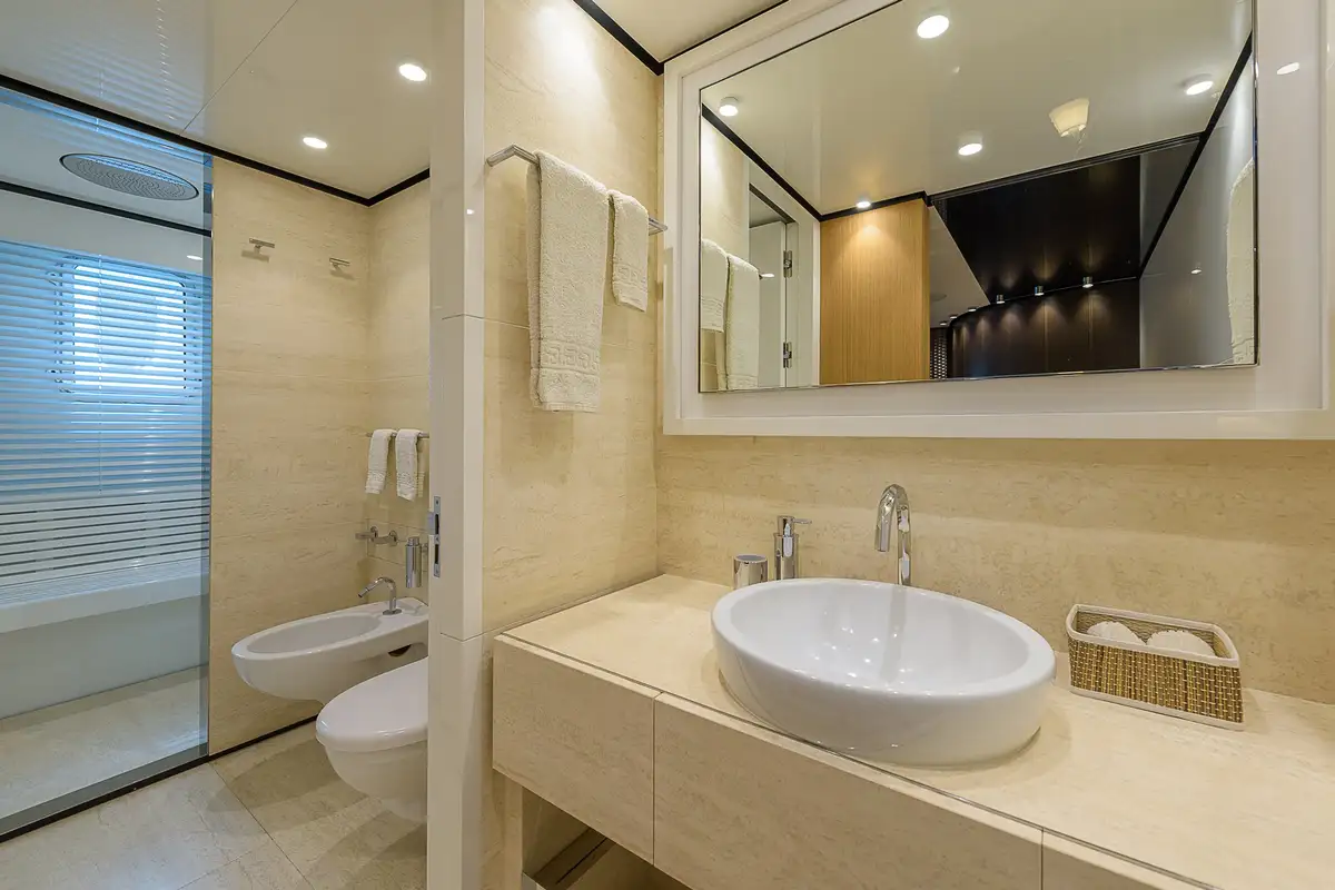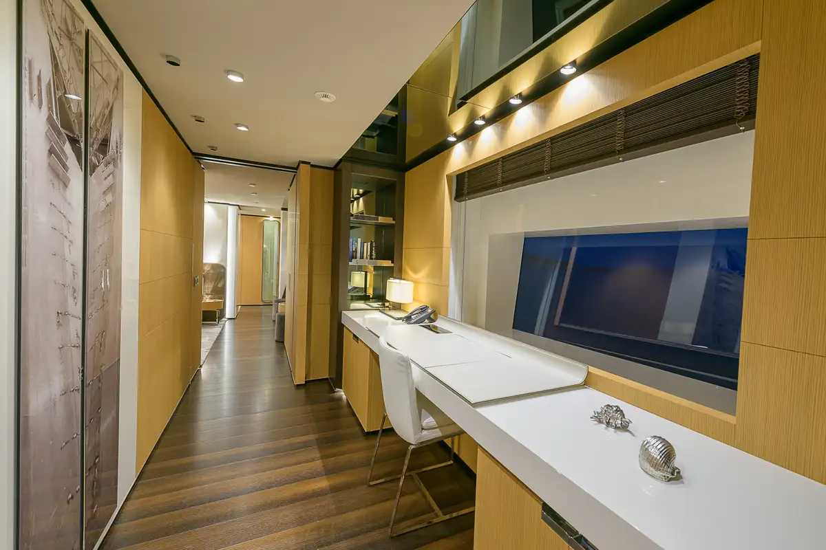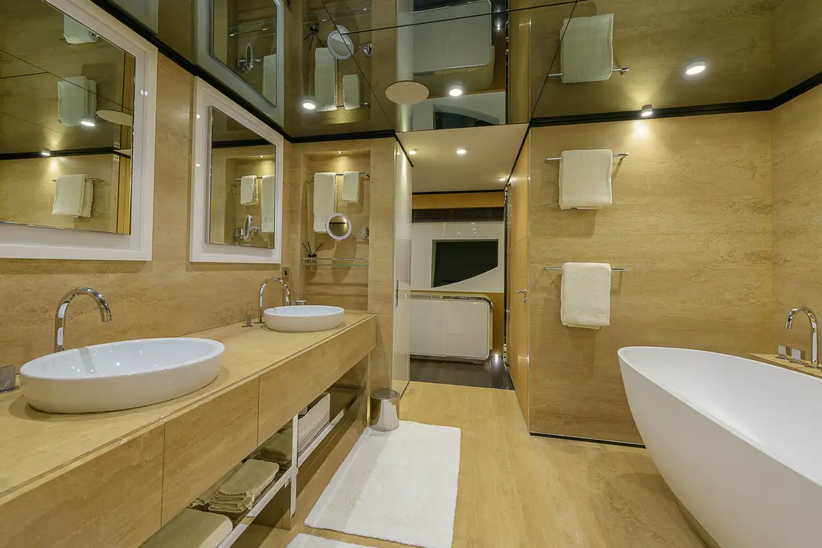 MR T’s full-beam master suite, with its private office space and large bathroom with inviting bathtub, is located on the main deck forward. A further two doubles and two convertible twin suites with pullmans are found on the lower deck. The whole yacht is immaculately presented, having been consistently well maintained and recently refitted in 2020.