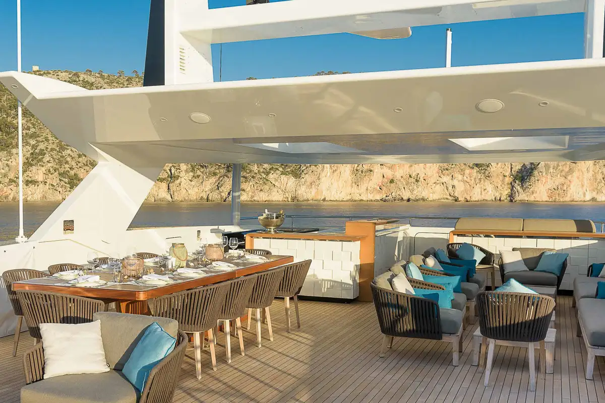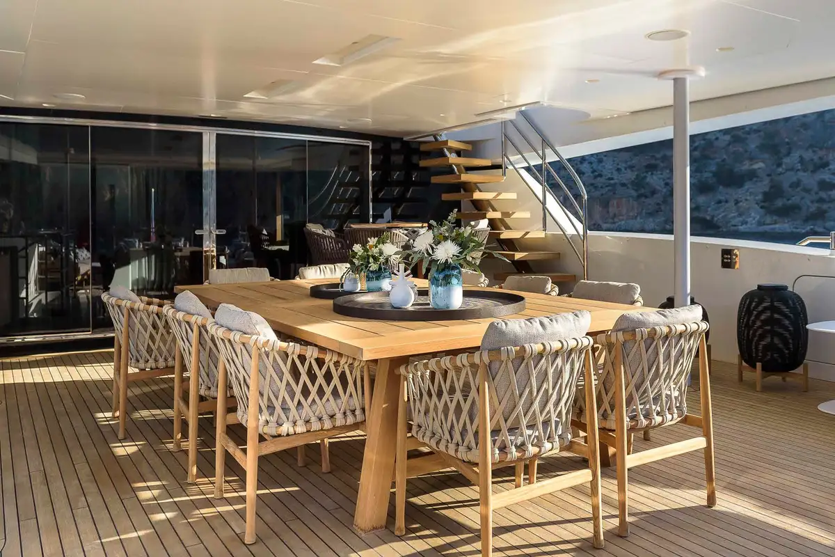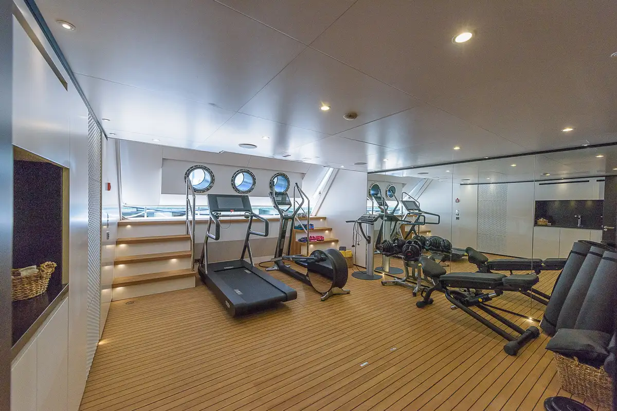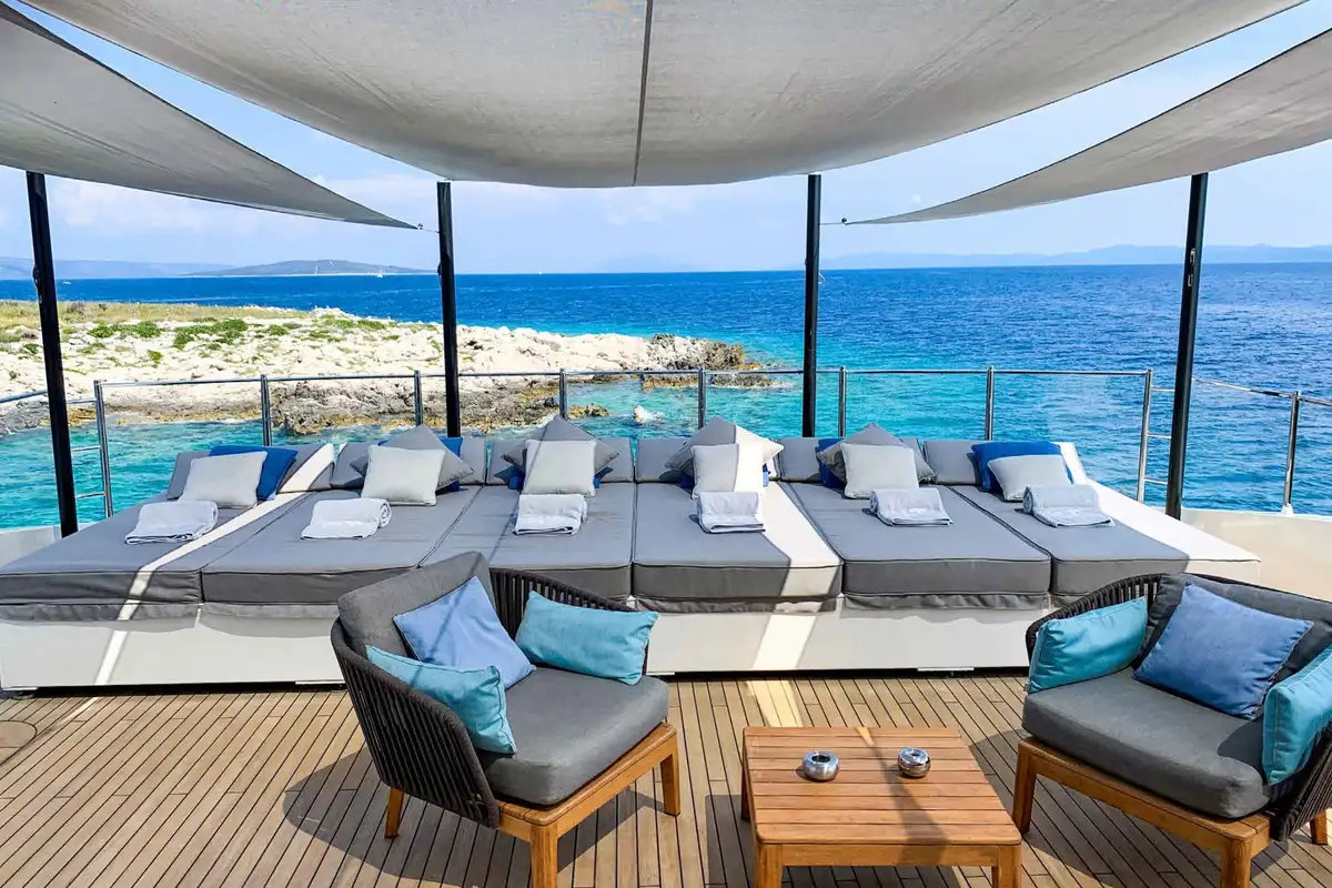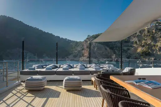 What better way to start the day than a workout in the large beach club, which opens directly onto the swim platform on the lower deck aft. Choose from the treadmill, cross trainer, free weights and yoga balls, then jump straight into the water to cool off. It is a short walk up to the main deck aft, where breakfast is served with a side of breath-taking views to inspire the morning’s activities. Take your pick from a large selection of watertoys, including an electric scooter, or relax on the bank of sun pads on the foredeck.