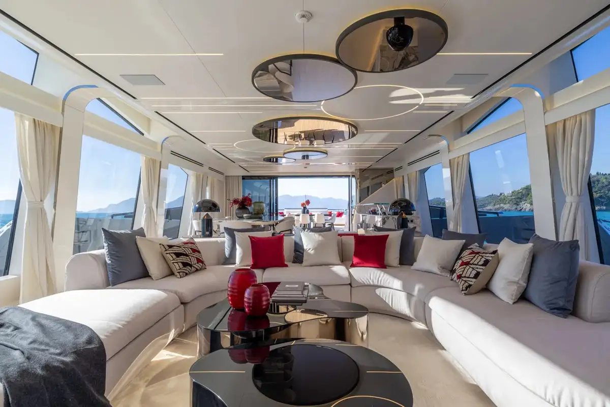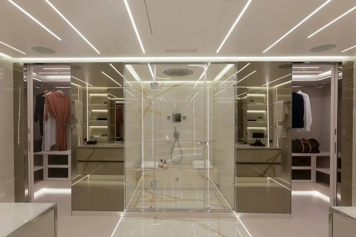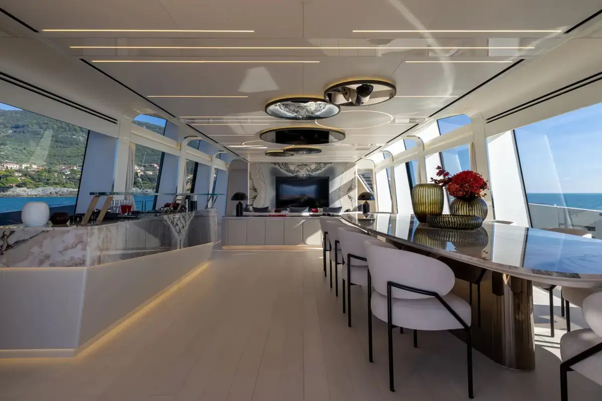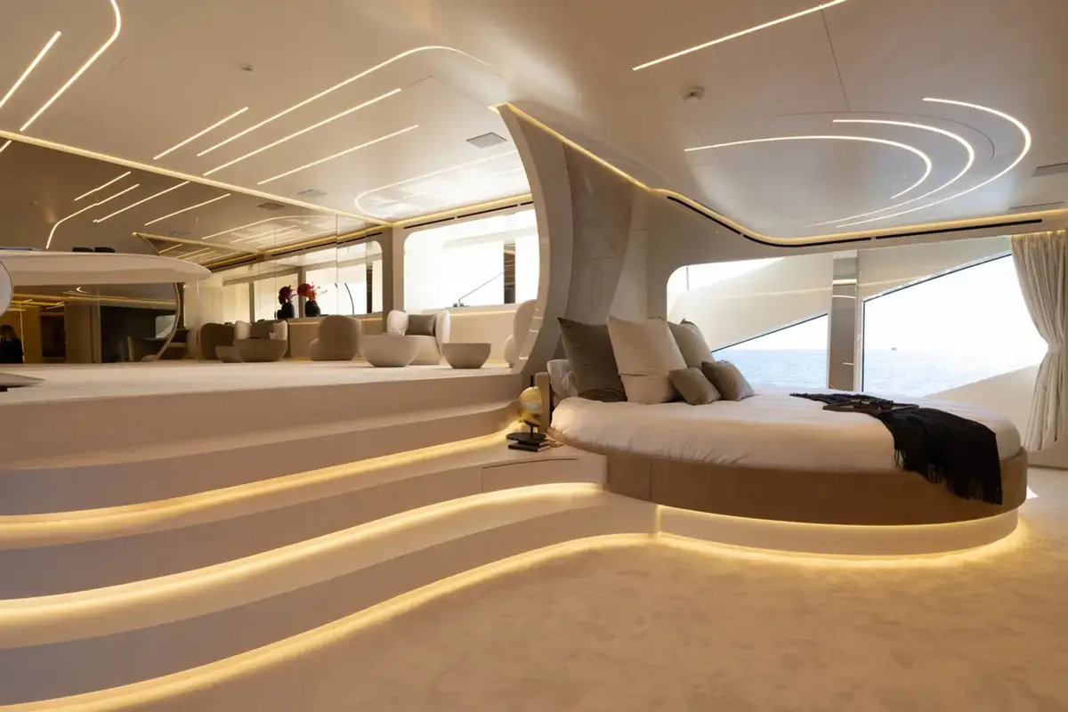 Her innovative, modern interior continues forward in the split-level master suite. It maximises space and light to create a magnificent futuristic haven to unwind. The upper level features a lounge and office space, while the lower level is home to a king-sized berth, fantastic views, and an en-suite bathroom.