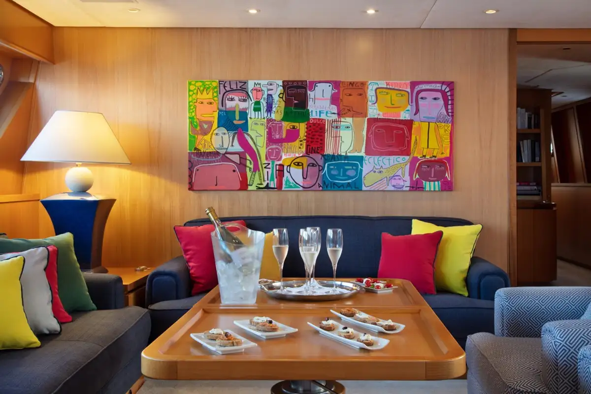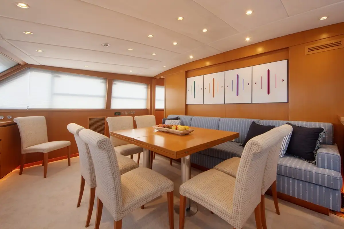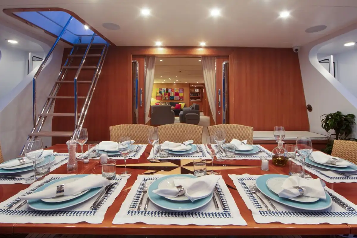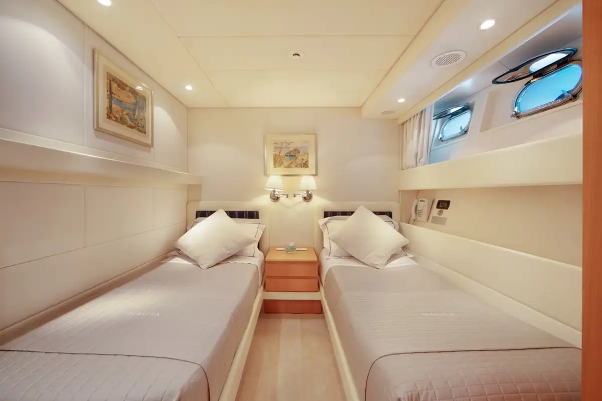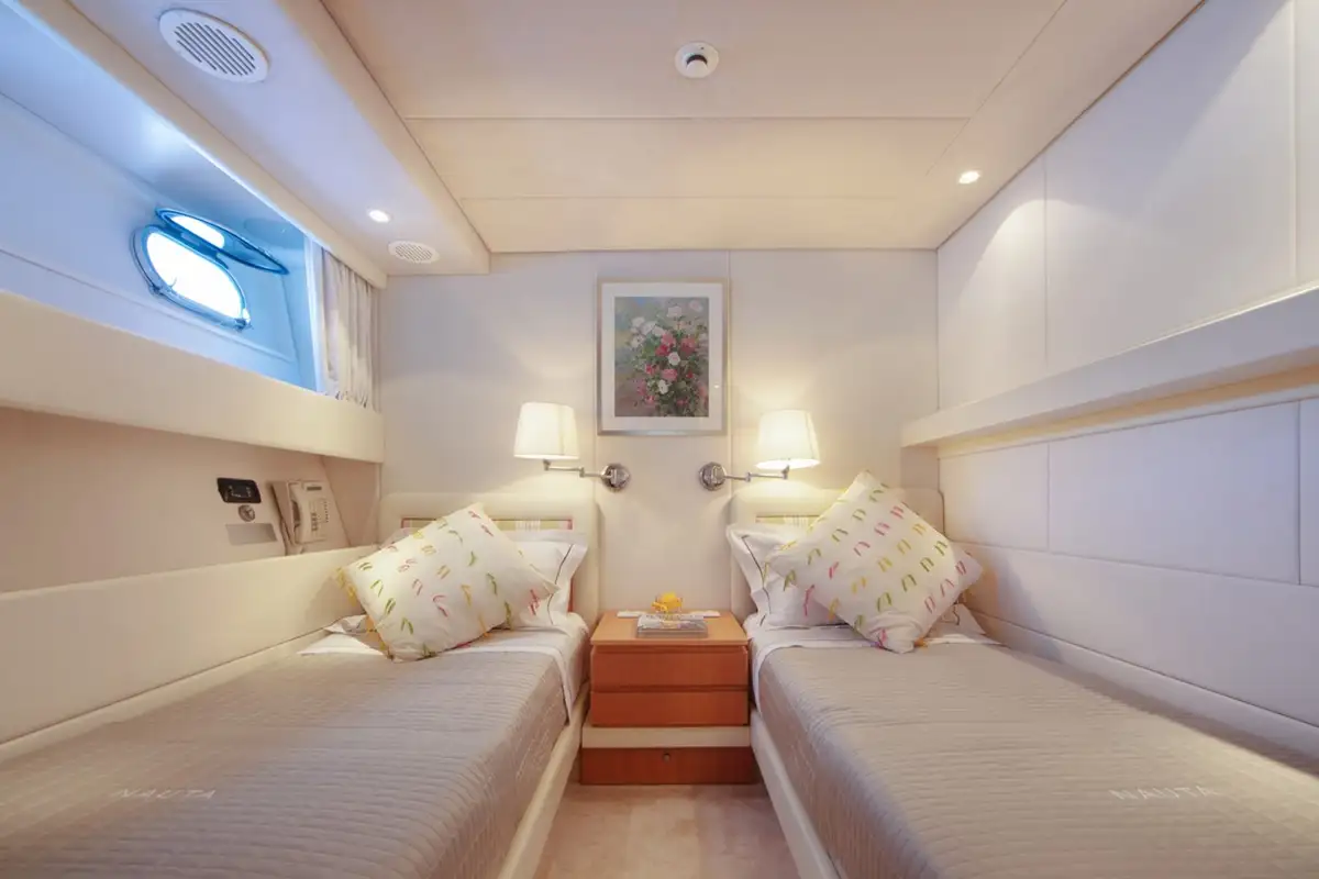 Up to 10 guests are accommodated on board NAUTA across five spacious cabins on the lower deck, including two double full-beam cabins, one double, and two twins. Elsewhere inside, she boasts a colourful and contemporary saloon with comfortable sofas, with a formal dining room forward showcasing 270-degree views plus a walk-in wine cellar.