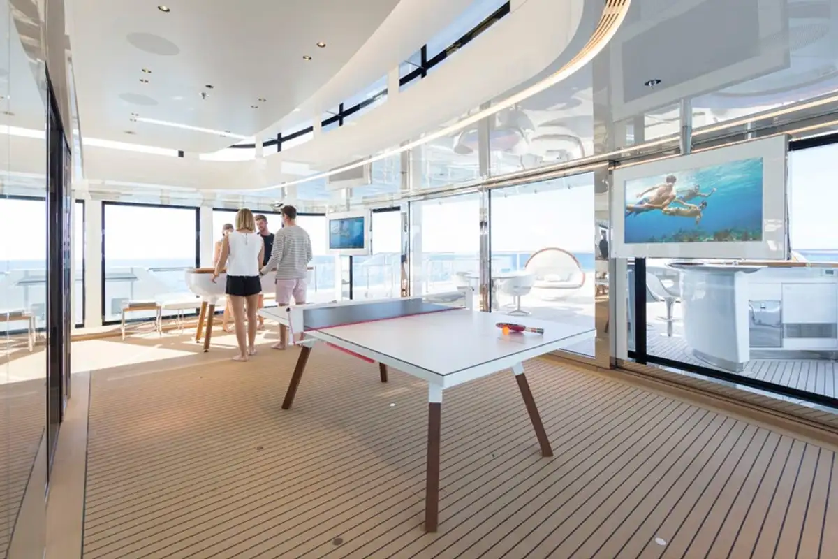 At lunch, choose between freshly prepared California rolls at the sky lounge’s sushi bar or a delicious spread of salads and grilled lobster tails on the nearby aft deck. After, you descend to the main lounge to watch a family movie before the children head up to the sun deck for an afternoon of entertainment with table tennis, table football, and games with the crew.