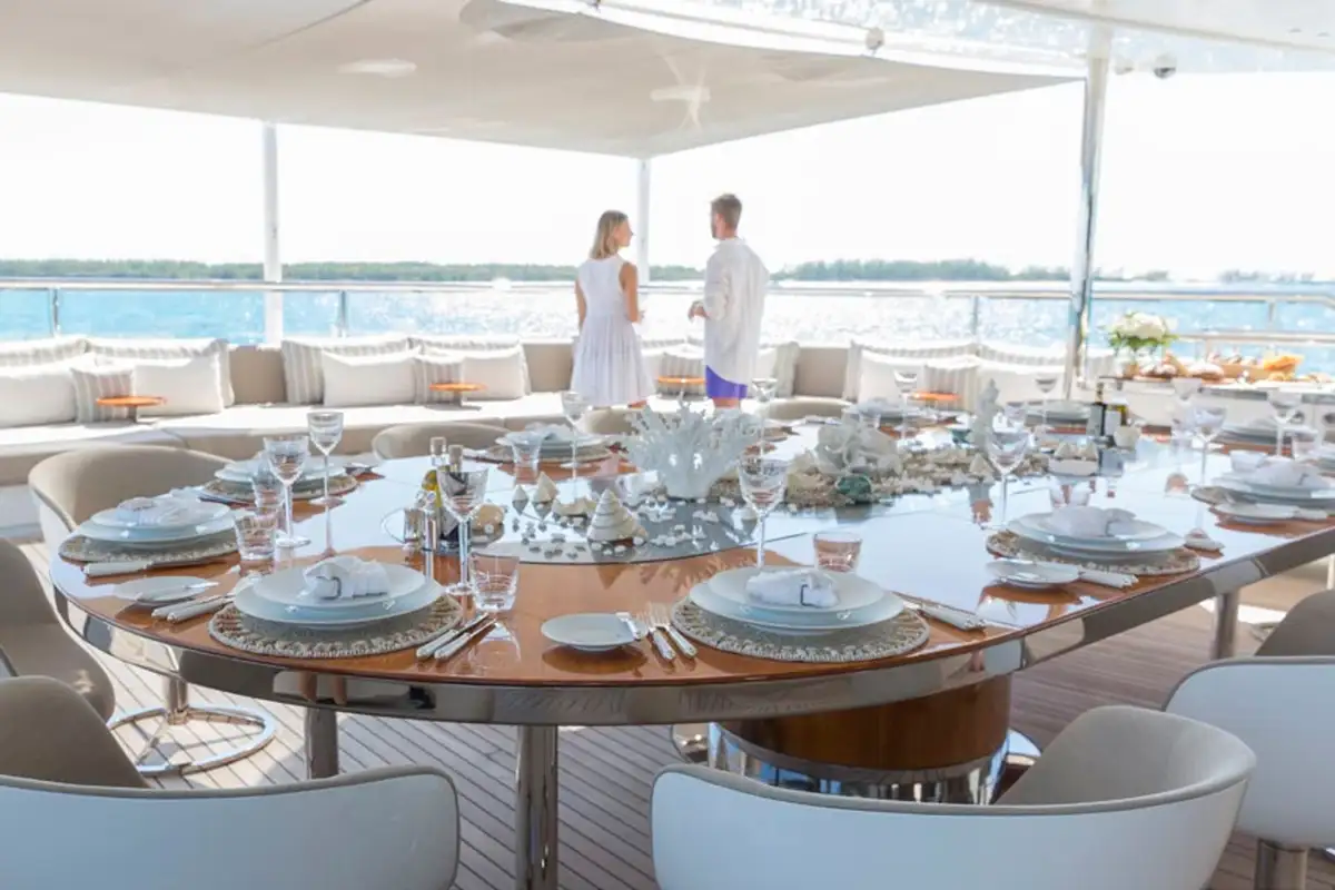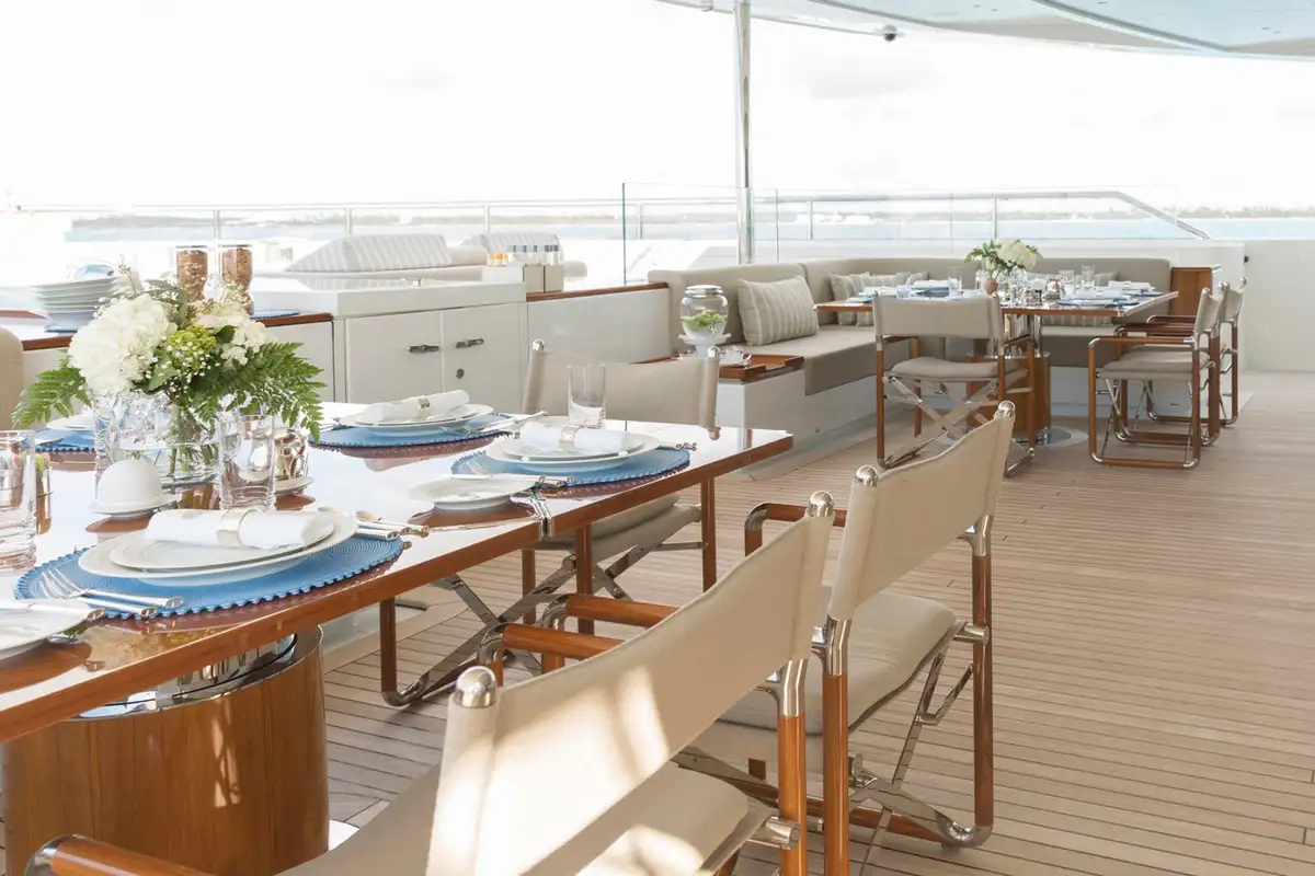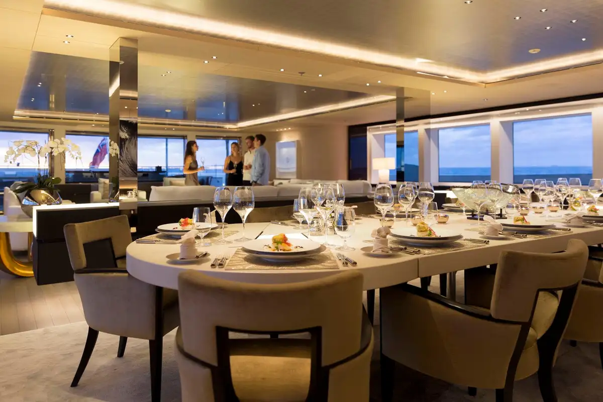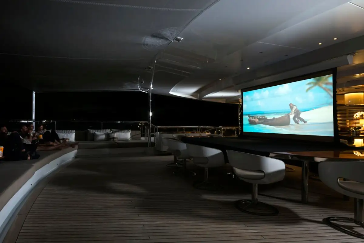 Cocktails are served on the main deck aft before you enjoy a spectacular dinner in the lounge’s dining area, sharing tales of your day’s adventures. To complete your perfect day on board, head to the upper deck aft, now transformed into an outdoor cinema, to watch the latest film under cosy blankets.
