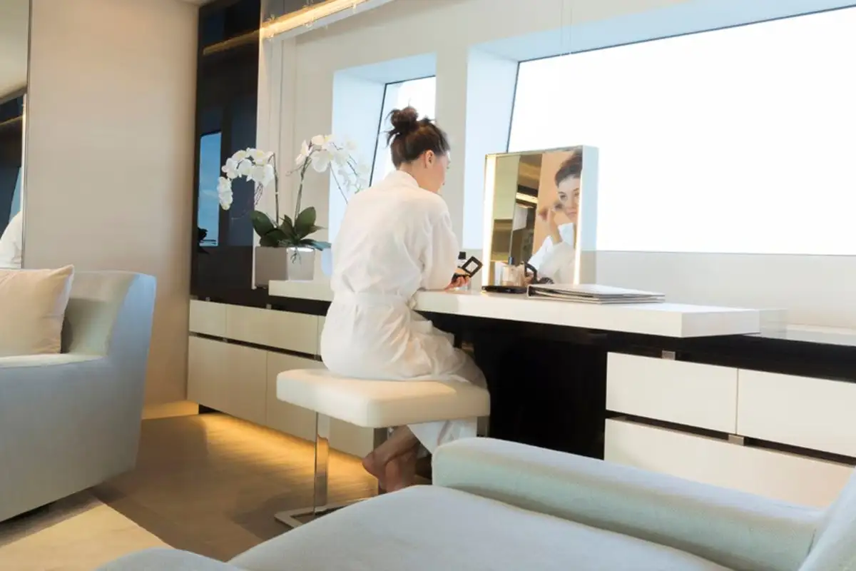 Which leaves you free to enjoy an afternoon of indulgence in the expansive spa. Work your way through the sauna, steam room and hydrotherapy bath before the on board masseuse works her magic. Next up, a facial, a mani pedi and a new hairdo for the approaching evening.