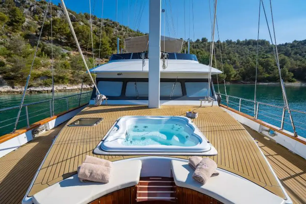 Her outside spaces include an expansive sun deck with separate lounge and sunbathing zones, a foredeck lounge with a jacuzzi pool, a shaded and sheltered main deck aft cockpit with a big dining table, and daybeds on the stern overlooking the bathing platform. Most of these areas, including the sundeck, can be shaded with awnings when required.