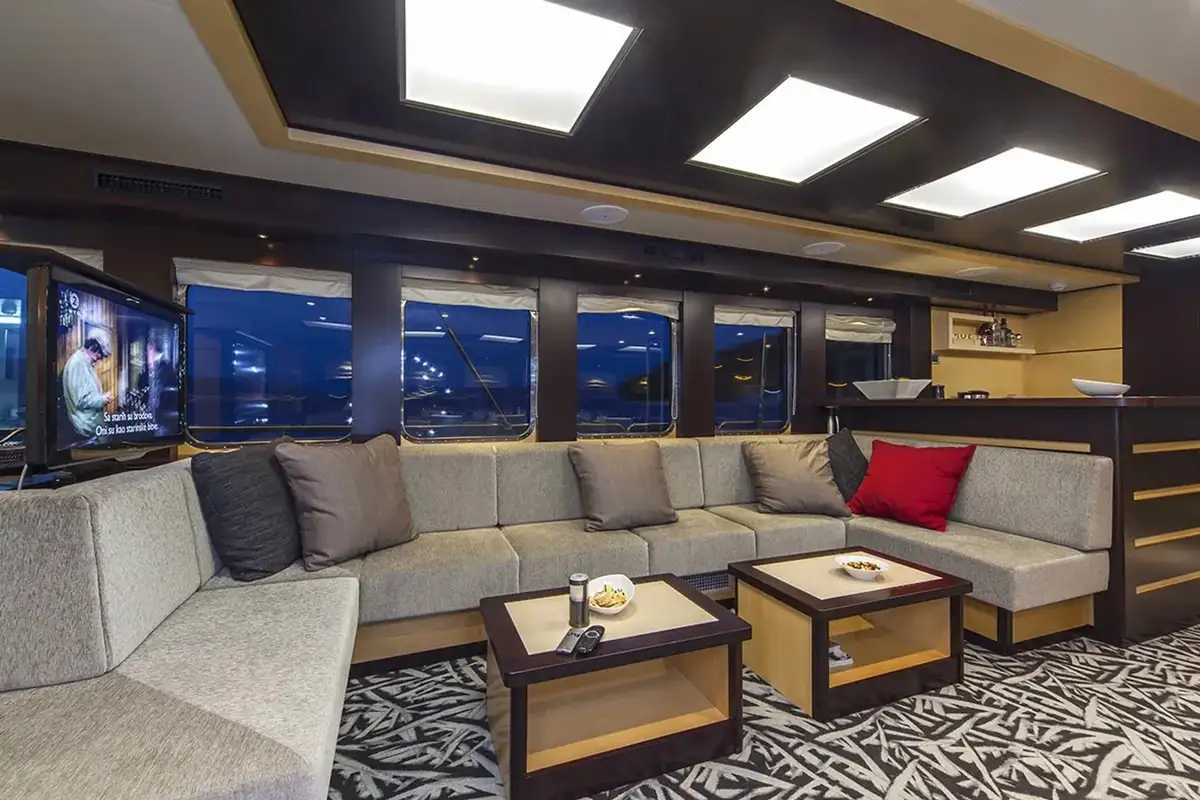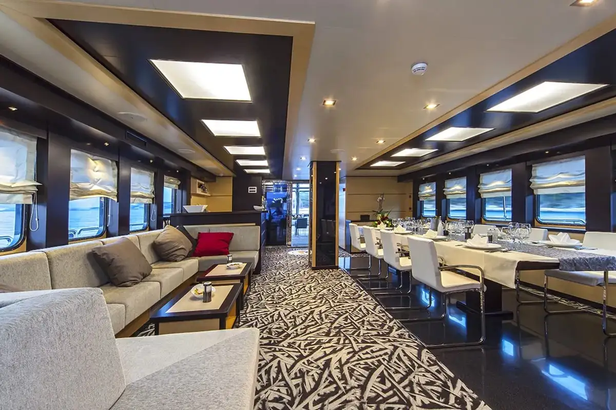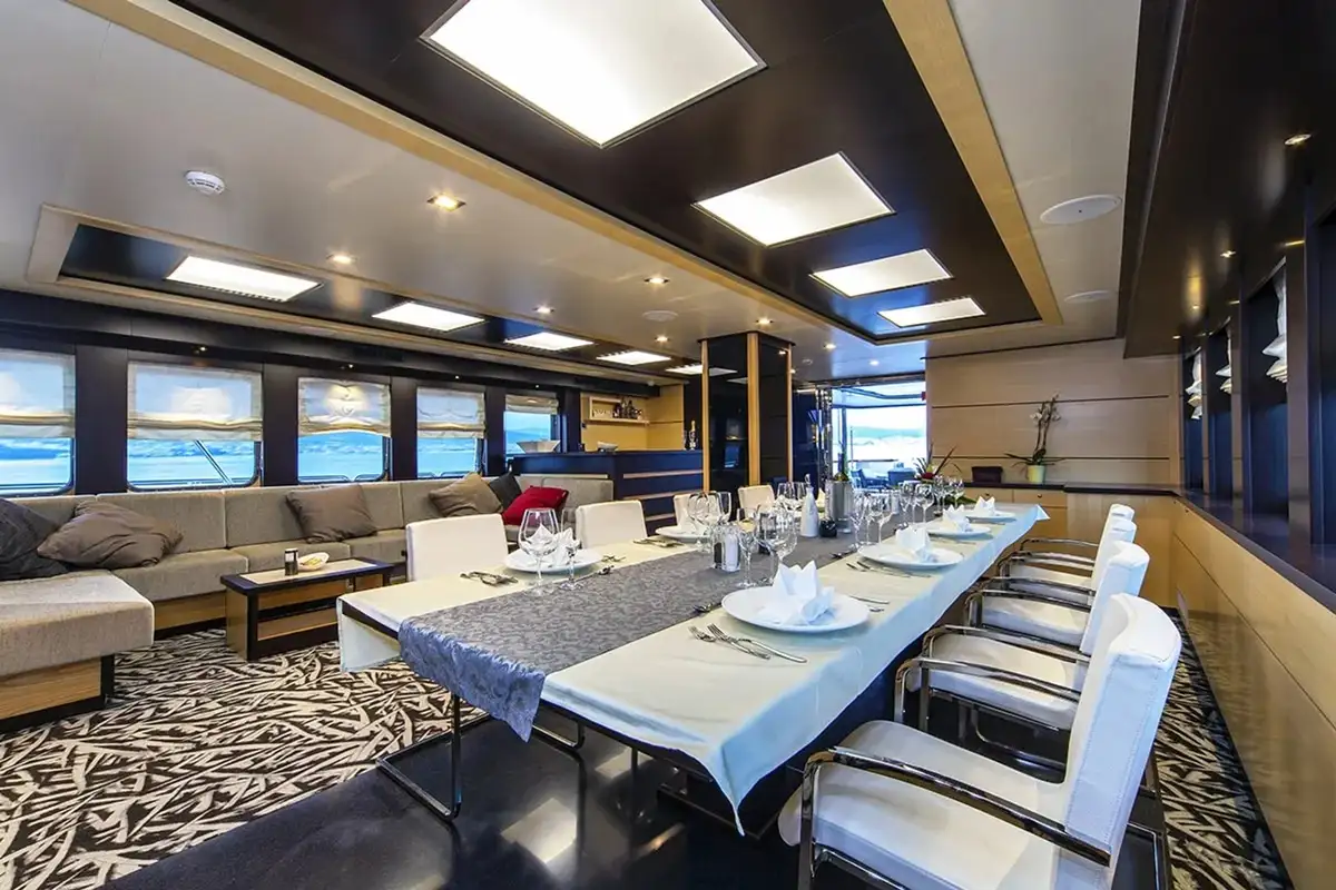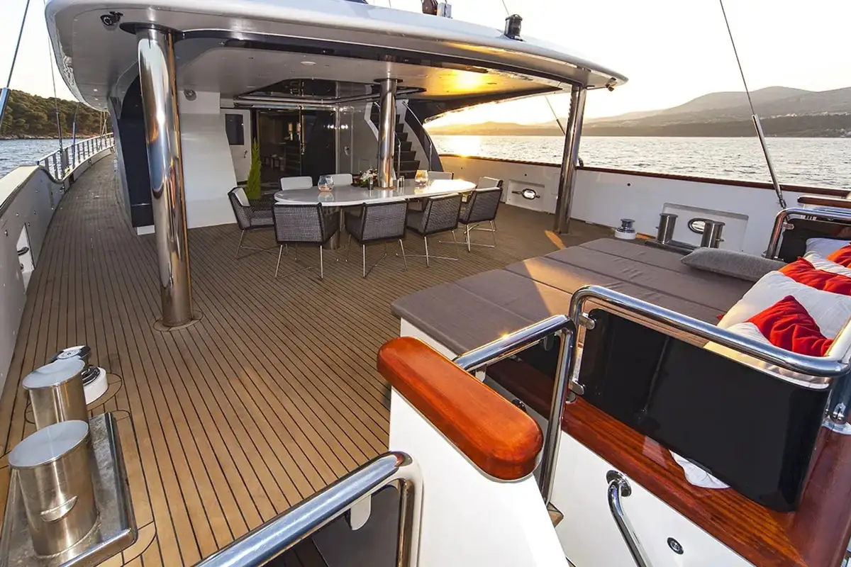 The main deck lounge is exceptionally large for a sailing vessel, with bar, lounge and dining areas. Wherever you choose to sit in here, there are excellent sea views and plenty of natural light. A superb menu of modern Mediterranean cuisine is served on board, either inside or al fresco.