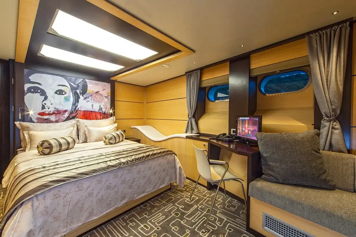 All of her six guest cabins are on the lower deck. These include five doubles with queen size beds and one cabin that converts from a double to a twin. Most of the cabins have desks; they all have seating and private en suite bathrooms.
