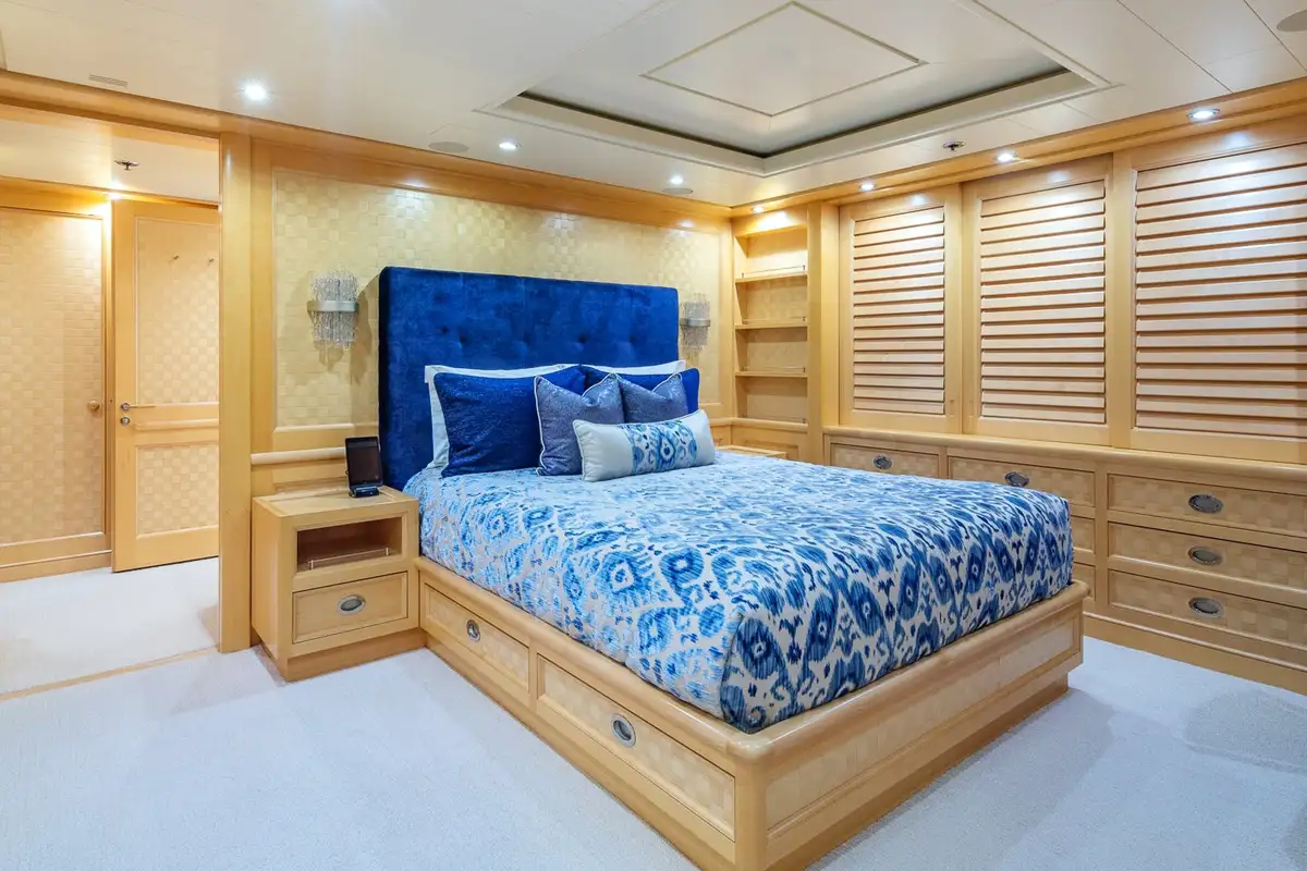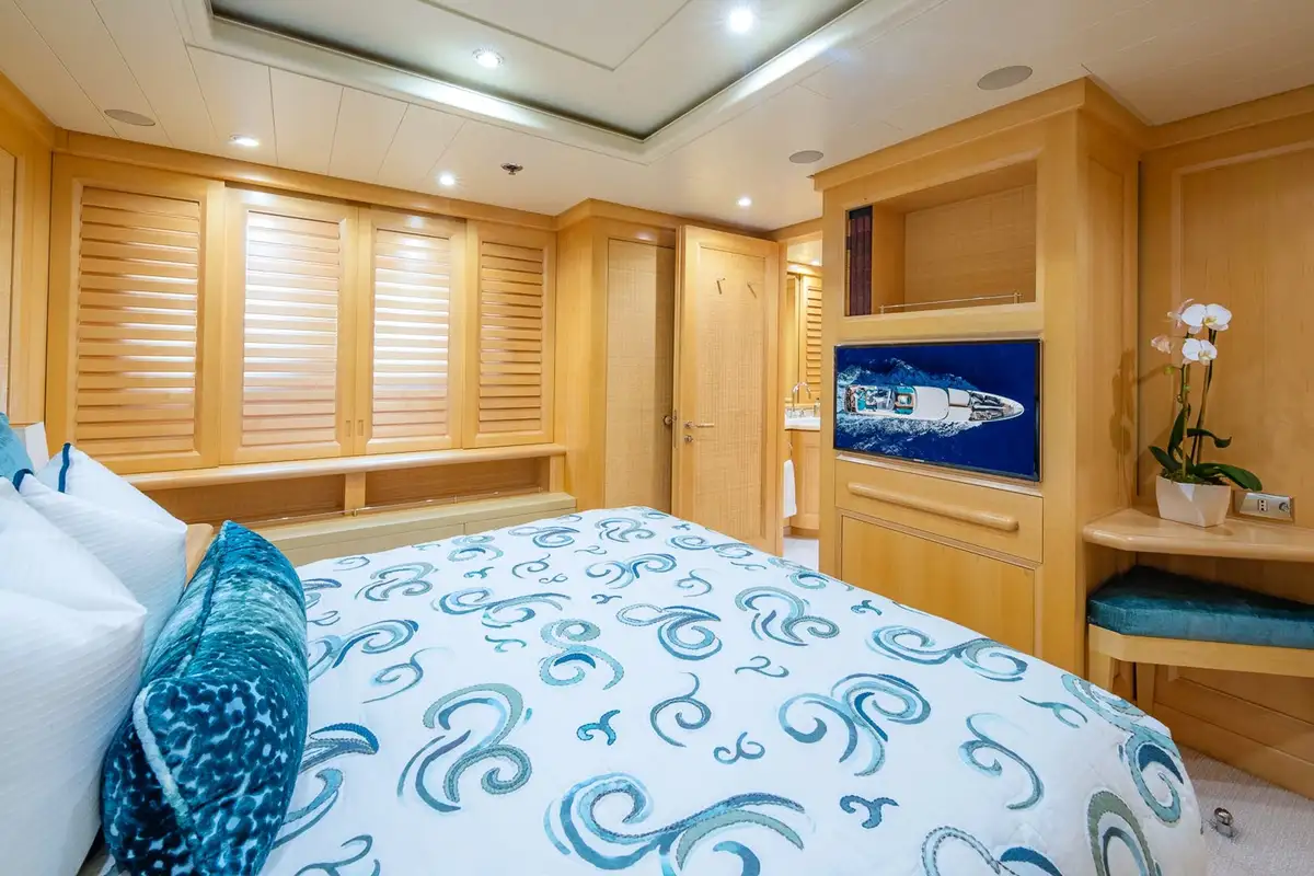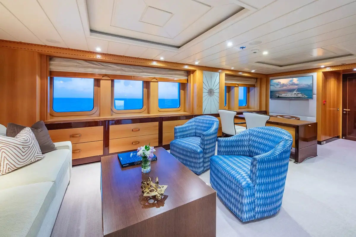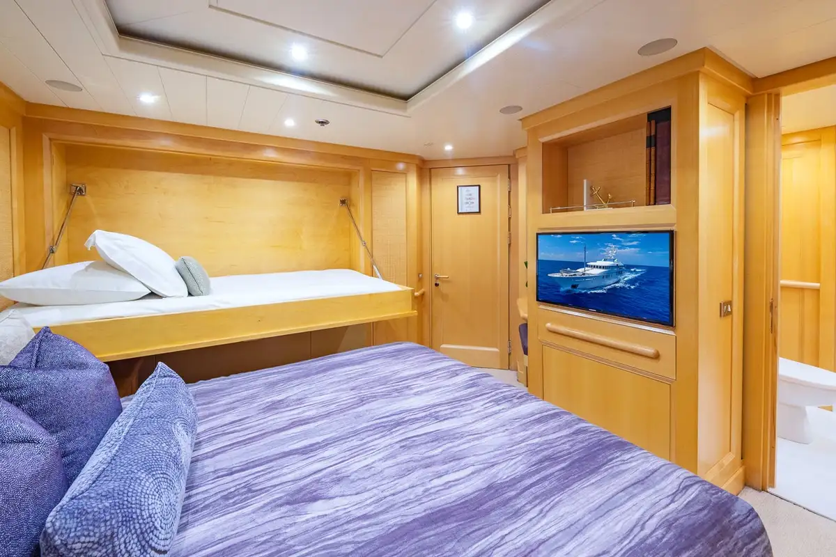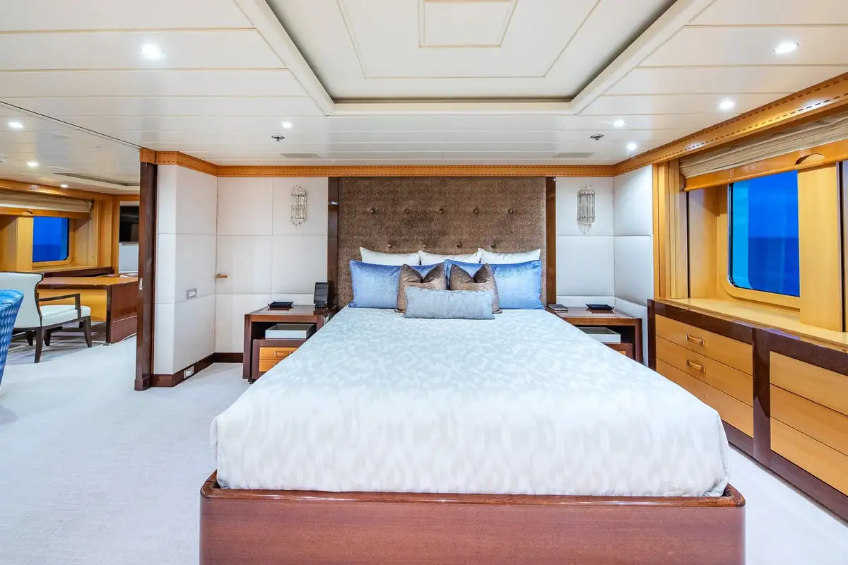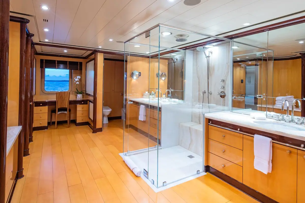 Her vast master cabin of approximately 1,000 sq. ft is a luxurious private sanctuary with an owner’s office located forward, a casual lounge area, ‘his and her’s’ en suite with a large shower in the centre. The entire master suite features large windows offering stunning views and plenty of natural light. Further accommodation comprises of four double cabins, all are spacious and equally as comfortable. There are two pullman bunks so that her total accommodation is ideally suited for 10 adults and two small children.