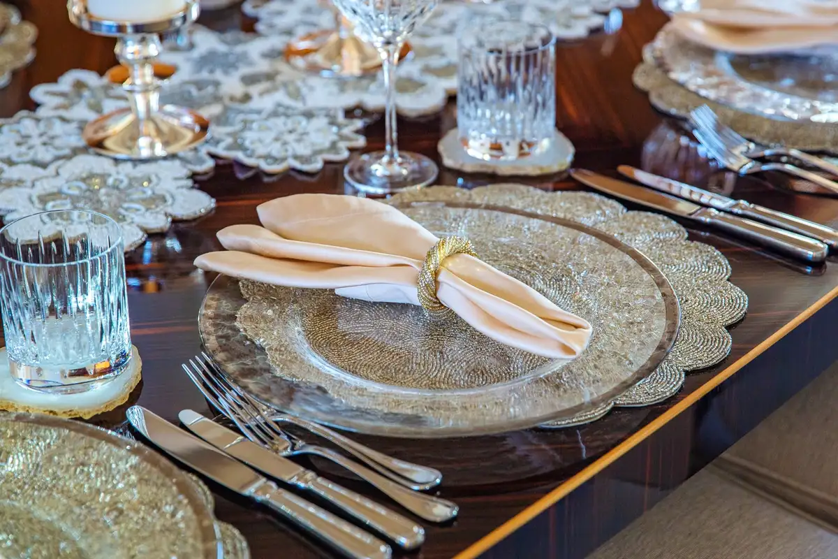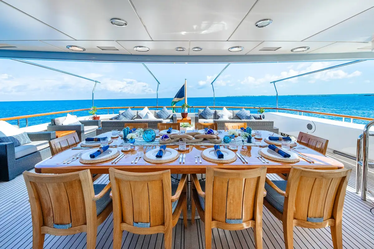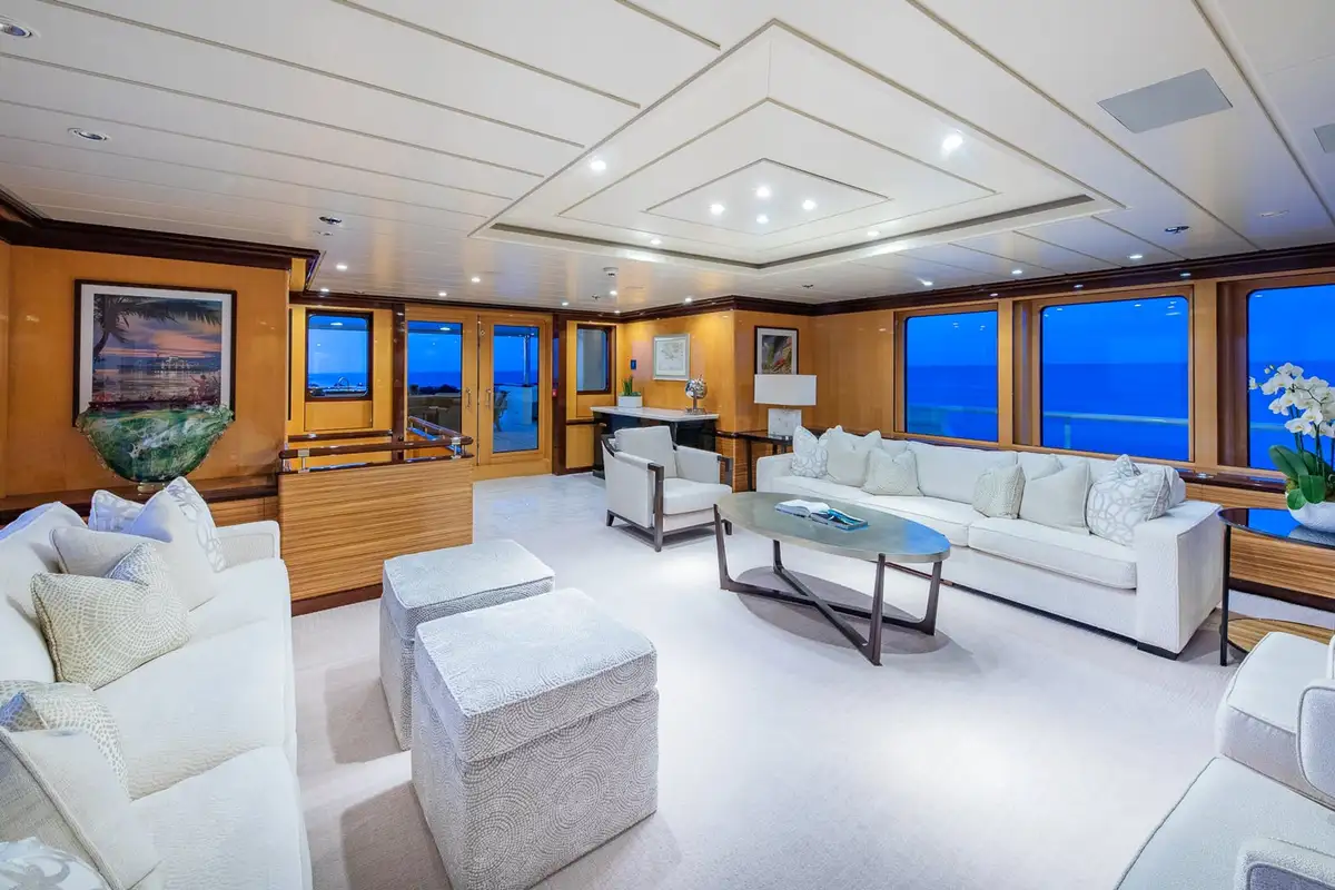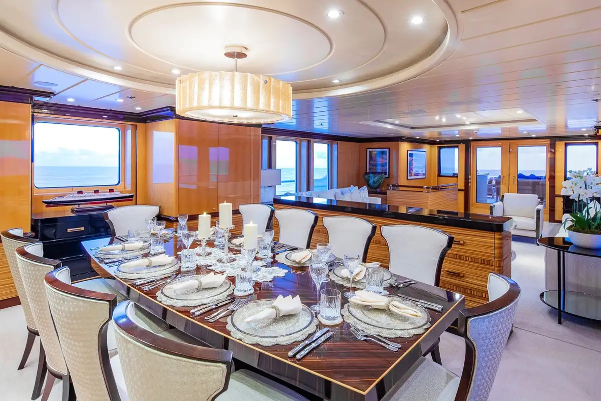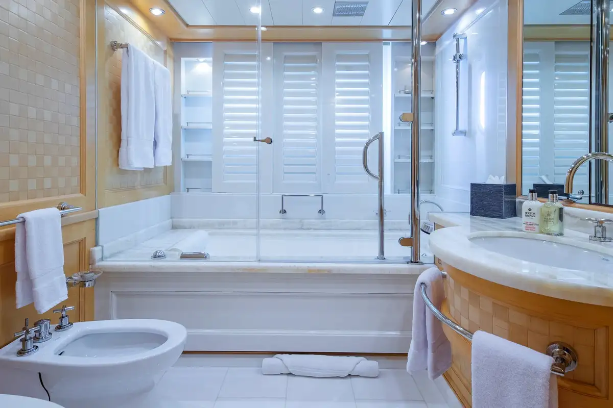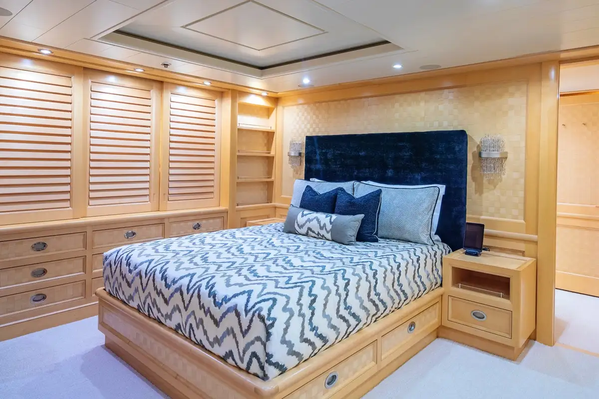 Her vast master cabin of approximately 1,000 sq. ft is a luxurious private sanctuary with an owner’s office located forward, a casual lounge area, ‘his and her’s’ en suite with a large shower in the centre. The entire master suite features large windows offering stunning views and plenty of natural light. Further accommodation comprises of four double cabins, all are spacious and equally as comfortable. There are two pullman bunks so that her total accommodation is ideally suited for 10 adults and two small children.