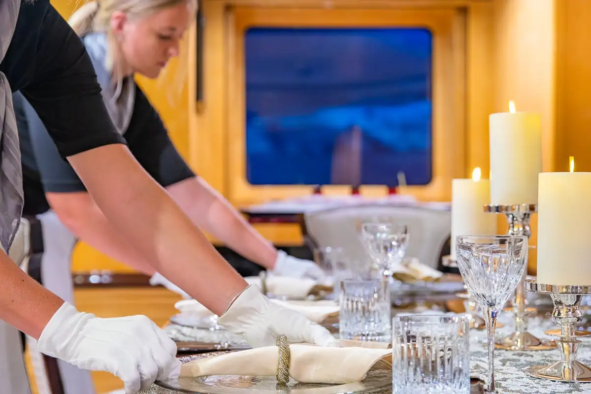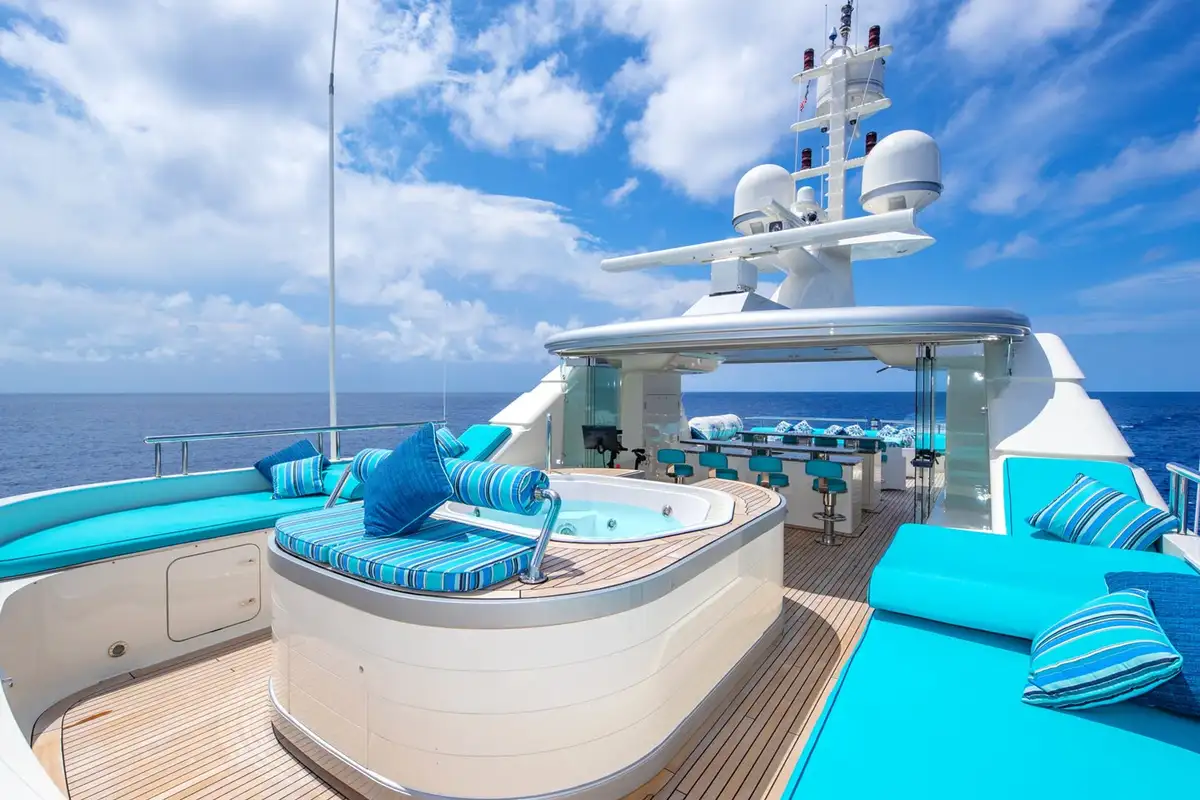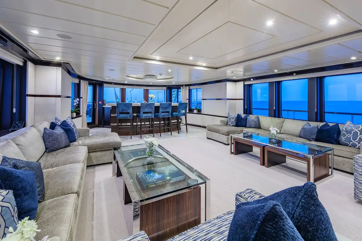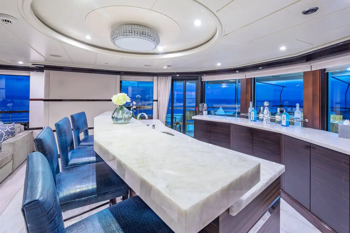 Également disponible à la venteWith 13 crew members, guests can rest assured that they will receive an excellent level of service and attention to detail. Furthermore, her captain is highly experienced and is very well regarded in the industry. The main salon features traditional décor across ample lounge areas, a pop-up 42 inch TV with surround sound and a formal dining are for up to 10 guests. The main deck also offers a social seating area and cocktail area with full bar. The sky lounge is a another fantastic entertainment area with further seating and a great cinema screen for ‘movie nights’.