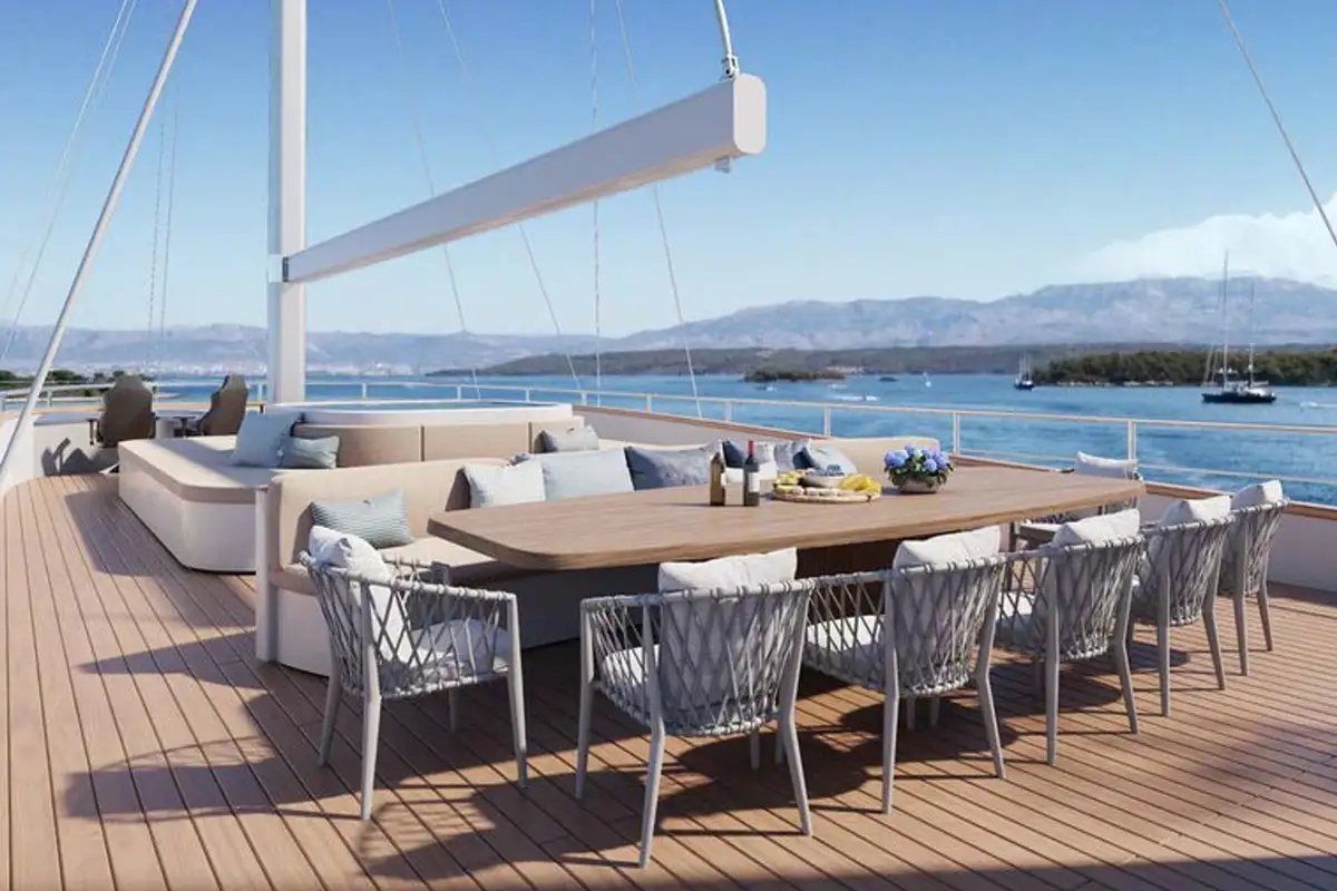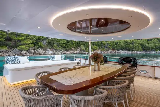 The outdoor spaces on this boat are designed as socializing and enjoying areas. On the main deck is an outdoor dining area for al fresco dining. The flybridge has a sundeck with a jacuzzi surrounded by mattresses and sofas and an additional seating table perfect for enjoying an evening party under the stars.