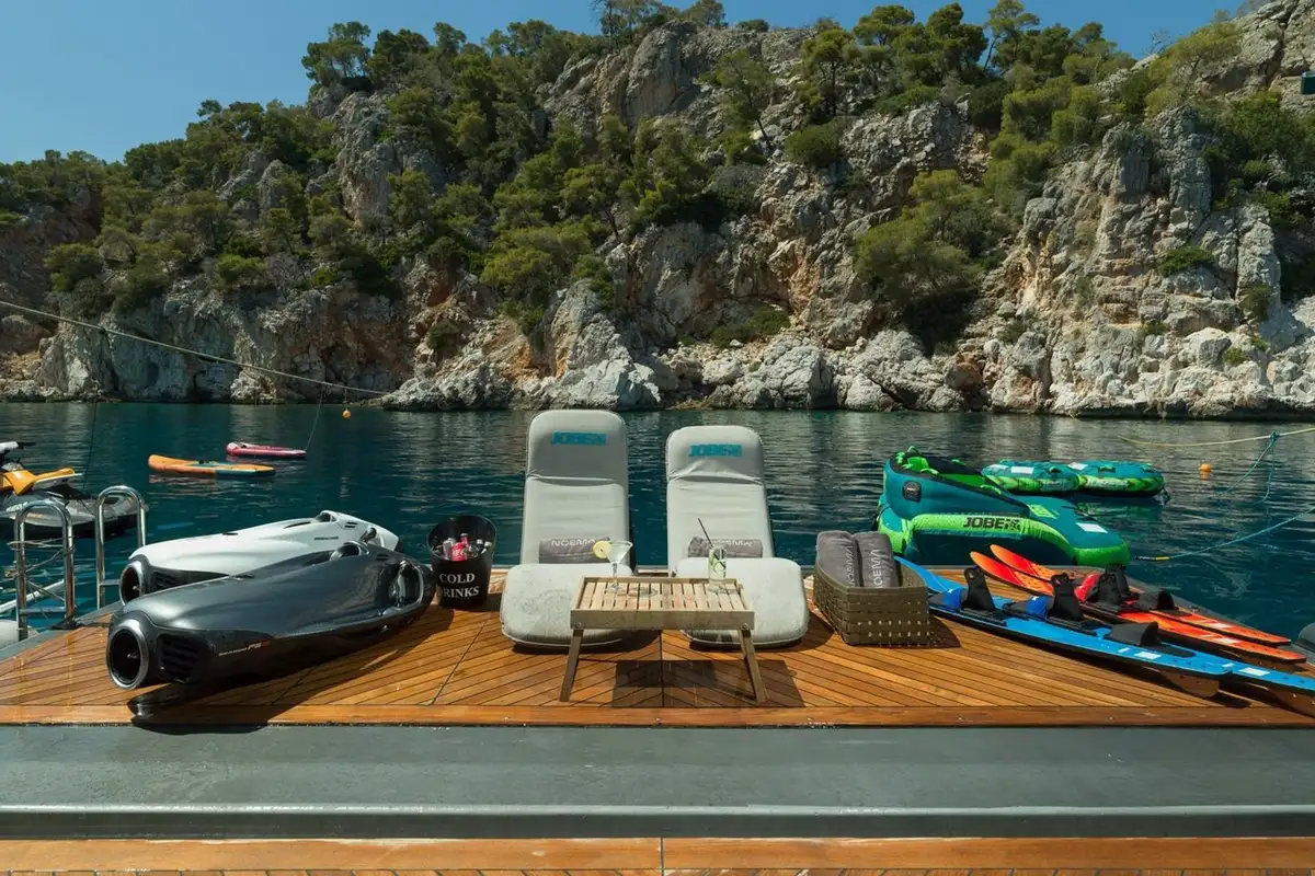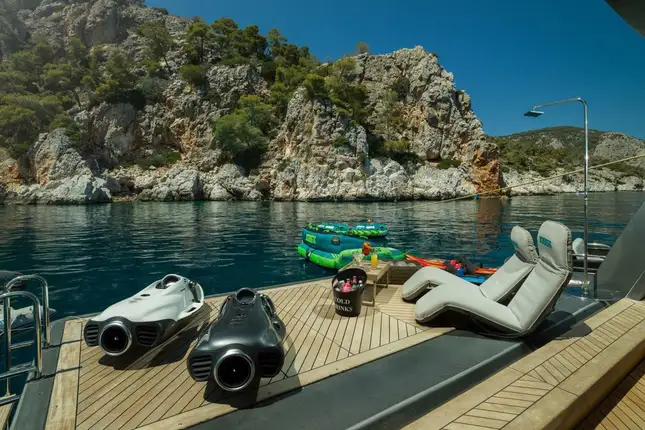 When it's time to get active, the fold-down transom creates a generous swim platform, giving easy access to the sea and NOEMA’s excellent selection of watertoys. These include a 4.35m AB Jet tender, Sea-Doo, Spark jetski, a Radinn jet surfboard, two SeaBobs, SUPs, waterskis for adults and children, a range of towable inflatables, plus snorkelling and fishing gear.