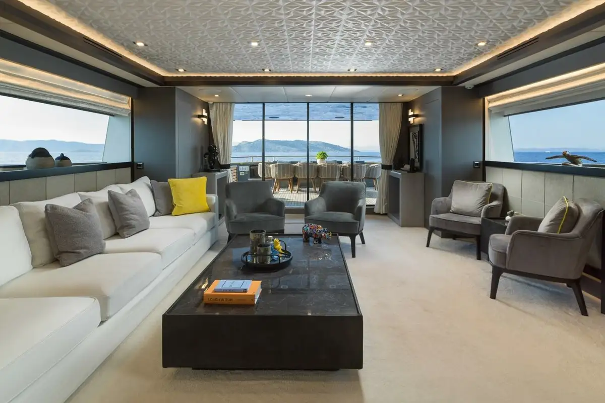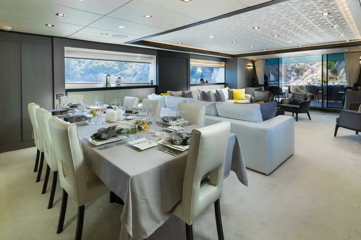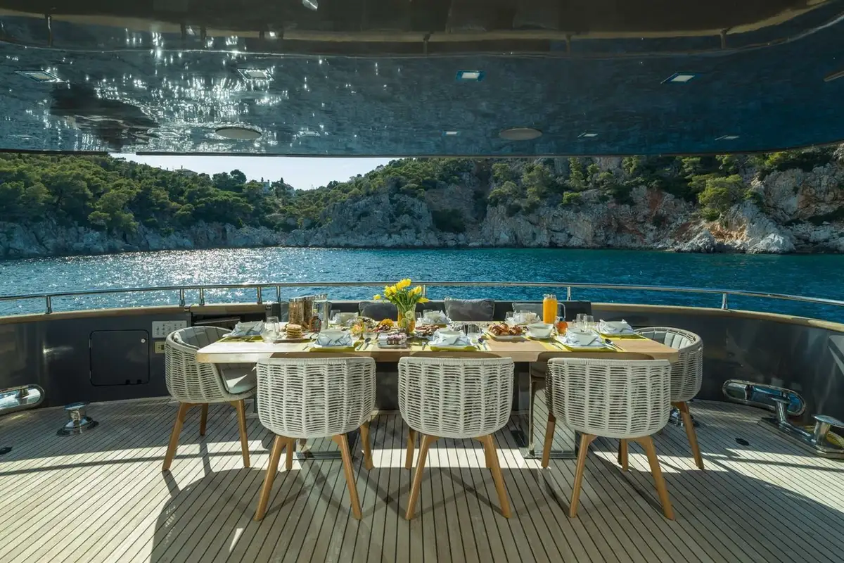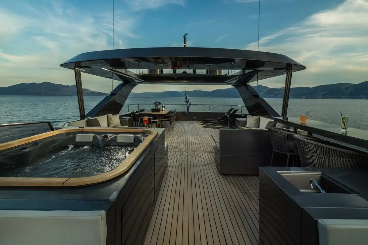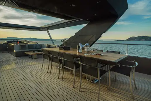 NOEMA’s outdoor spaces are designed for both entertaining and unwinding. The sundeck is a particular highlight, featuring a six-person jacuzzi, a bar area, a relaxed al fresco lounge space, and a shaded dining area. Whether you're hosting sunset drinks or enjoying a long, leisurely lunch. The sundeck is the social heart of the yacht and an irresistible draw.