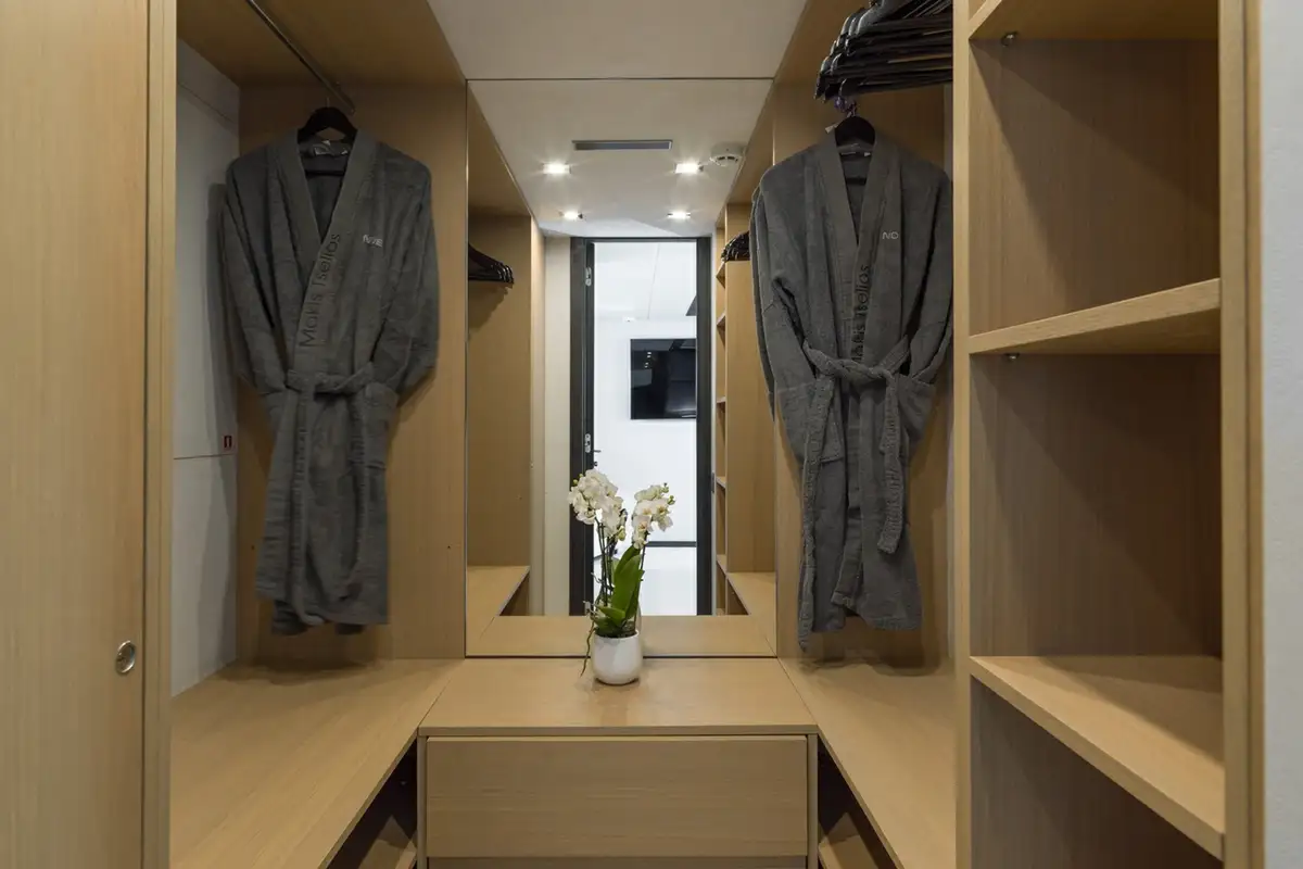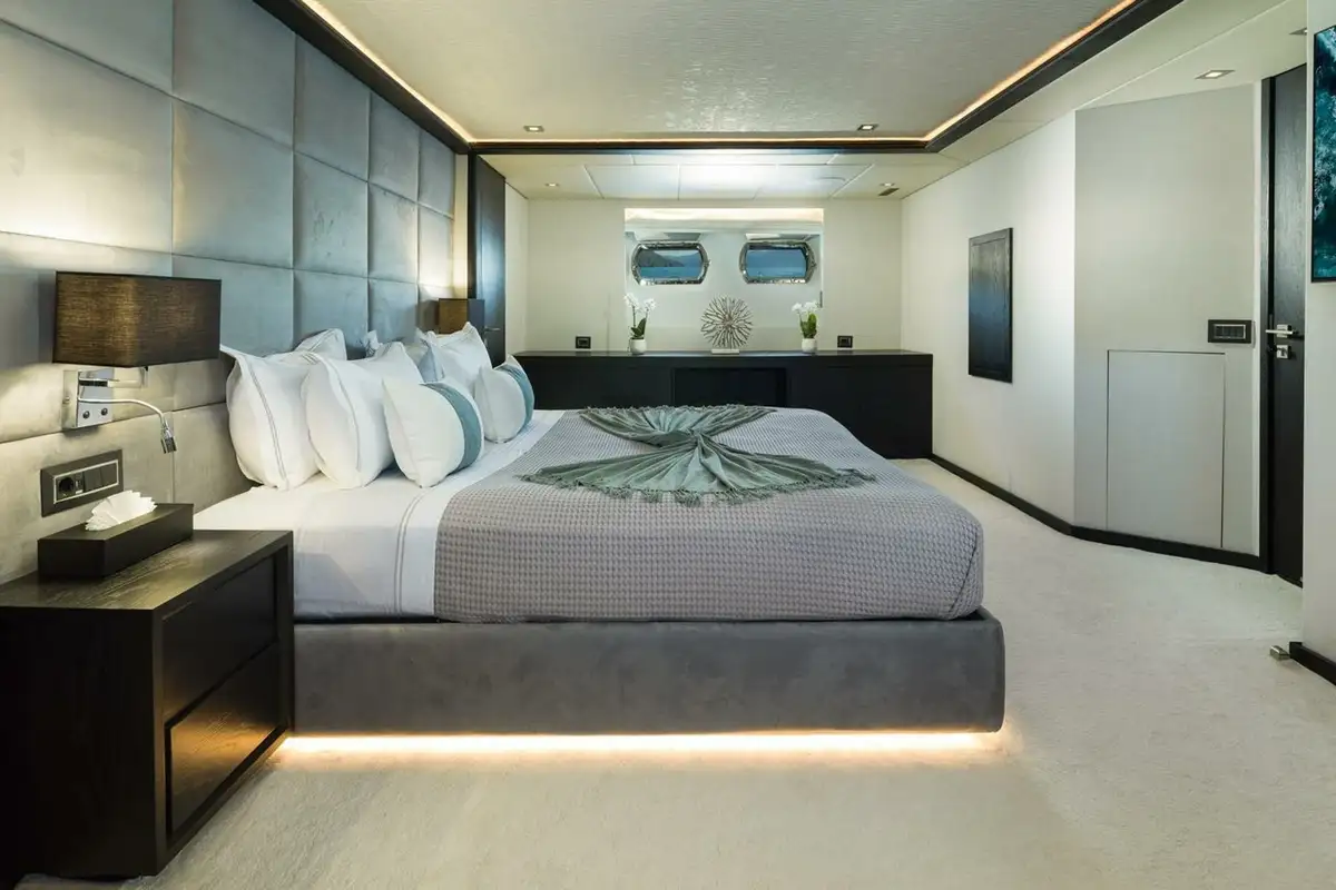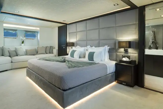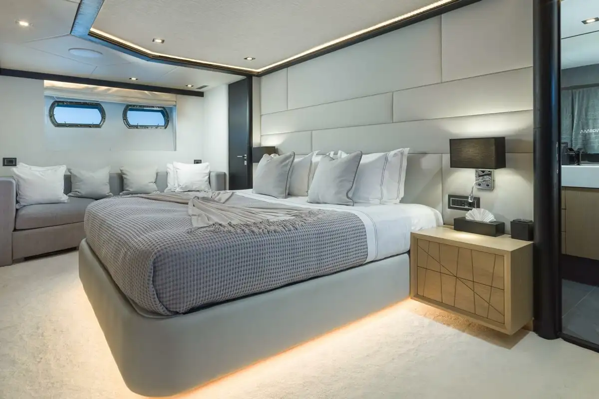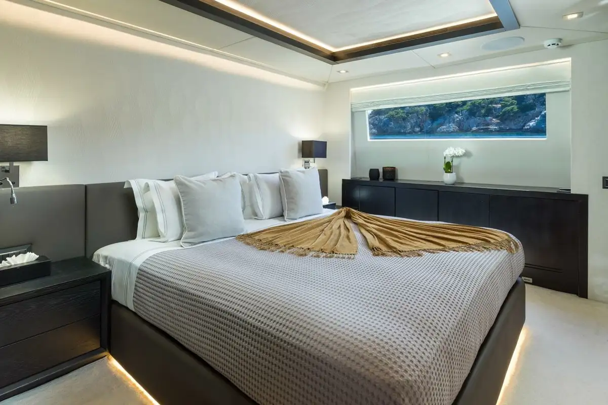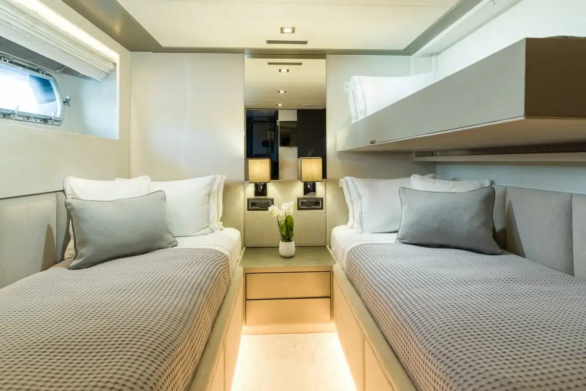 The full-beam master suite on the lower deck is a serene sanctuary, complete with a walk-in wardrobe and a generous en suite bathroom featuring his and hers sinks and a separate shower compartment. Also on this level is a spacious VIP double cabin and a versatile twin/double-berth guest suite with pullman beds; ideal for families or a range of guests.