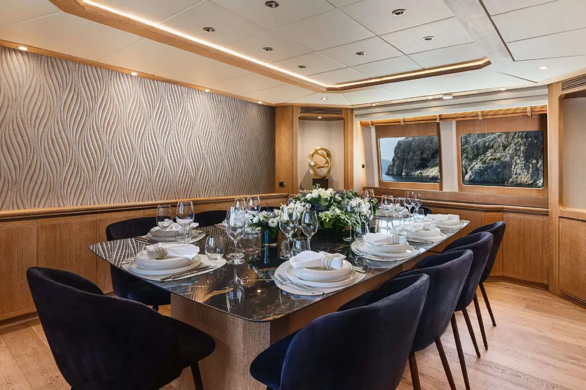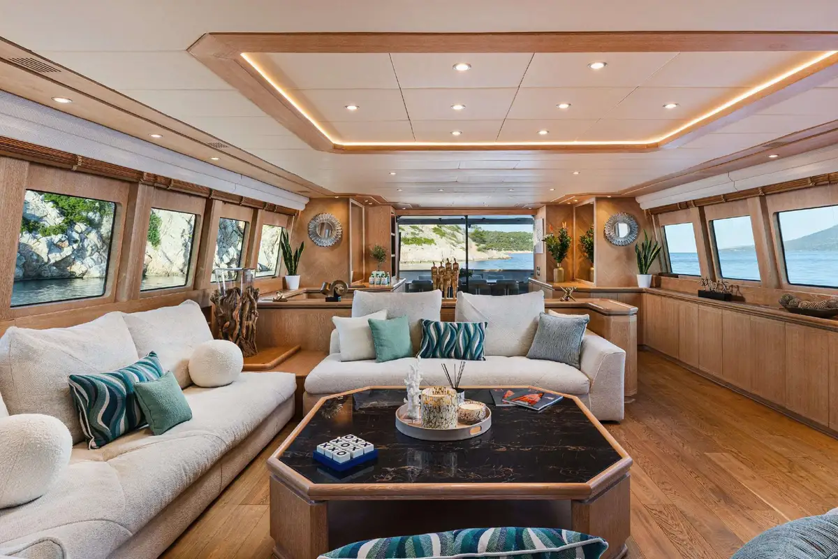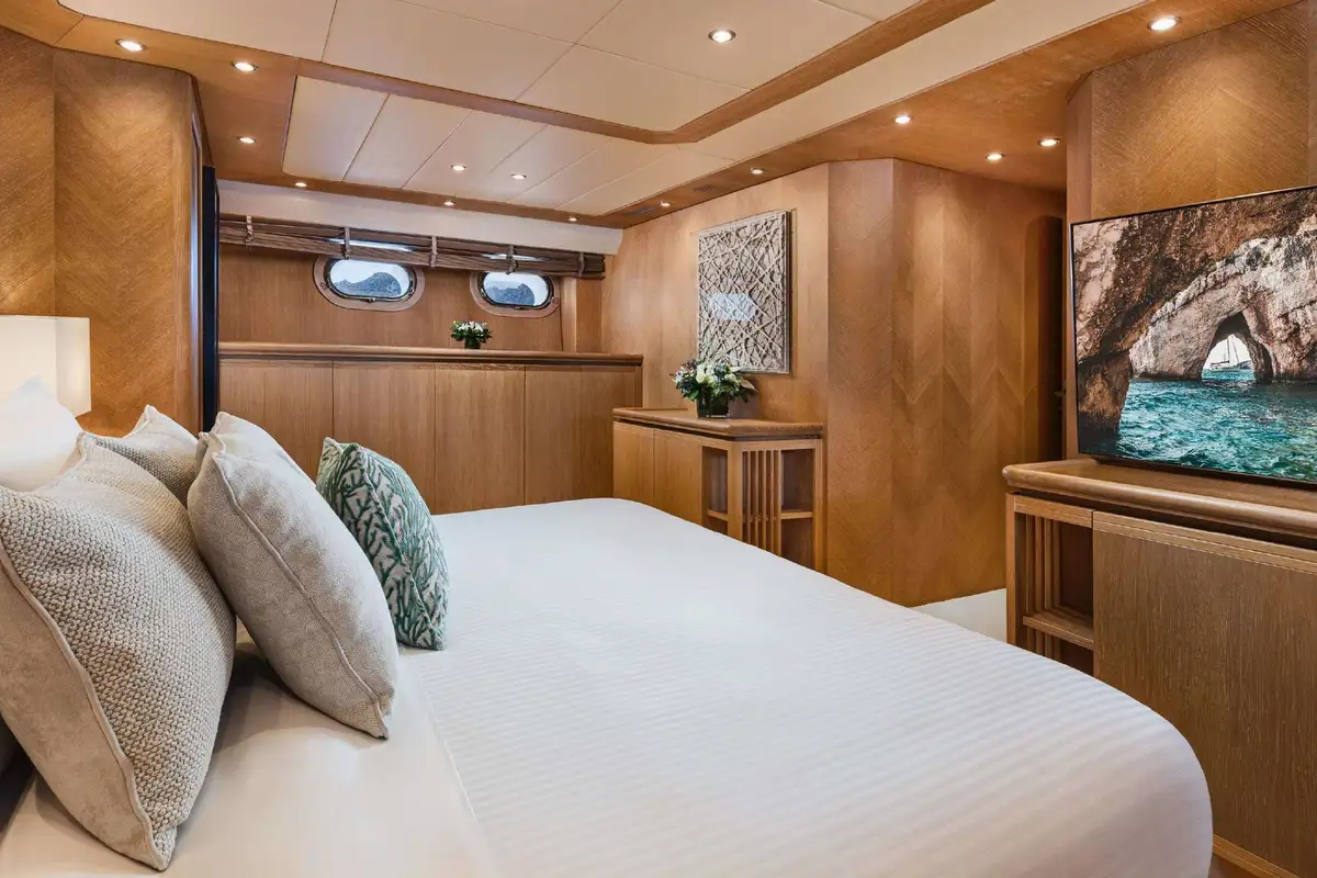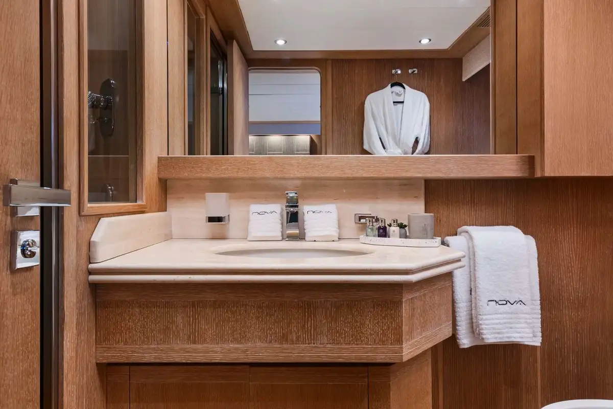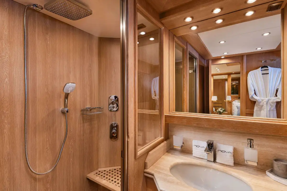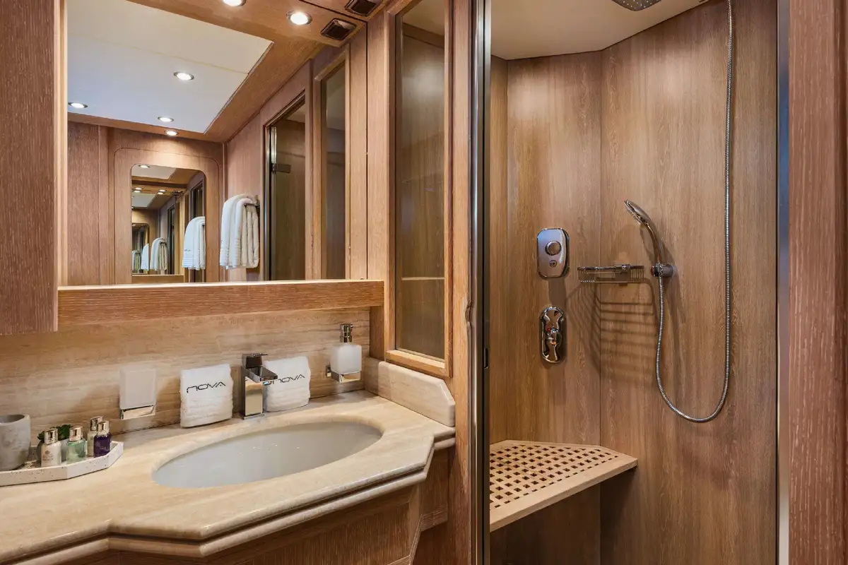 Inside, NOVA’s sophisticated design creates a calm, welcoming ambiance. Her five well-appointed cabins include three doubles and two twins, with two additional pullman berths to suit families or groups of friends. Each cabin offers generous space and en suite facilities, providing a private sanctuary after days spent on the water.