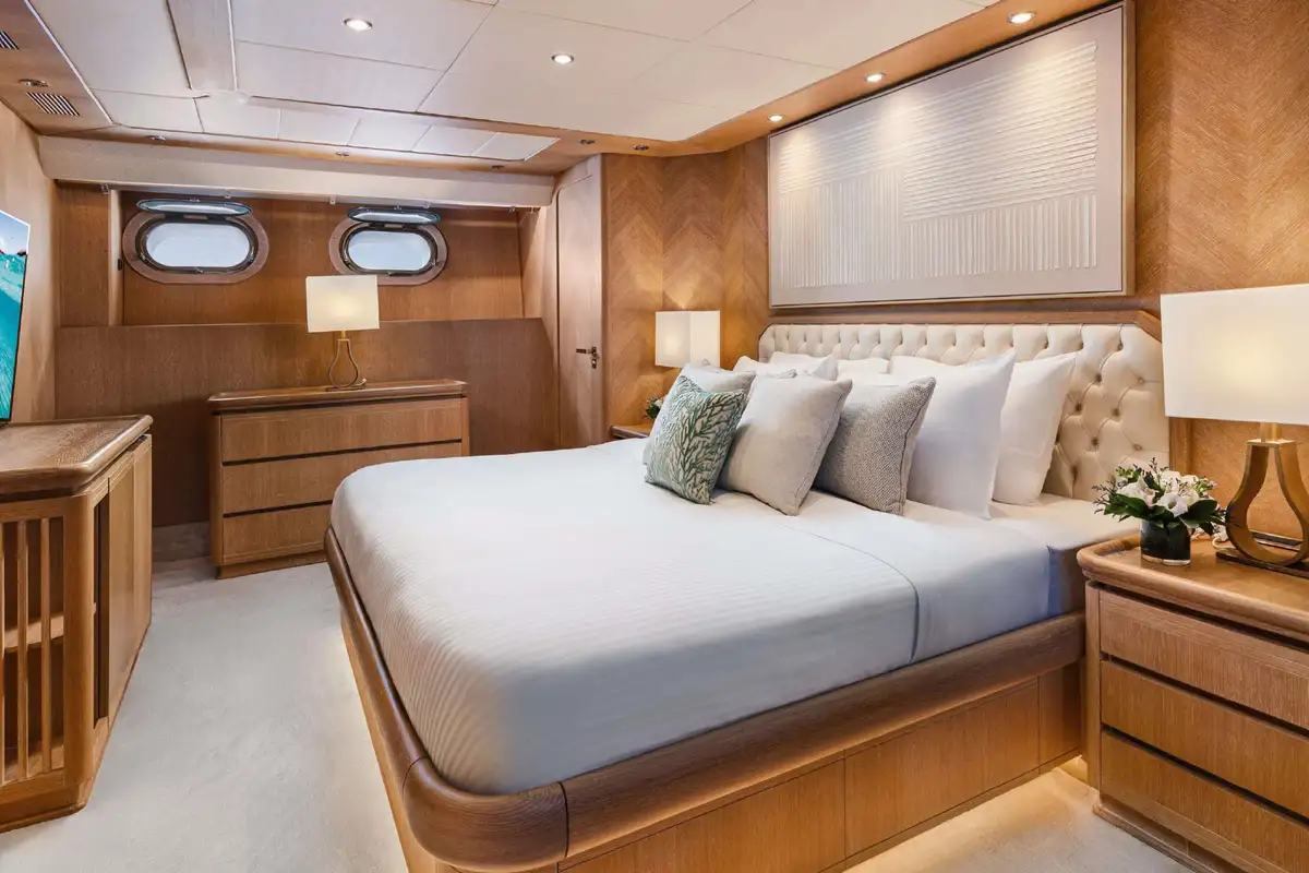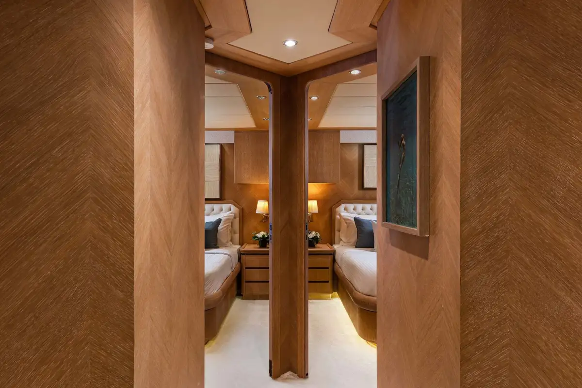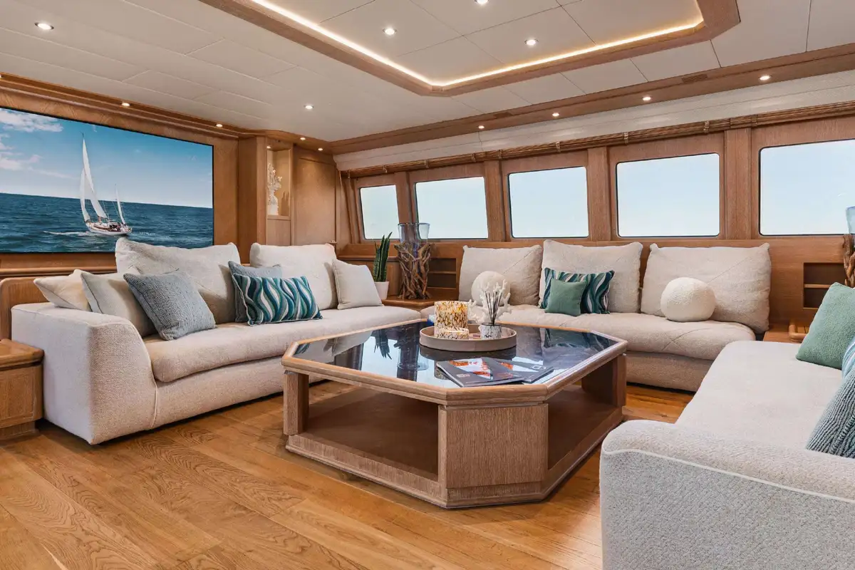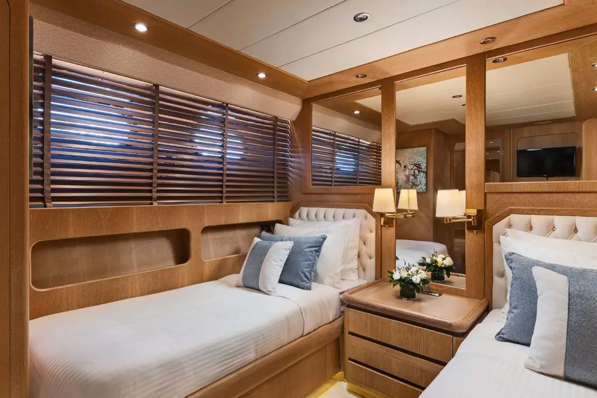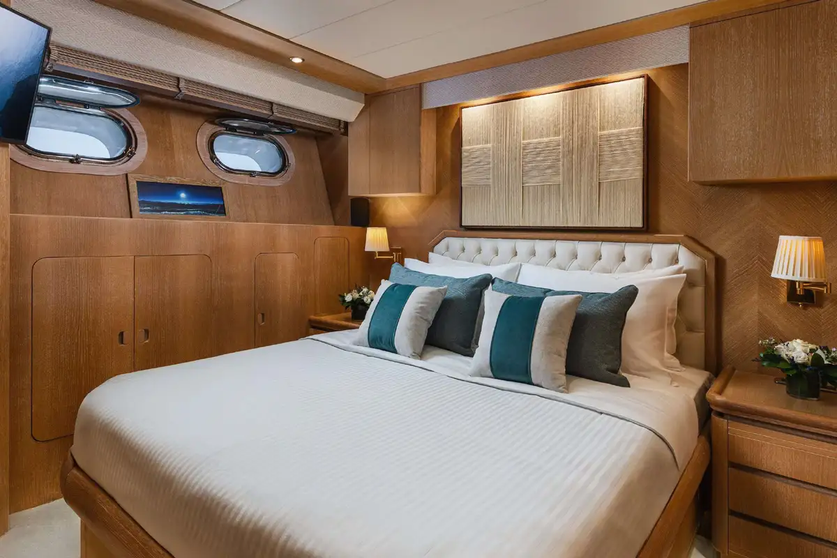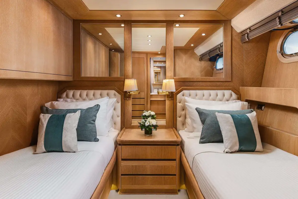 Inside, NOVA’s sophisticated design creates a calm, welcoming ambiance. Her five well-appointed cabins include three doubles and two twins, with two additional pullman berths to suit families or groups of friends. Each cabin offers generous space and en suite facilities, providing a private sanctuary after days spent on the water.