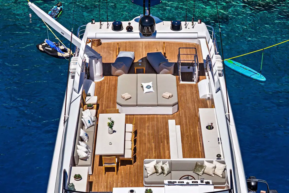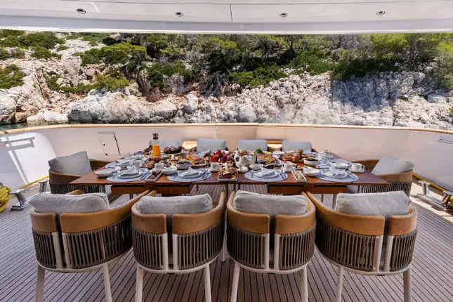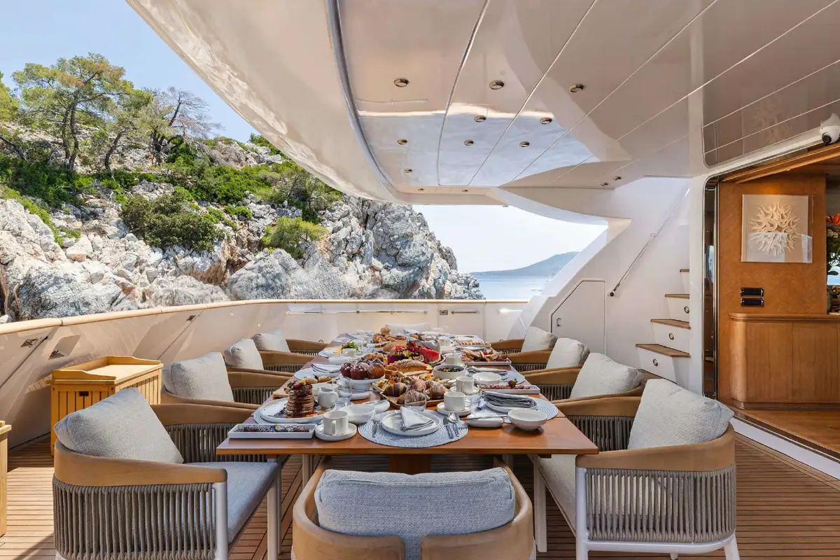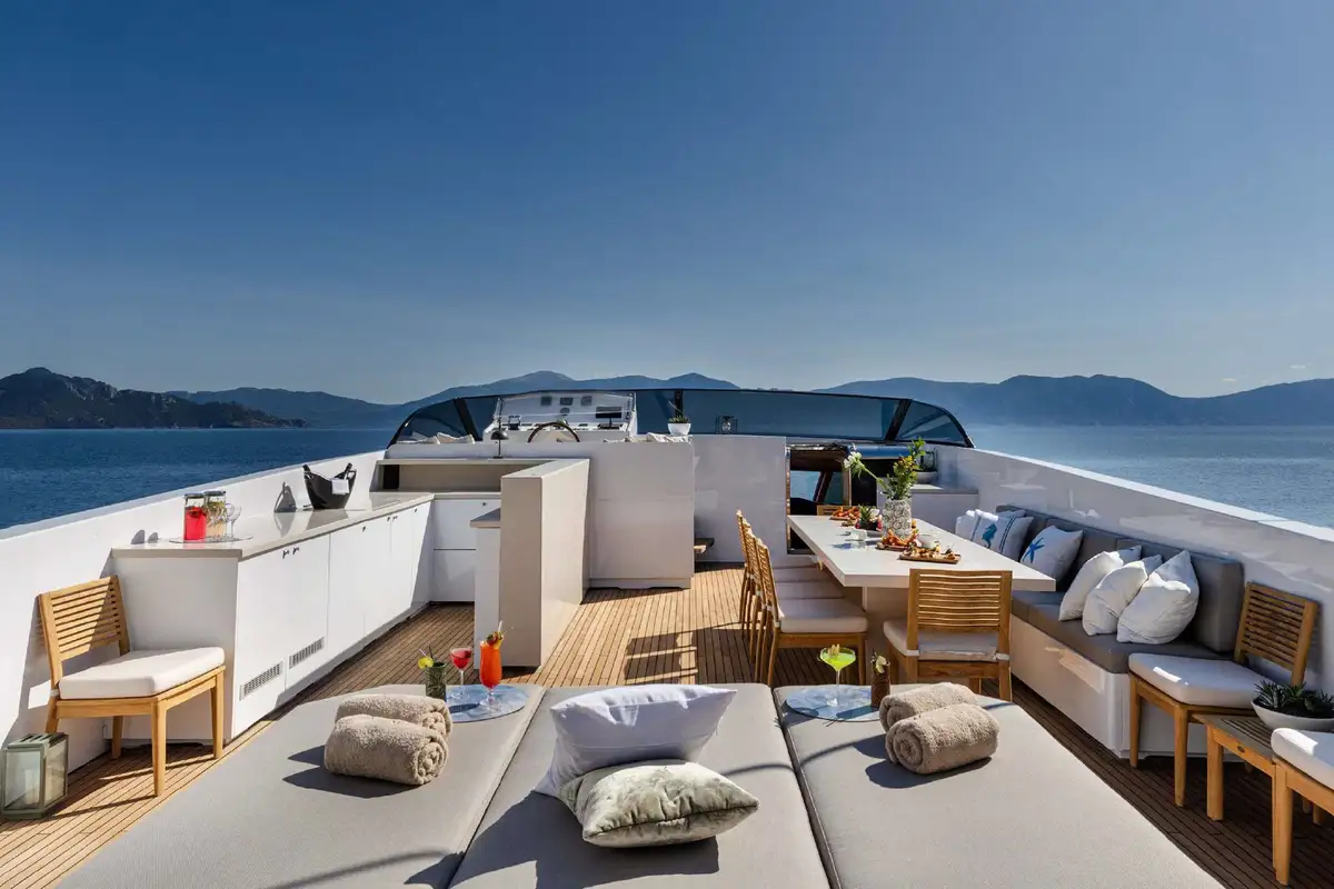 On deck, NOVA invites outdoor living at its best. Start your day on the sun deck, where sun pads, a bar, and al fresco dining create a relaxed yet refined atmosphere for soaking up the sun or enjoying cocktails at golden hour. The main deck aft offers a formal al fresco dining area – ideal for lingering meals with panoramic sea views.