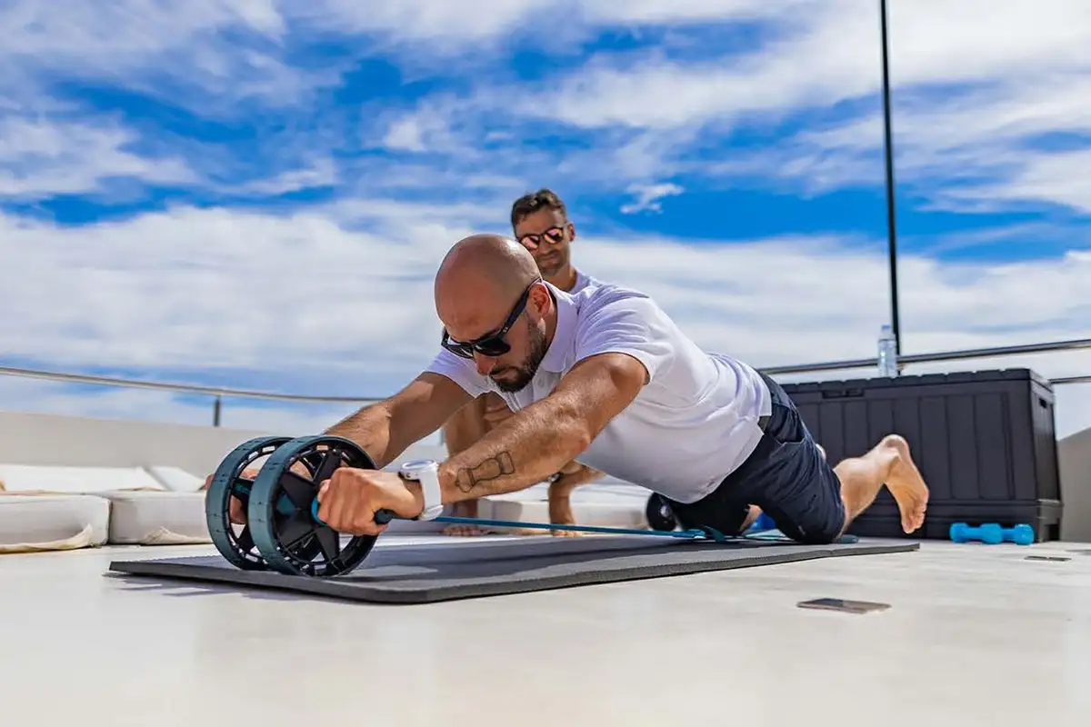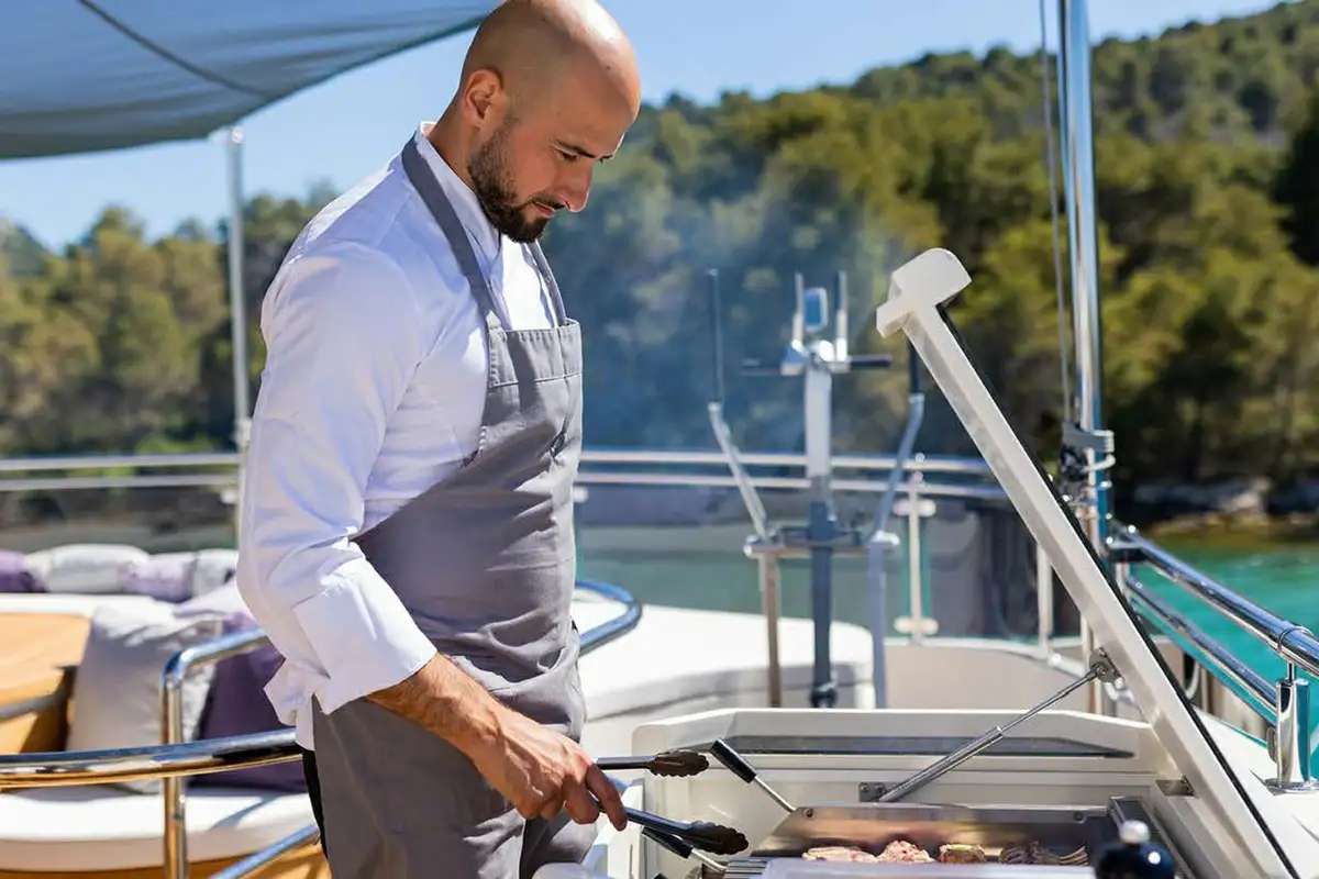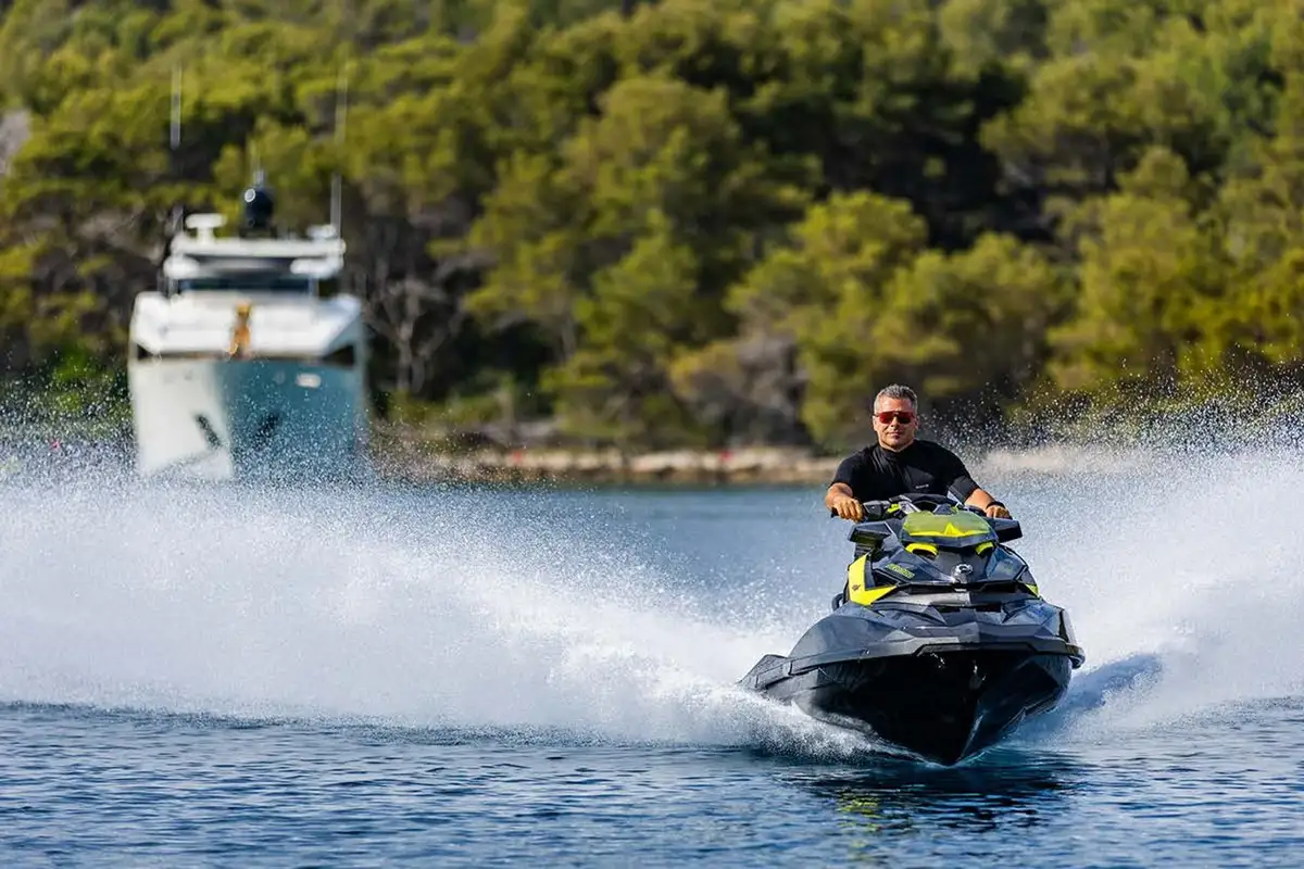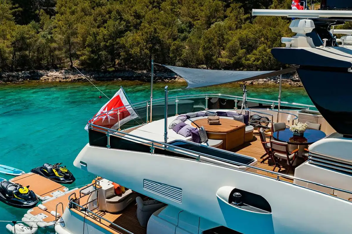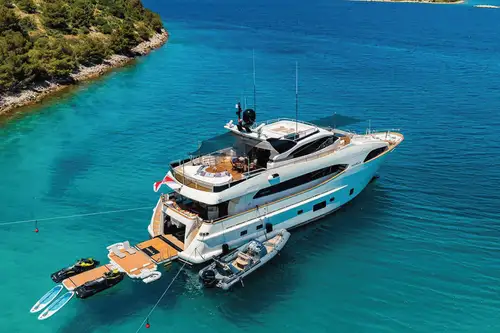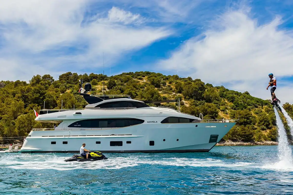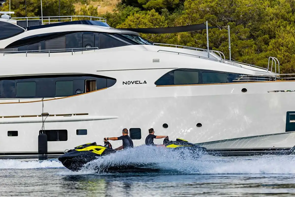 Perfect for those looking to make the most of their surroundings, Novela’s outdoor spaces are as generous as those indoors. The main aft deck features an al fresco dining set up and easy access down to the swimming platform. Moving up a deck, the skylounge connects directly with the stern flybridge with another al fresco dining set up and electric sun awning. A barbeque, crosstrainer and sunbathing space finish the picture. More seating is located on the bow, with large sunpads, and yet another outdoor space is a bonus sunpad area on the top deck! Her host of toys and tenders will make every charter even more unforgettable, with plenty of different water toys to enjoy.