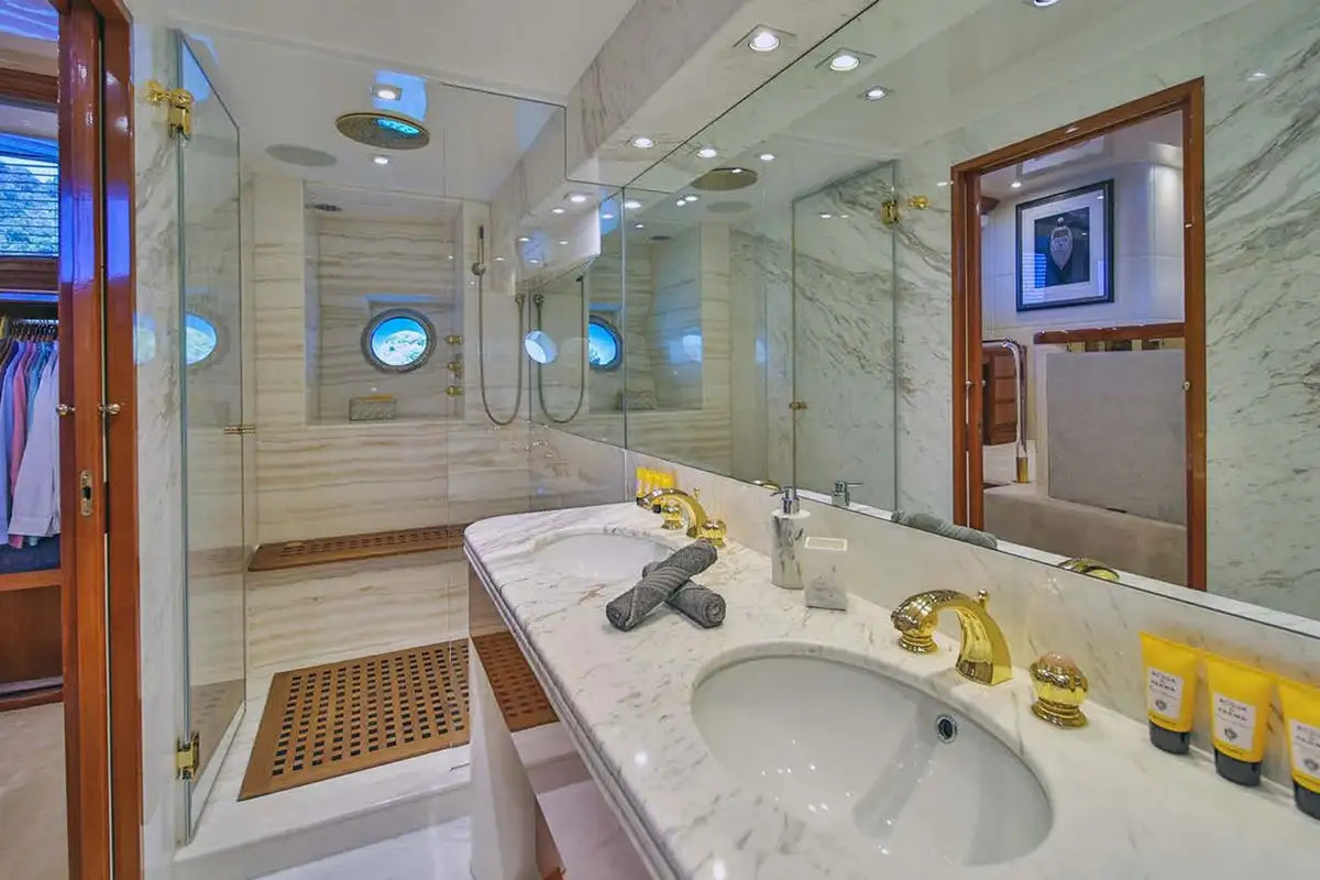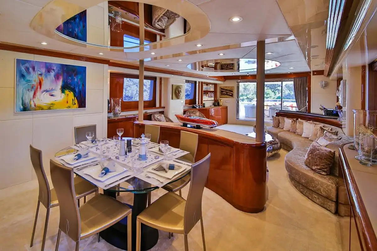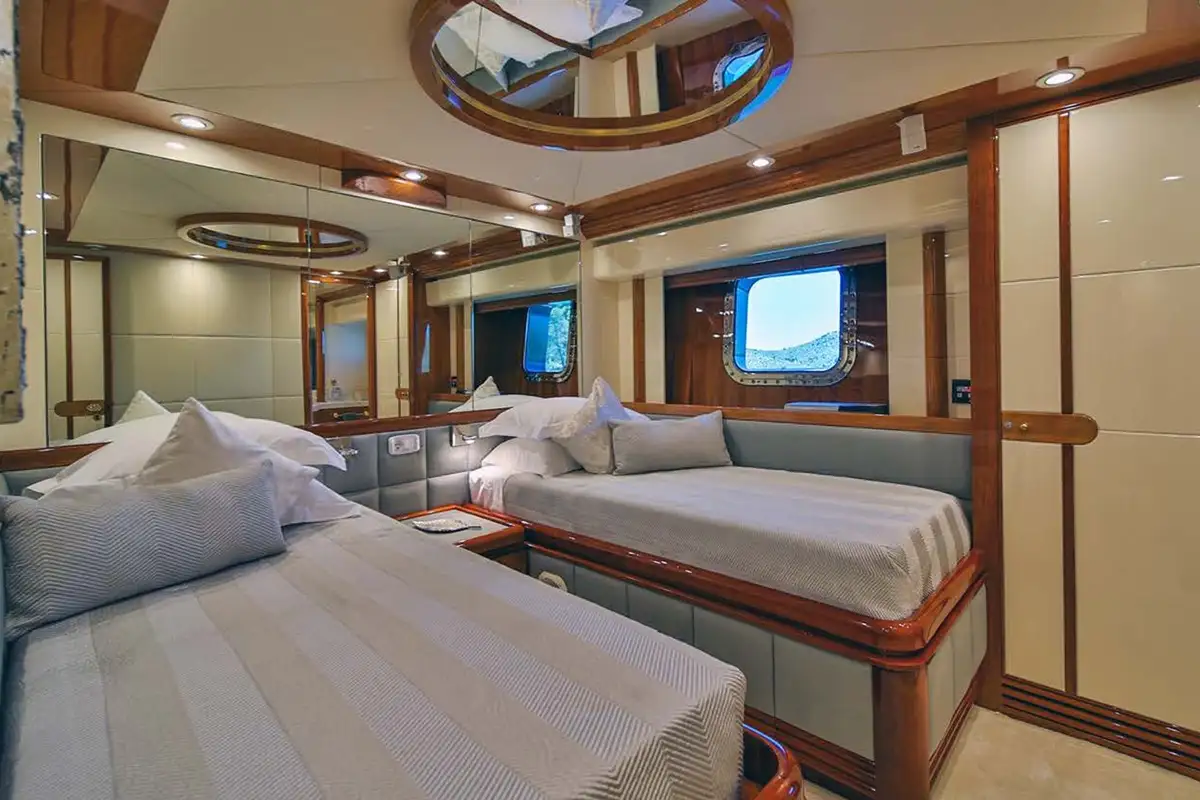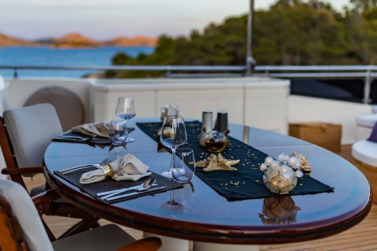 Able to welcome eight guests, Novela features four spacious cabins: the master, VIP and two twins which are able to convert to large doubles. The split level master is a particularly impressive space, with a private office and main cabin on one level and dressing room and ensuite down a level, all complemented by wide views across the water through oversized windows. Like the master, the VIP is also full beam and with beautiful views. All accommodation features modern entertainment systems and stylish décor. Her extremely versatile accommodation layout makes her perfect for two couples, families, or any other charter group.