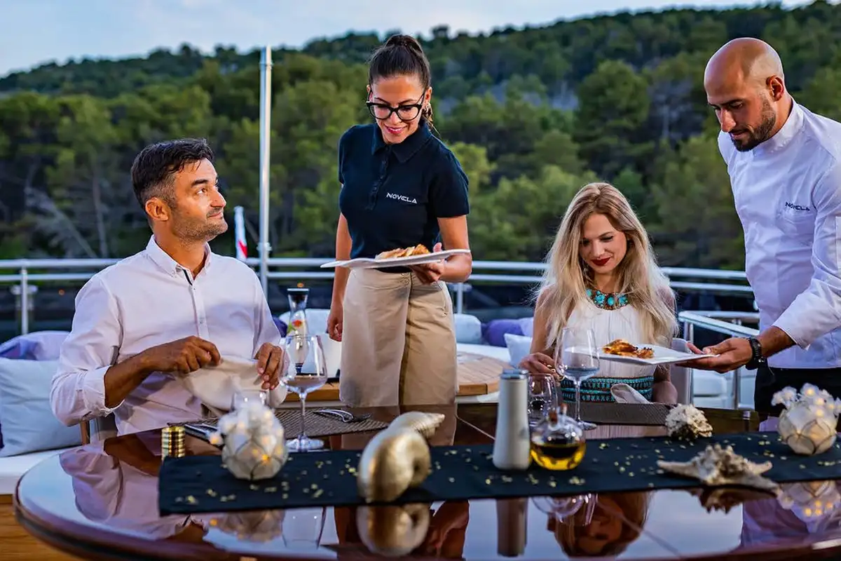 Communal guest spaces include the large, light-filled main saloon, with casual seating, a cocktail bar and entertainment system. A formal dining is perfect for enjoying sumptuous meals prepared by Novela’s talented chef. The upper deck is home to the pilothouse and skylounge. The skylounge has relaxed L-shaped seating, a state of the art entertainment system and large hidden LED TV – guests can relax and reflect as they soak in the sunset or watch videos of the day’s activities.
