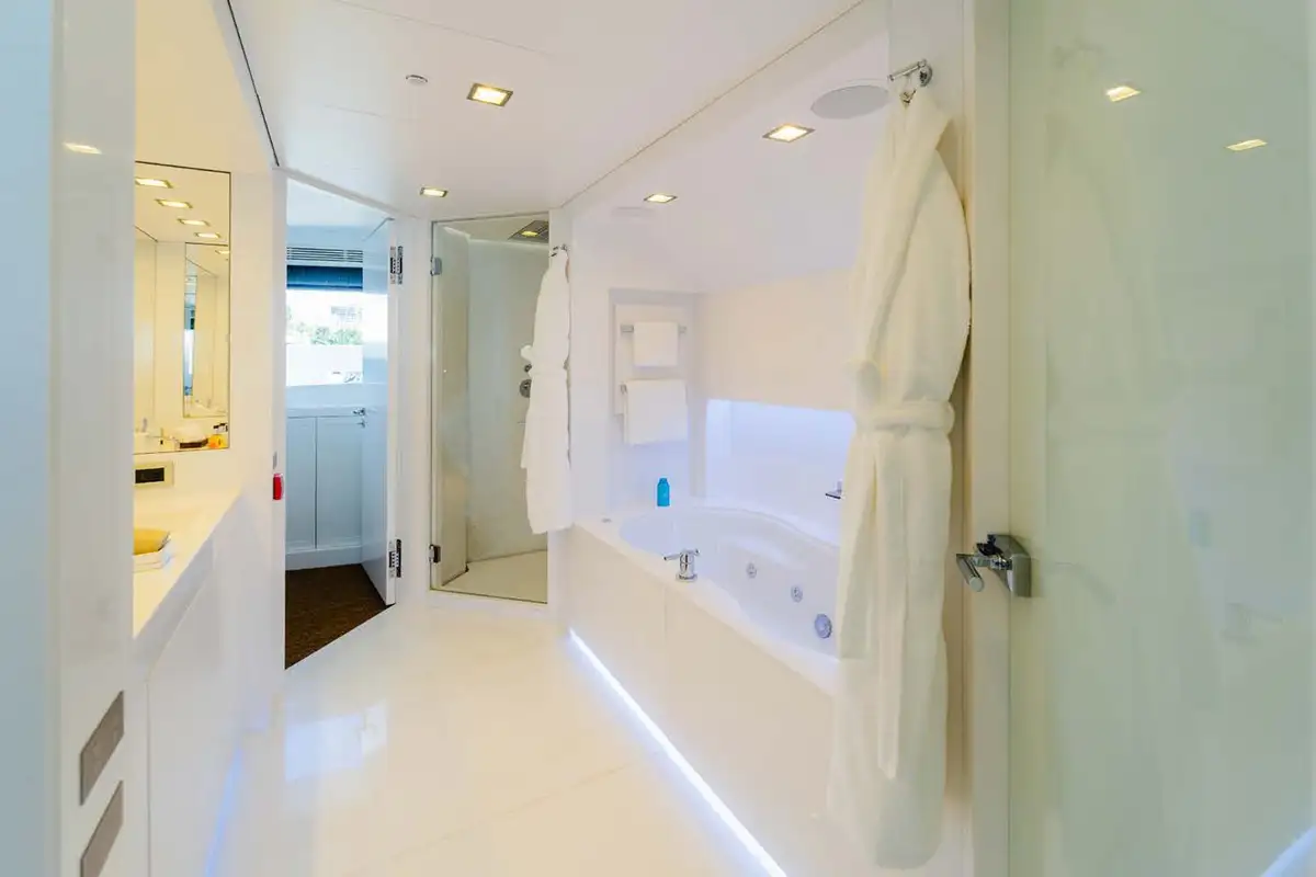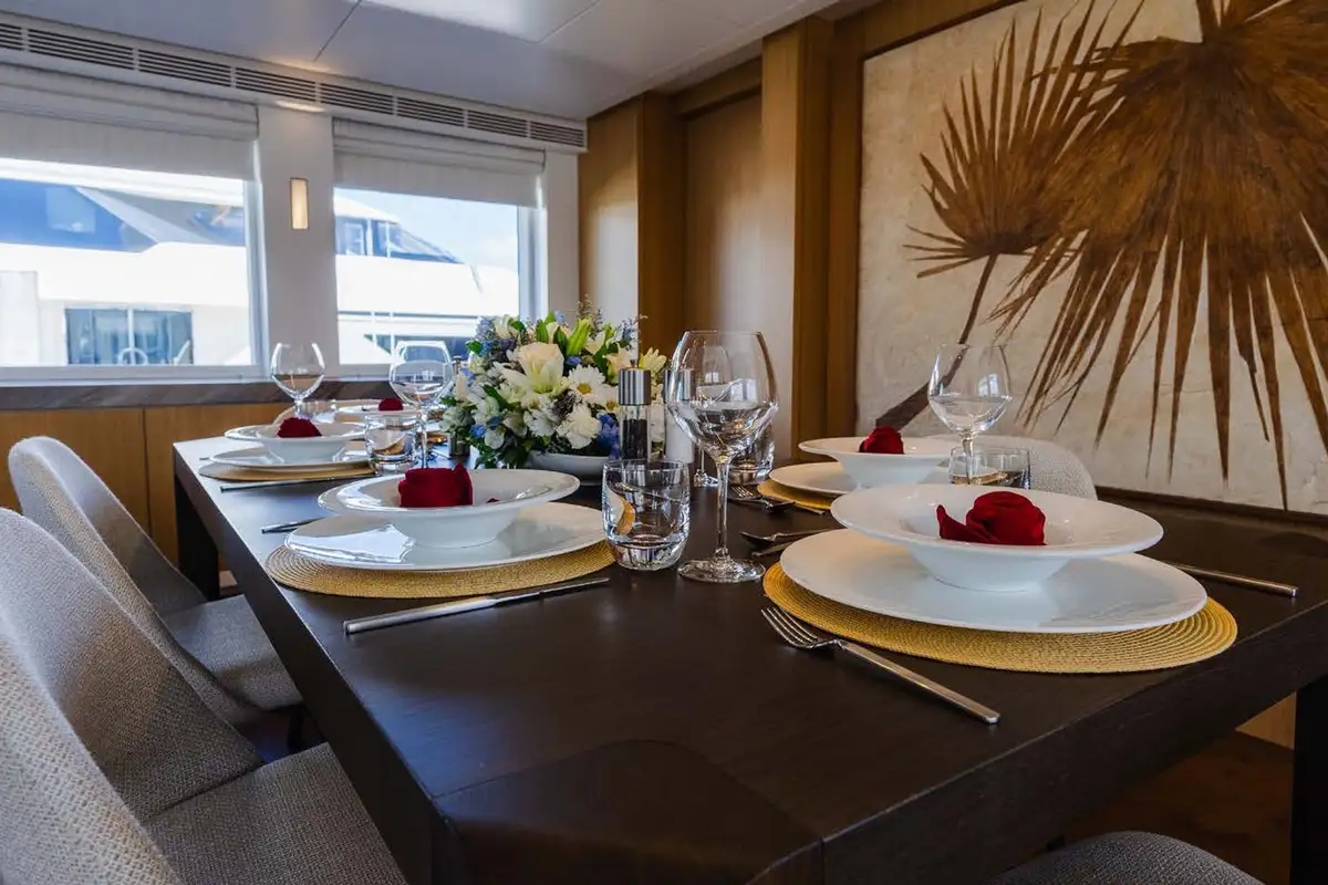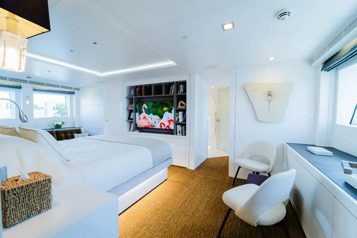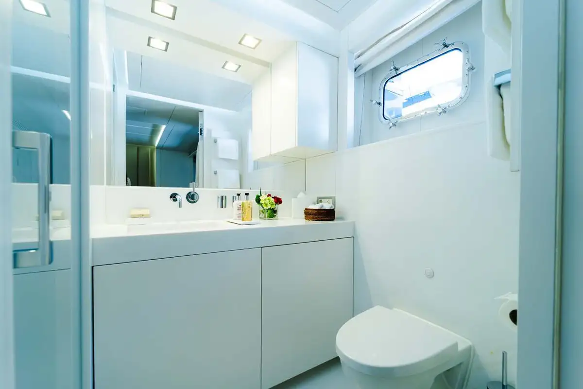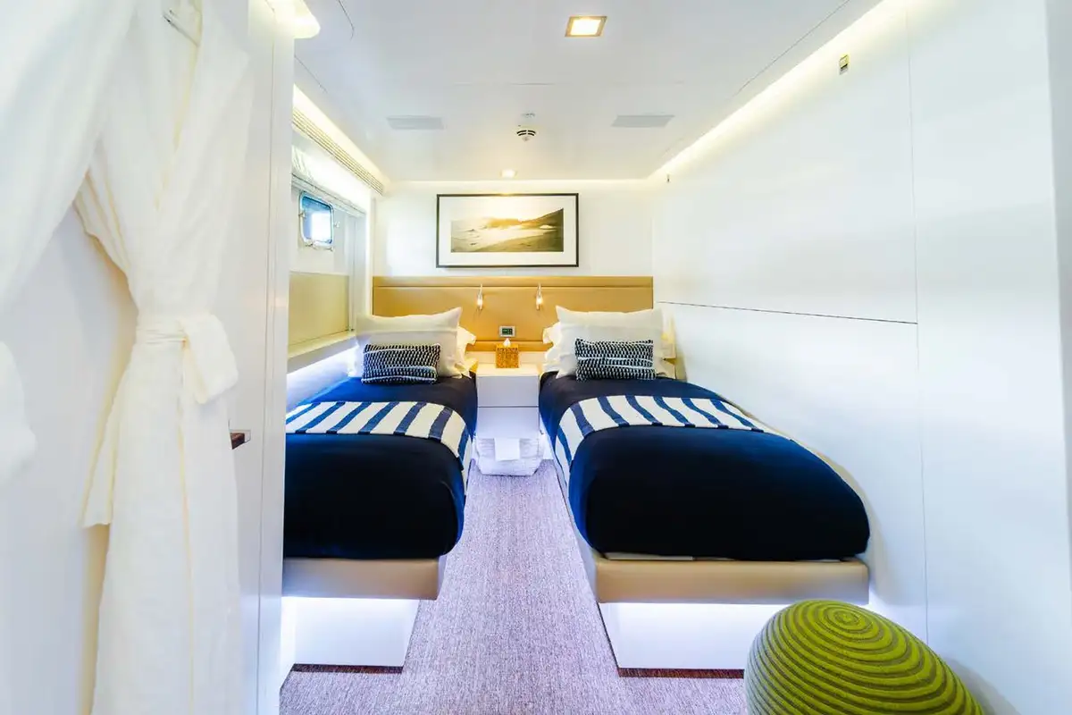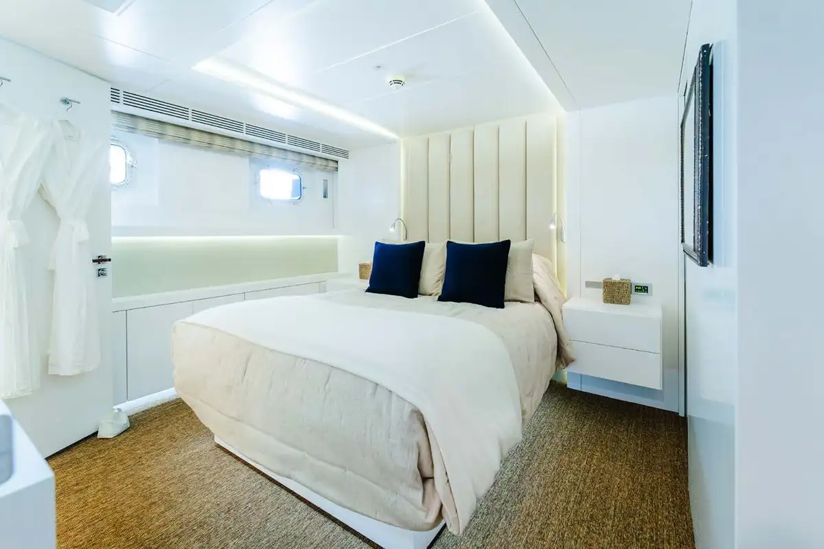 She accommodates 12 guests in five cabins including a full beam master suite on the main deck while below are two VIP suites and two twins, each with an extra Pullman bed, all with entertainment systems and full en suite bathroom facilities.