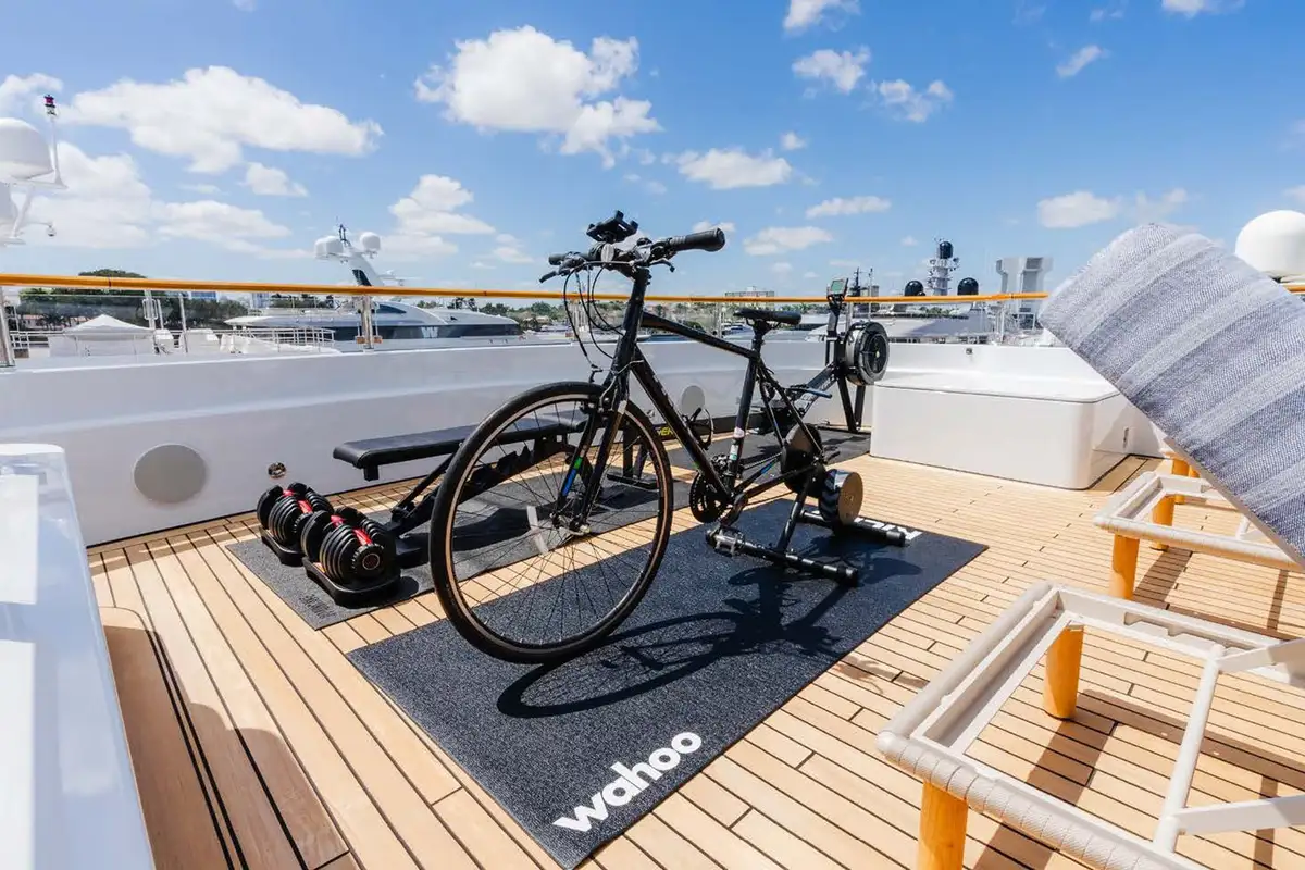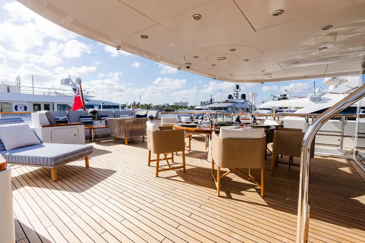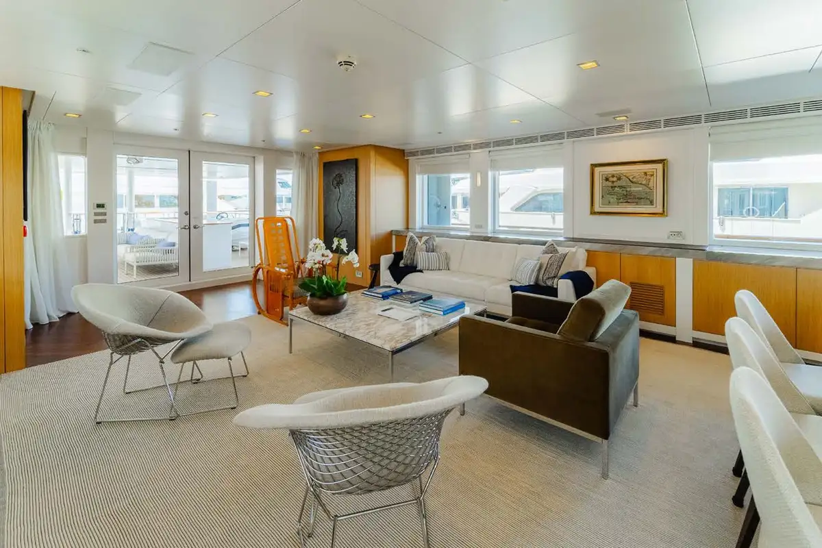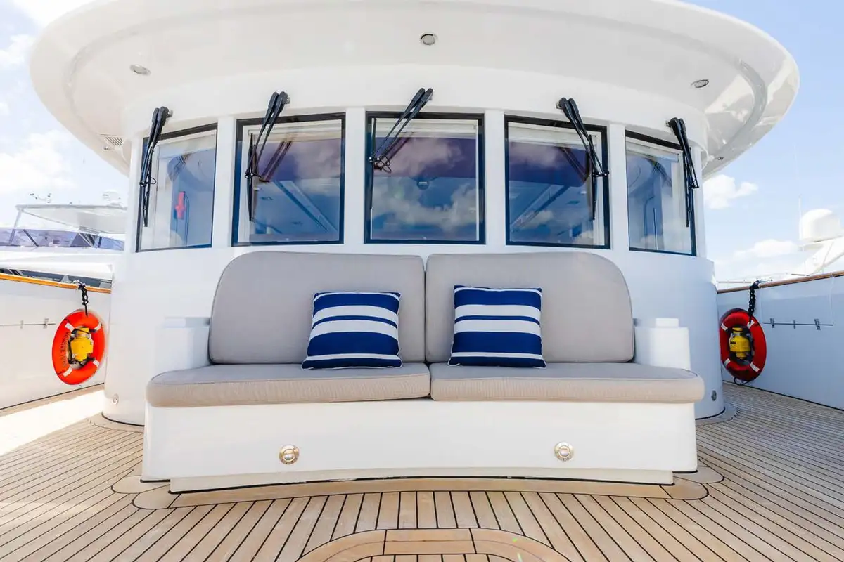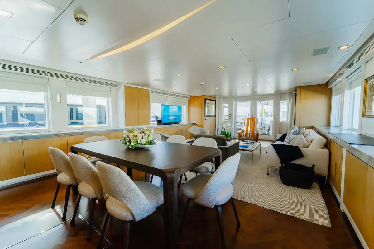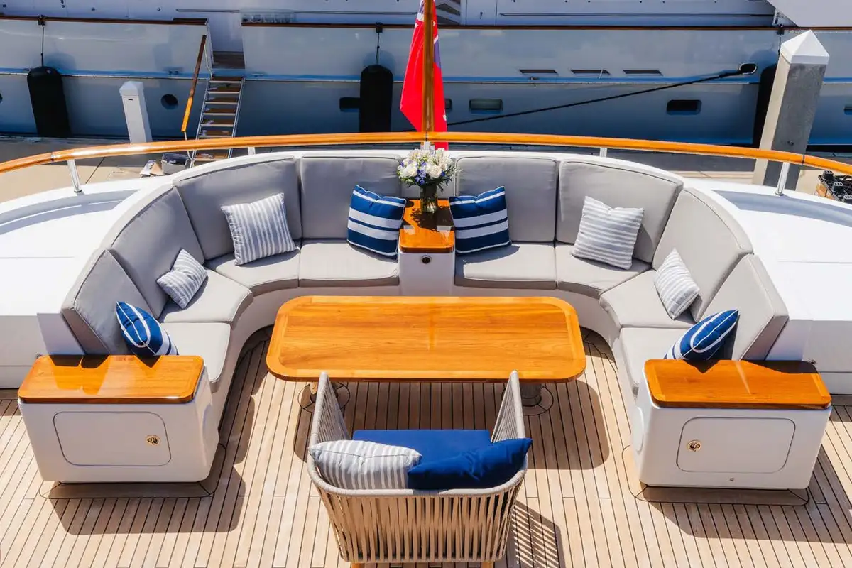 She accommodates 12 guests in five cabins including a full beam master suite on the main deck while below are two VIP suites and two twins, each with an extra Pullman bed, all with entertainment systems and full en suite bathroom facilities.