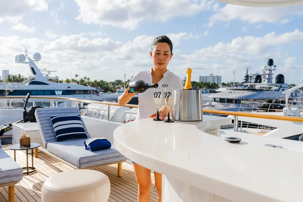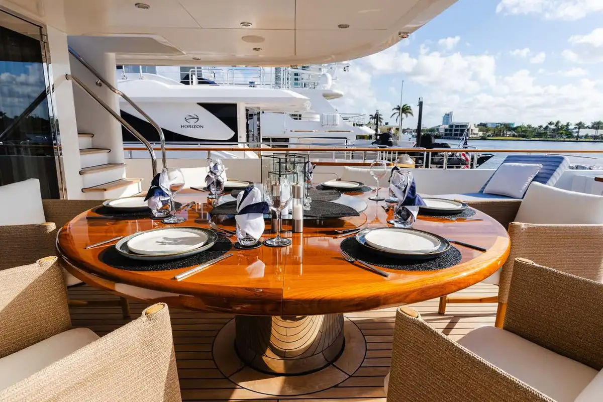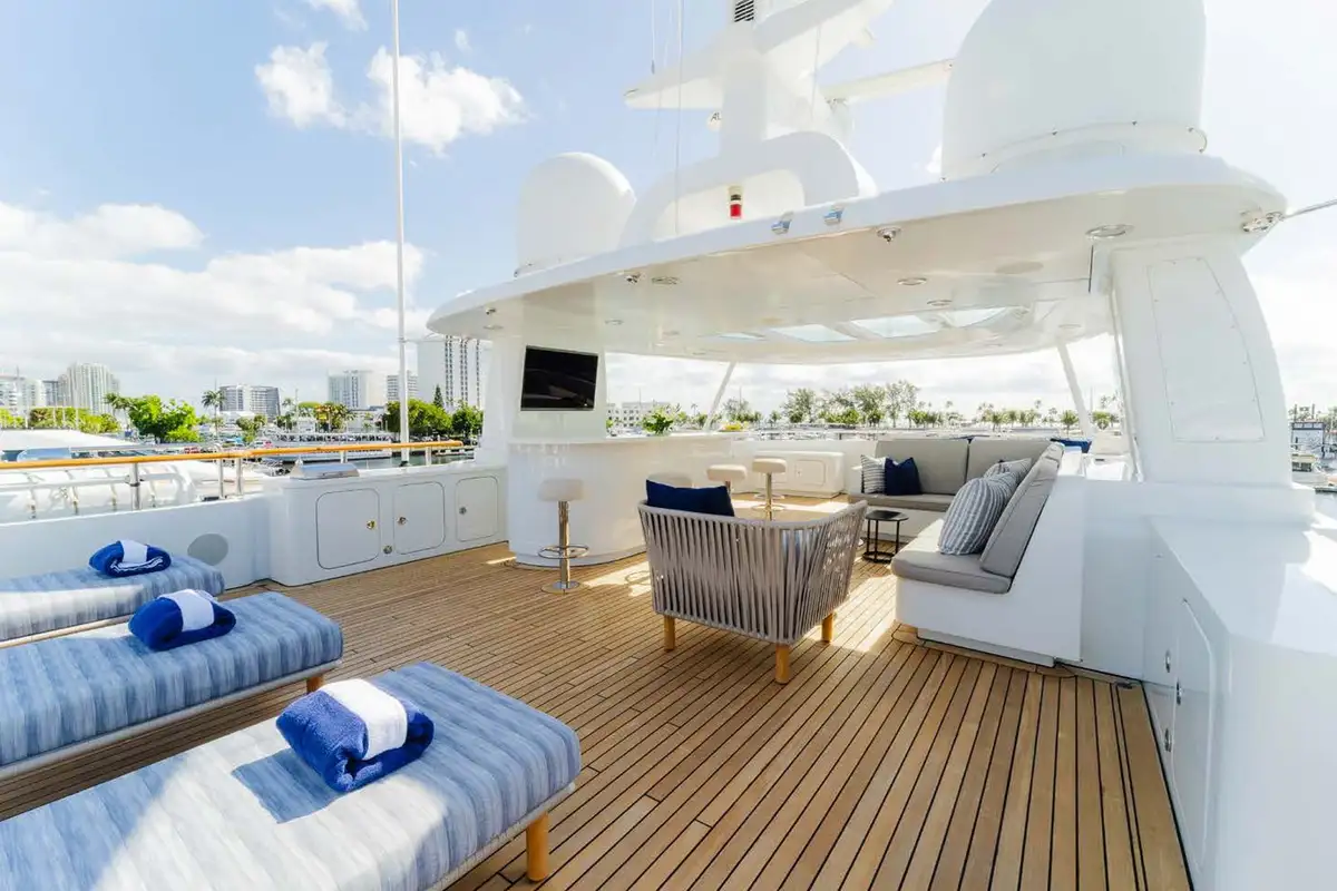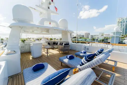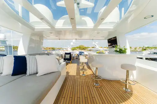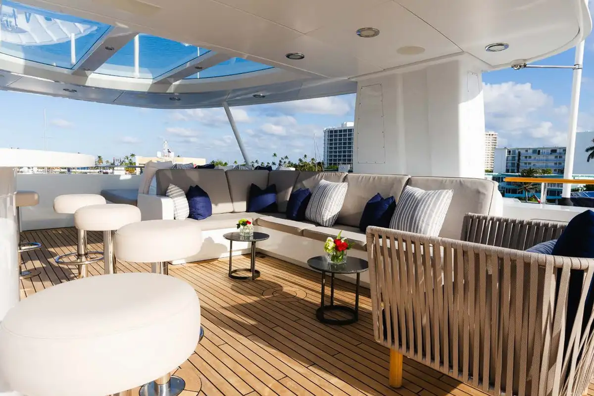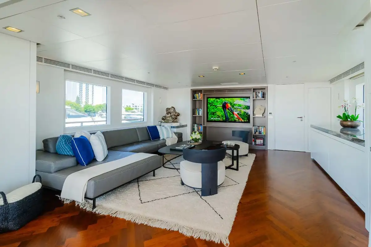The bridge deck is particularly attractive with a sky lounge opening out onto an uncovered aft deck and a partially covered sun deck with a Jacuzzi, bar and electric barbecue. The sundeck also features a very large bar-food service counter to port, with six fixed bar stools that are comfortably far apart. Opposite, there is a large settee and sunpads forward. A drop-down TV has also been installed. Recessed lighting at the base of the bar area and the settee combined with lighting inside the Jacuzzi create a great nighttime feel. These large deck areas are perfect for al fresco relaxation, entertaining and dining.