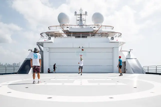 On the bridge deck below, guests have plenty of room for outdoor entertainment as a pool is located aft along with al fresco dining, a bar and pizza oven. Just beneath the bridge deck is a deck dedicated to entertainment where guests can enjoy a range of facilities including a spa, library and bar, cinema, gym, multiple lounges including a forward-facing observation area and a basketball court on the deck below.