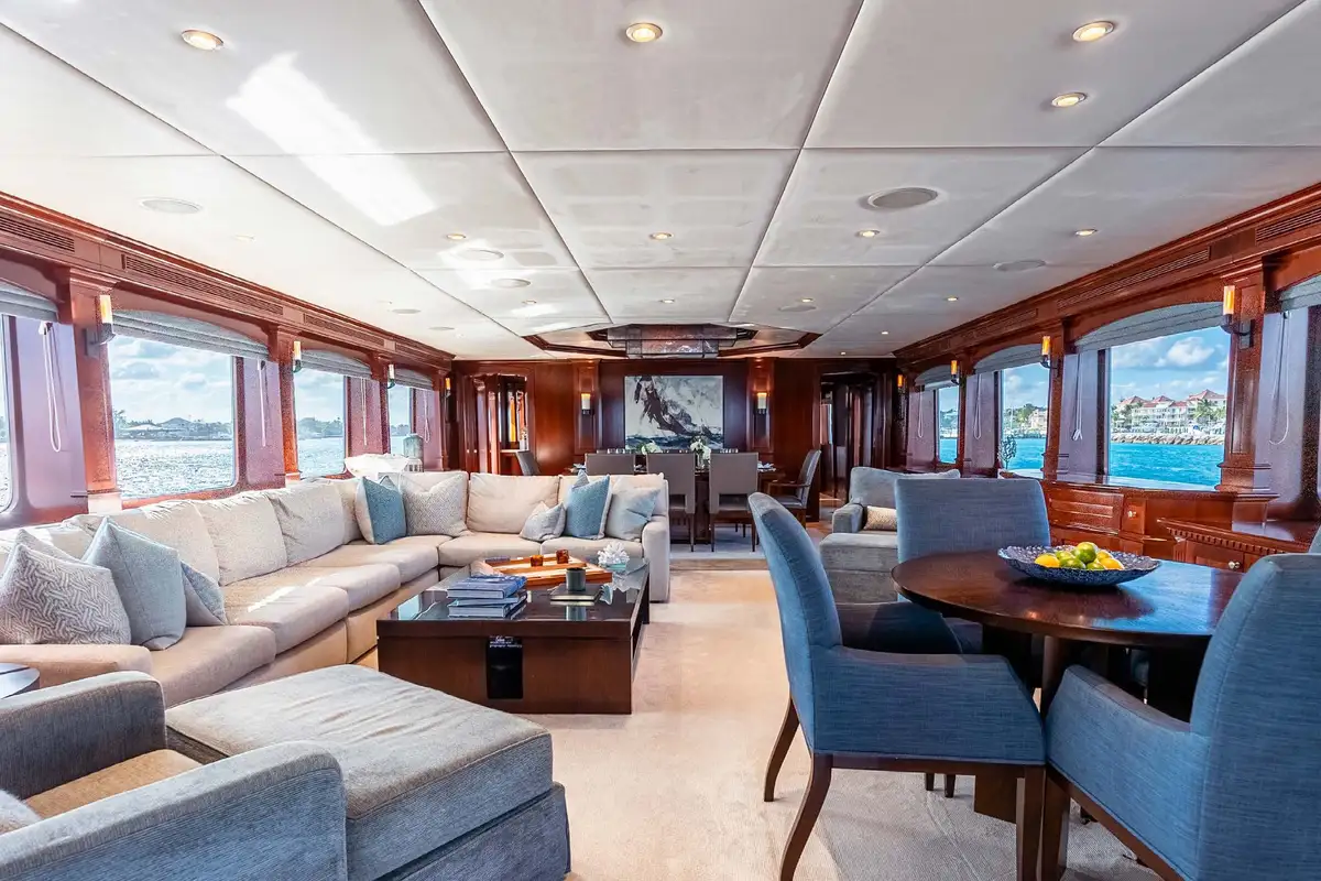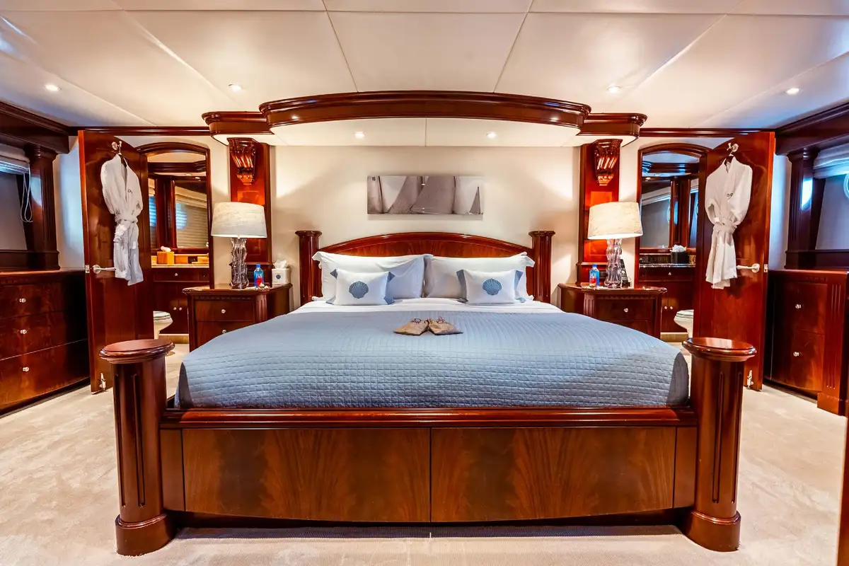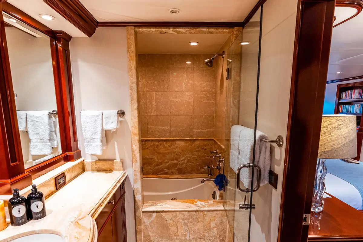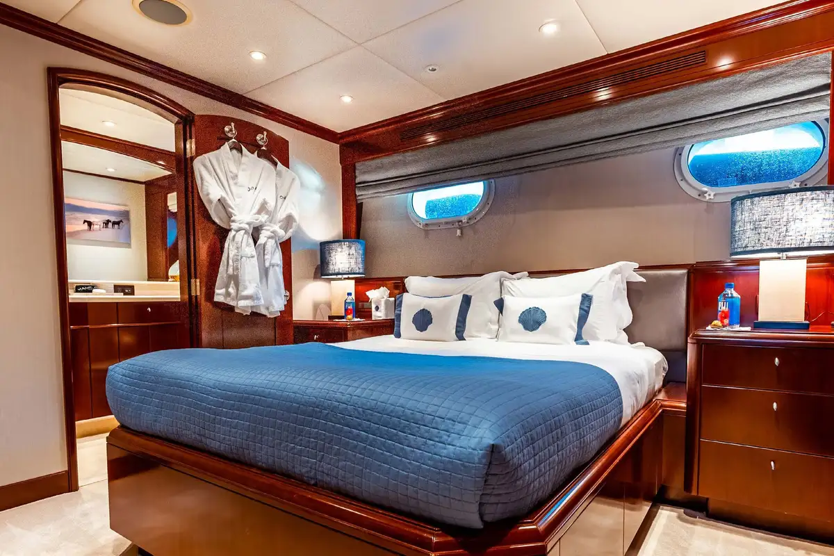 All guest accommodation is located on the lower deck, including the generous full-beam master suite – a tranquil retreat with refined wood panelling, soft lighting and a soothing feel. Here, you’ll find a sofa, desk, walk-in wardrobe, and the added comfort of separate his and hers en suite bathrooms.