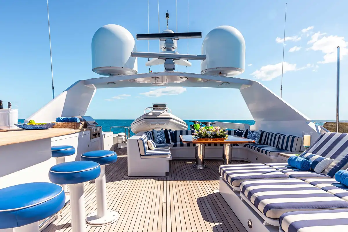 Dining on board is a highlight. For breakfast or relaxed meals, enjoy the al fresco dining area in the cockpit or the shaded U-shaped dinette up on the sundeck. With sunloungers, a cocktail bar, a BBQ and plenty of space to relax under the sun or canopy, the sundeck may just become your favourite place on board.
