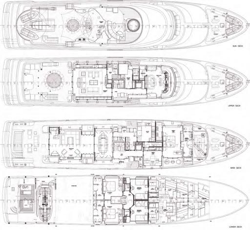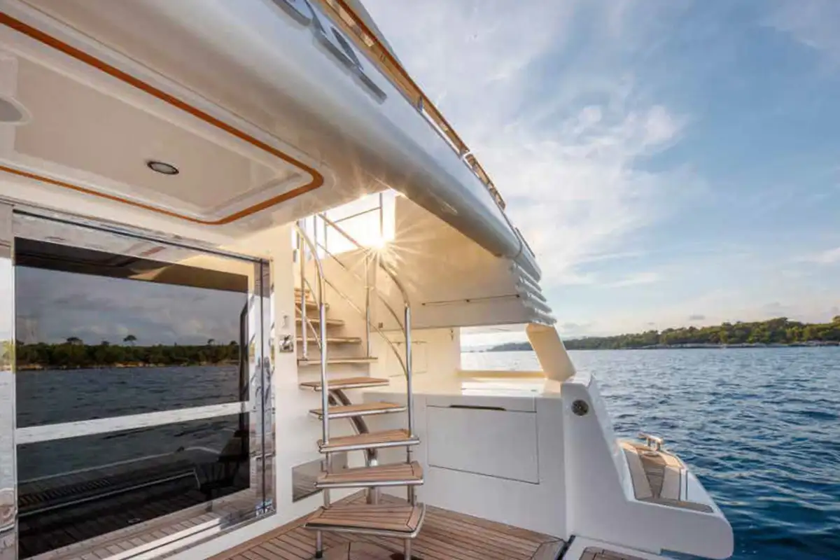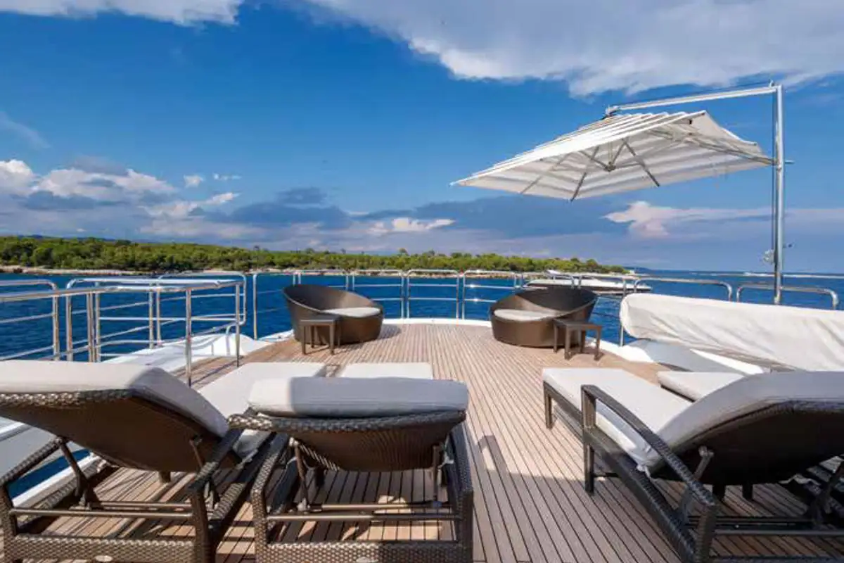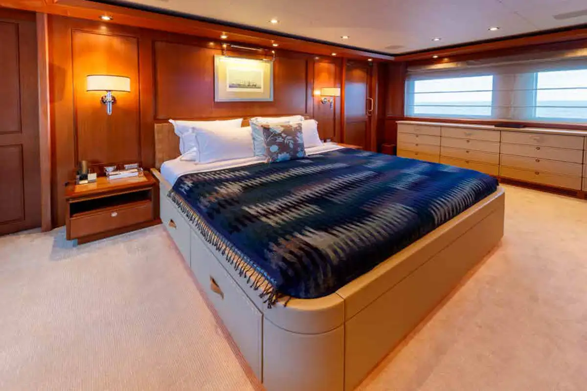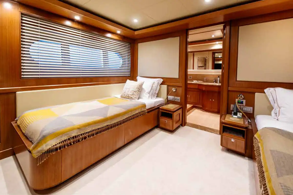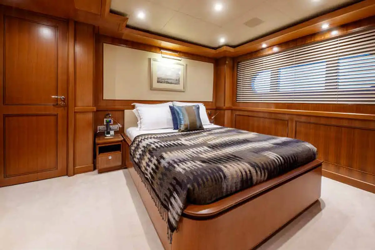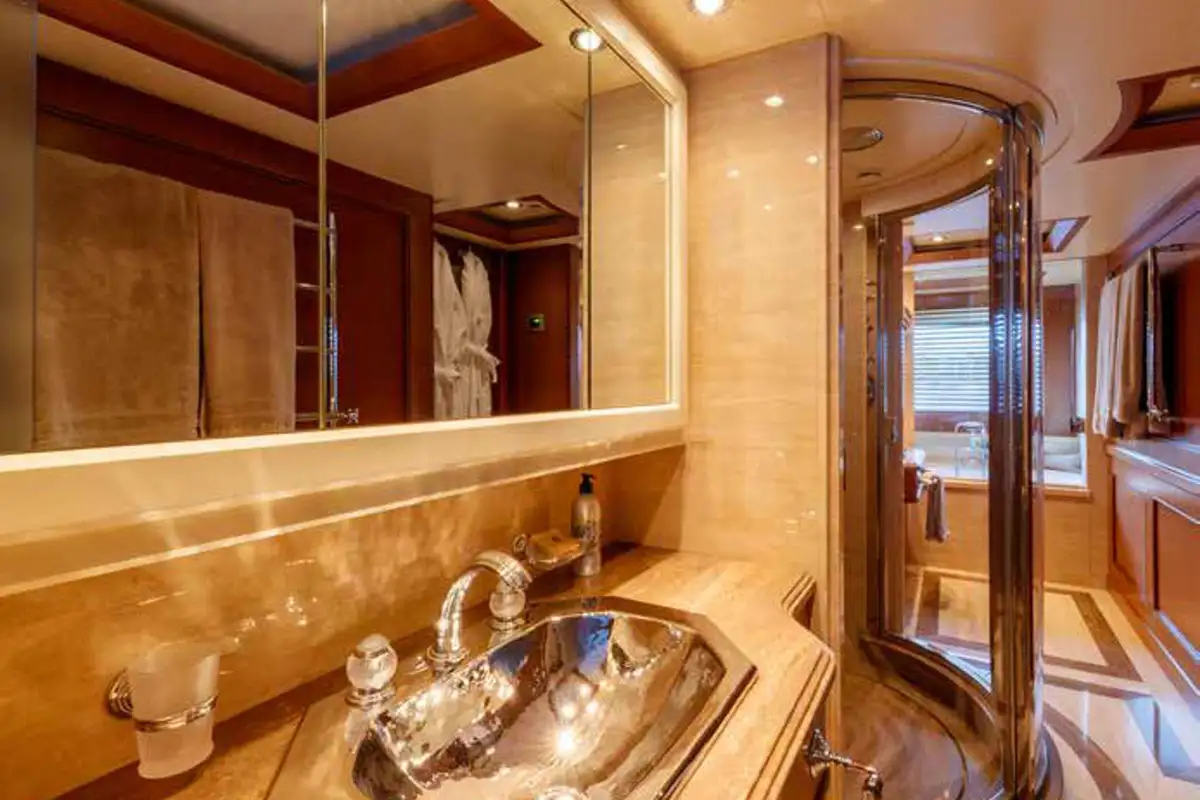 Accommodation is provided for up to ten guests across five luxurious cabins. The full-beam master suite on the main deck includes a king-size bed, private office, sitting area, walk-in wardrobe, and an opulent marble en suite bathroom with a bathtub and separate shower. Additionally, the master suite boasts an enclosed private balcony, ideal for morning coffees or evening cocktails. The lower deck houses two VIP staterooms and two twin cabins, each with en suite facilities and state-of-the-art entertainment systems.