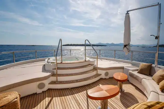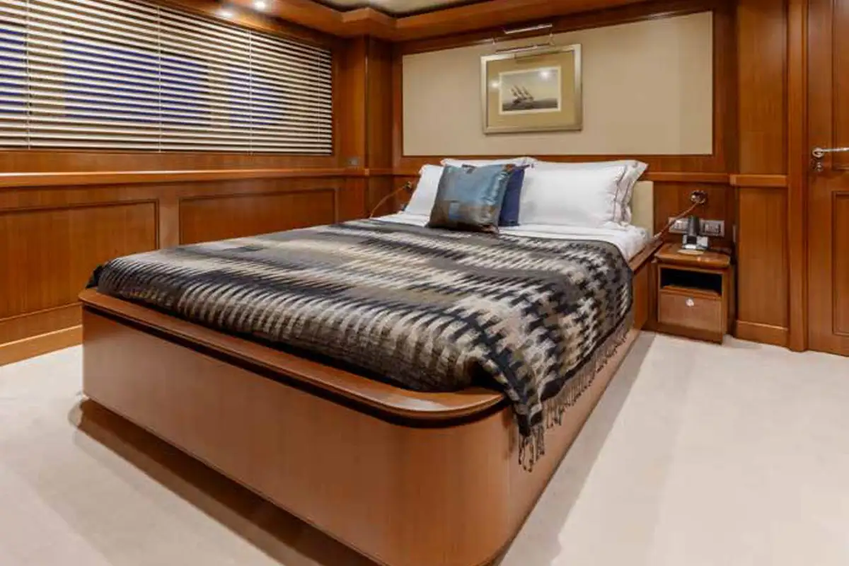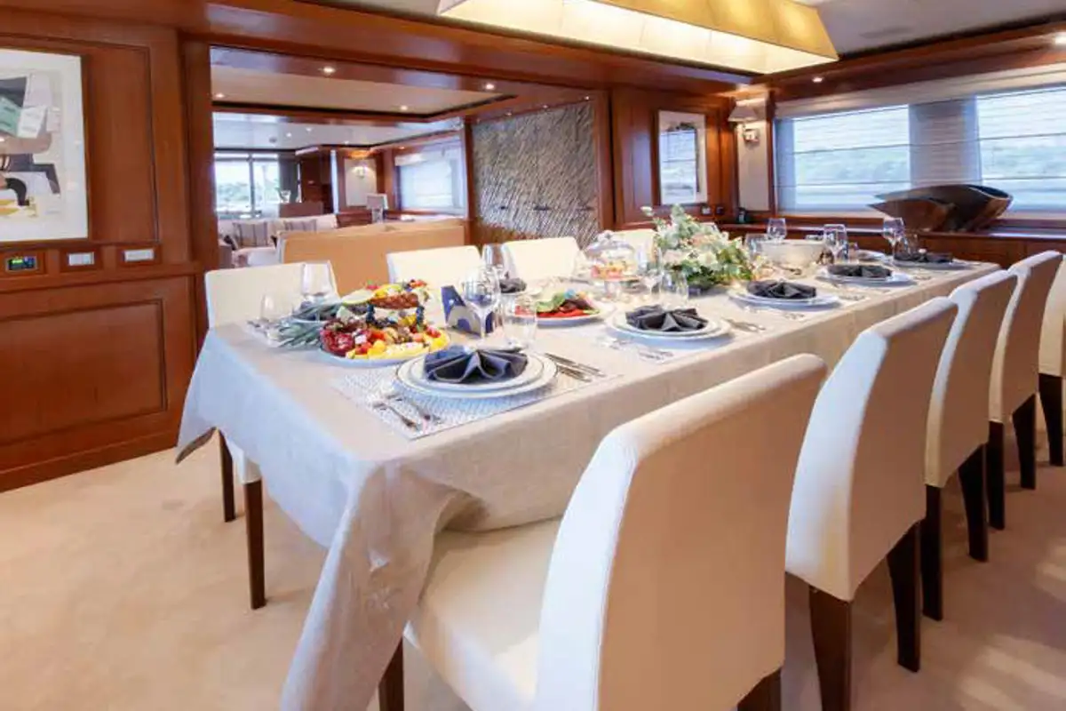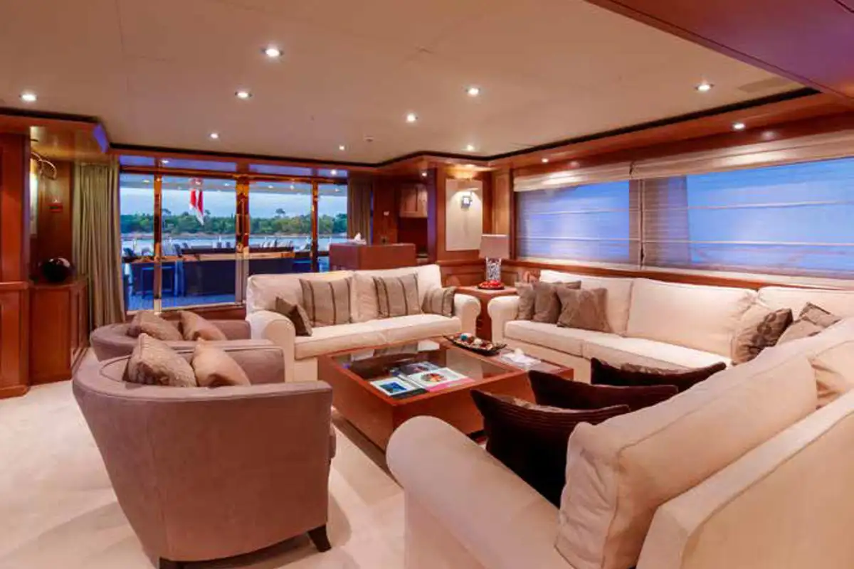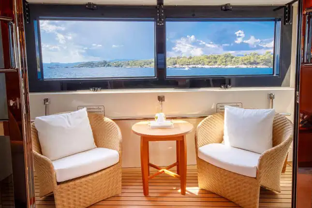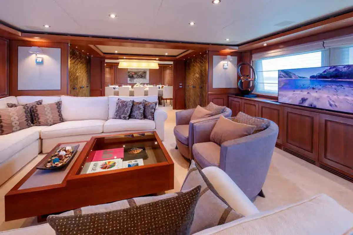Inside, the yacht exudes sophistication with interiors adorned in warm Canaletto walnut, cream leather ceilings, and Tai Ping carpets. The main deck lounge offers plush seating, an onyx-topped bar, and a formal dining area that can be enclosed for intimate gatherings. The upper deck sky lounge features deep-cushioned sofas, a marble-surrounded fireplace, and a large-screen TV, creating a cozy atmosphere for movie nights or leisurely evenings.