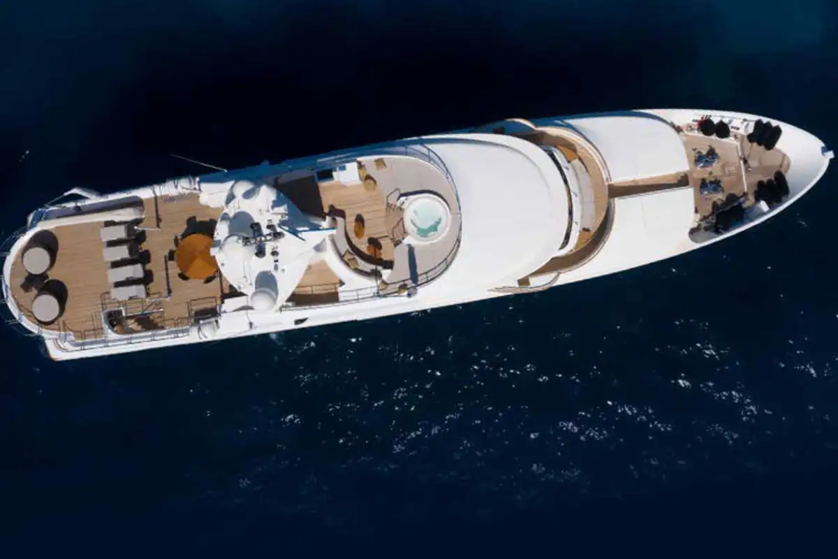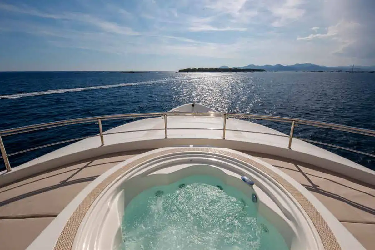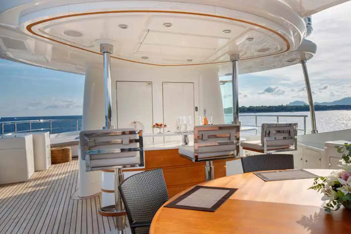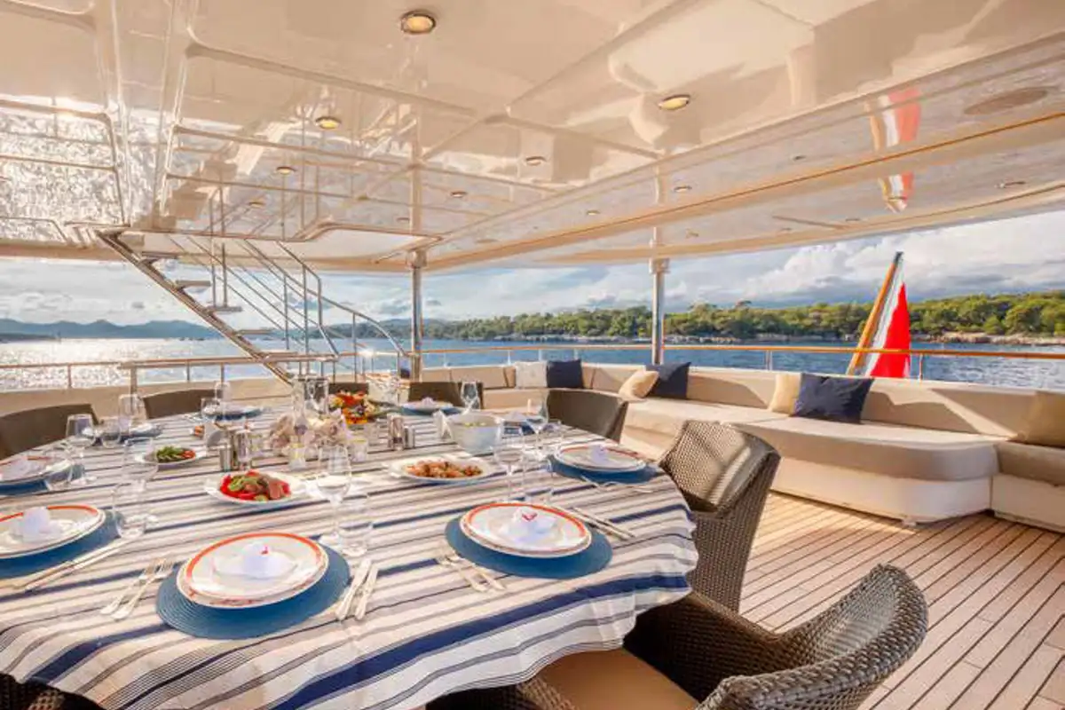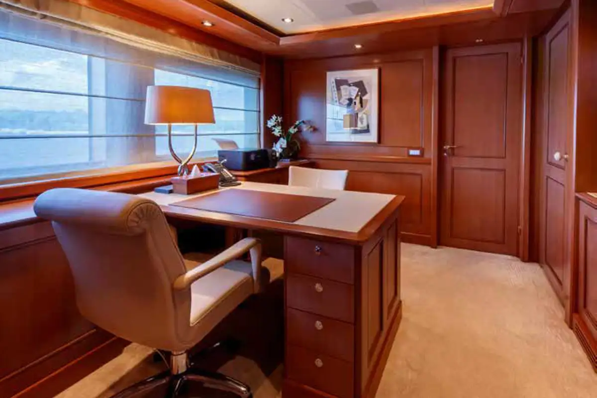 Inside, the yacht exudes sophistication with interiors adorned in warm Canaletto walnut, cream leather ceilings, and Tai Ping carpets. The main deck lounge offers plush seating, an onyx-topped bar, and a formal dining area that can be enclosed for intimate gatherings. The upper deck sky lounge features deep-cushioned sofas, a marble-surrounded fireplace, and a large-screen TV, creating a cozy atmosphere for movie nights or leisurely evenings.
