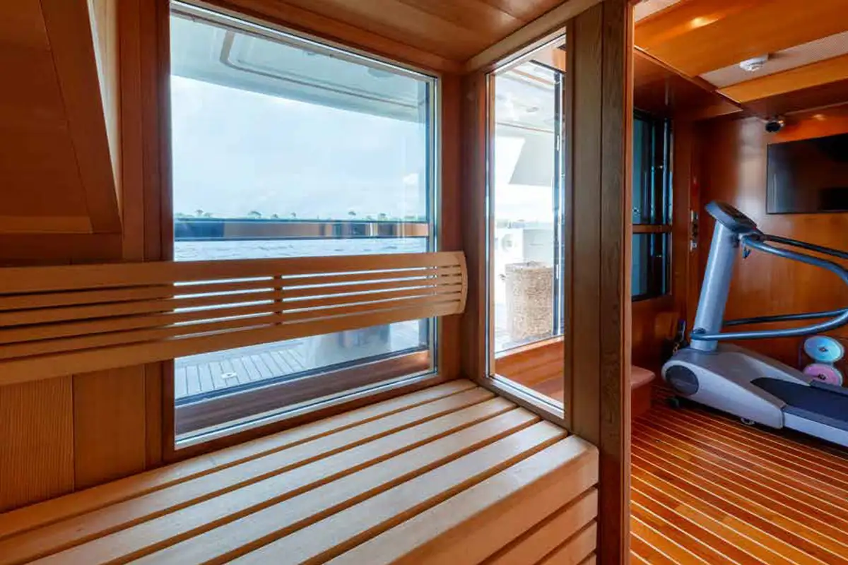 For the active charterer, O'LION offers a comprehensive selection of water toys and amenities. Guests can enjoy a Yamaha jetski, SeaBobs, water skis, wakeboards, stand up paddleboards, snorkelling equipment, and diving gear with a compressor. The 6.5-metre Castoldi tender ensures easy transfers to shore. Onboard wellness facilities include a fully equipped gym, a cedar sauna, and a massage room, catering to both fitness enthusiasts and those seeking relaxation.