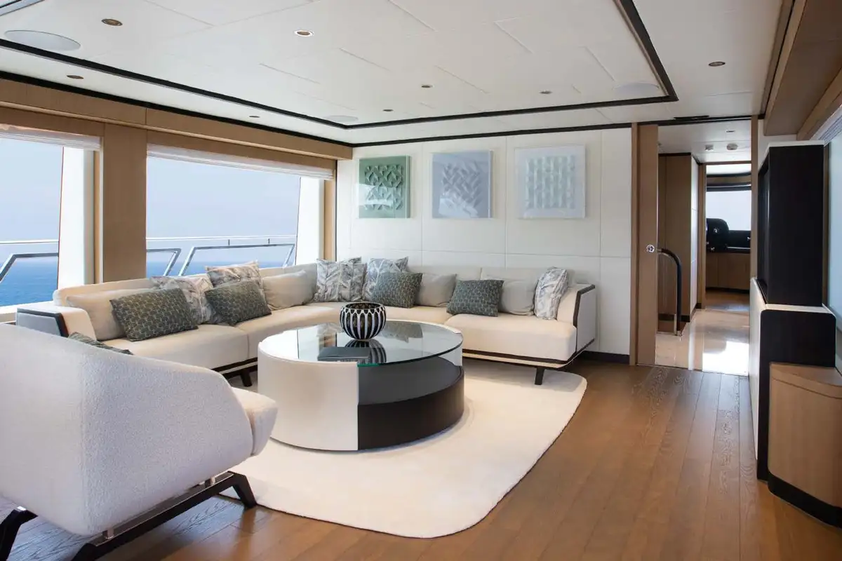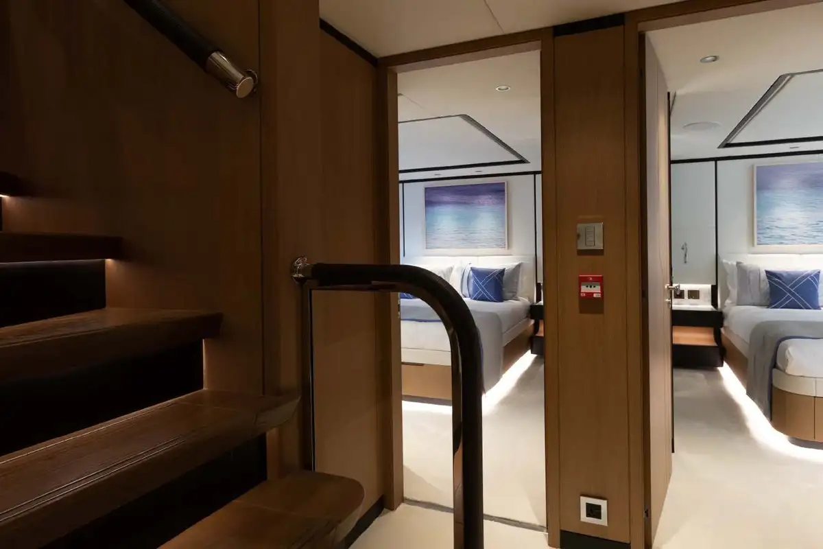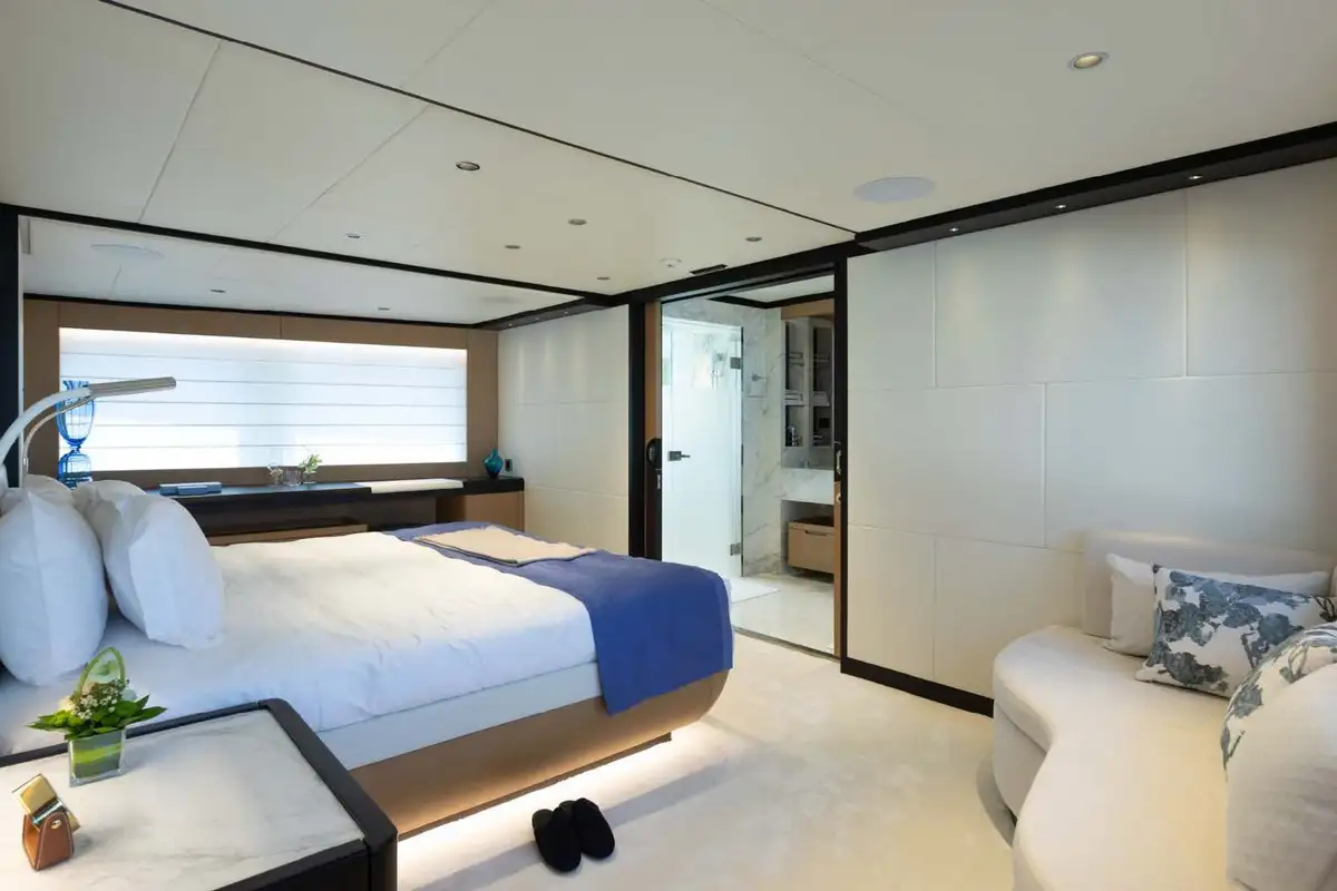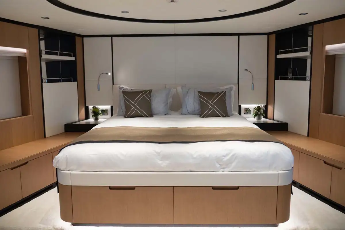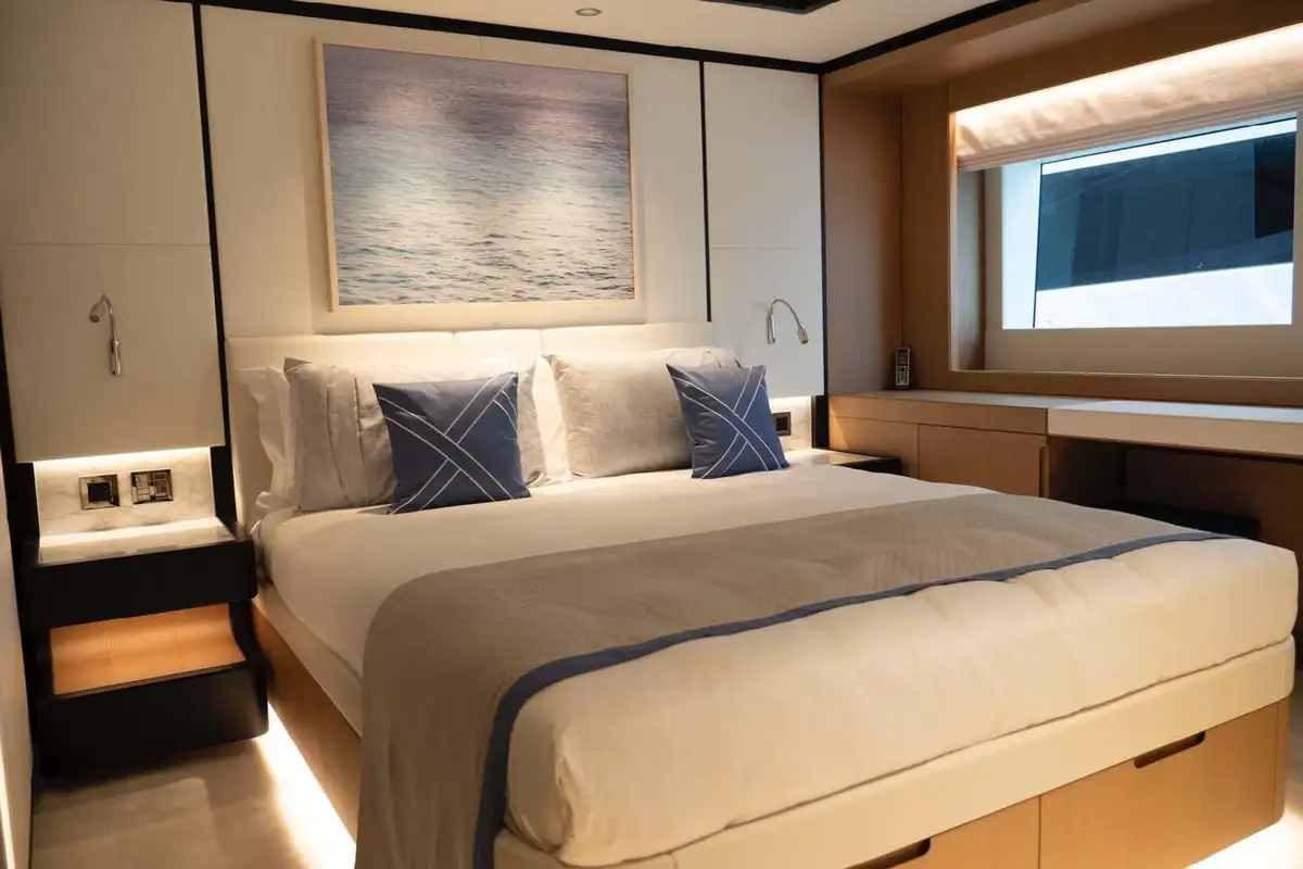The main deck features a spacious lounge and dining area, with Majesty’s signature windows and glass handrails creating uninterrupted views. The master suite, located on the main deck, boasts a king-sized bed and a private deck area. Below deck, guests can choose between three double cabins and two convertible twin cabins, all with modern entertainment systems, ensuring immersive luxury and privacy for everyone on board.