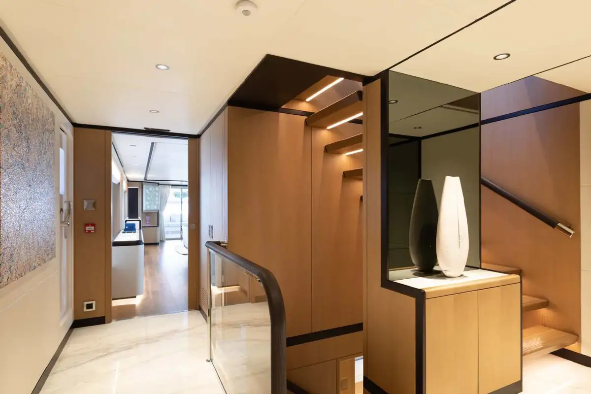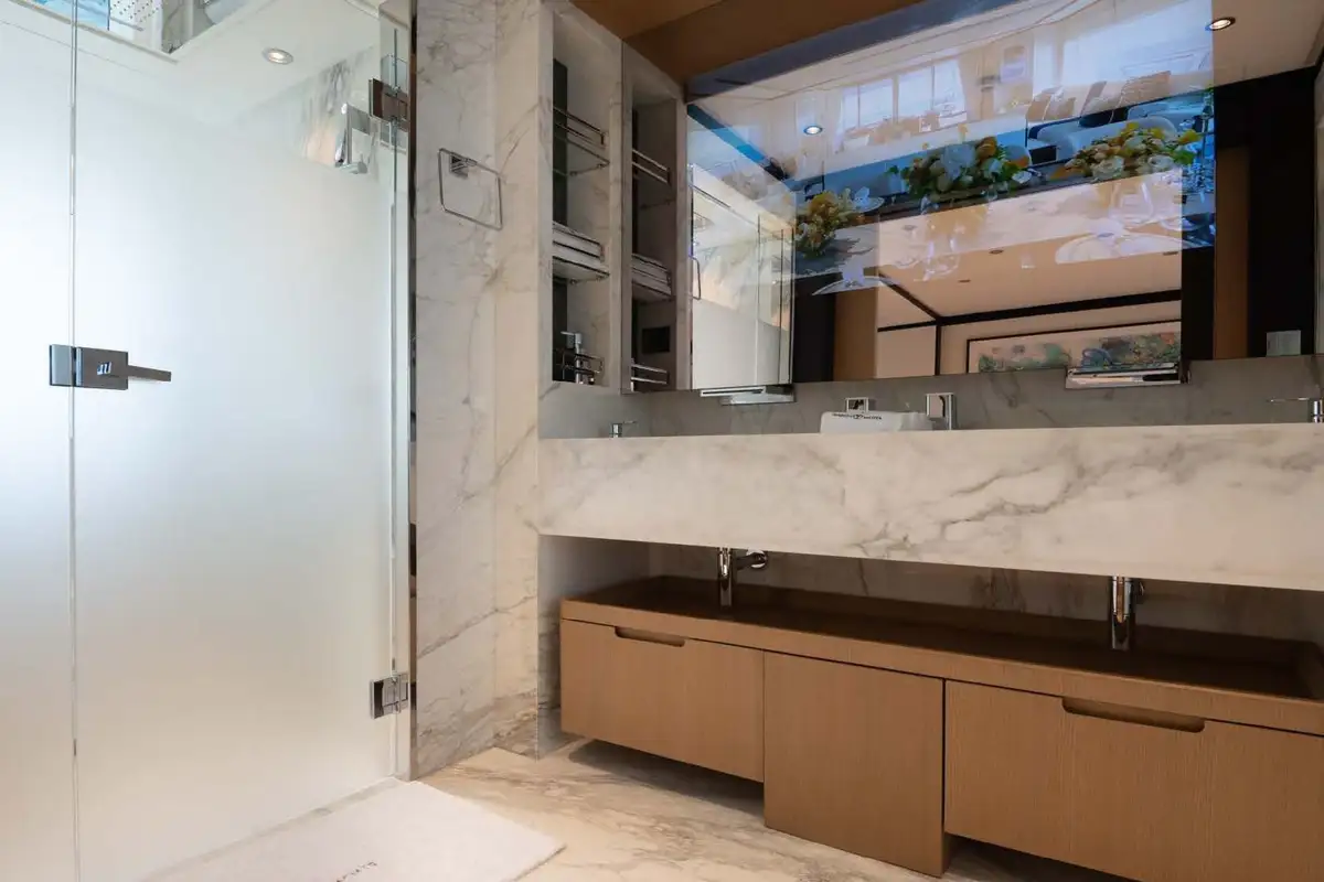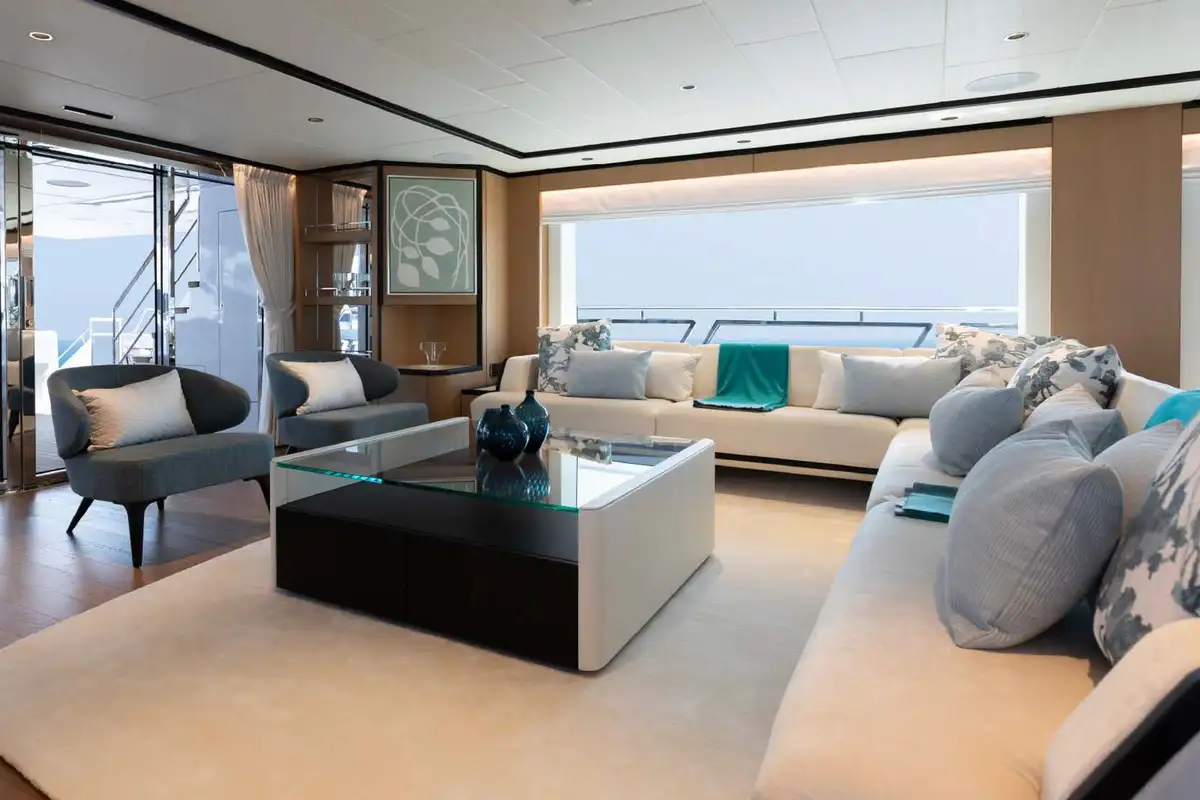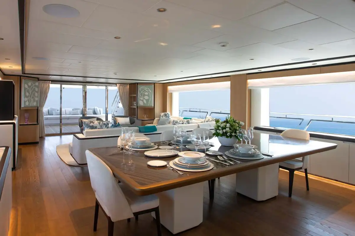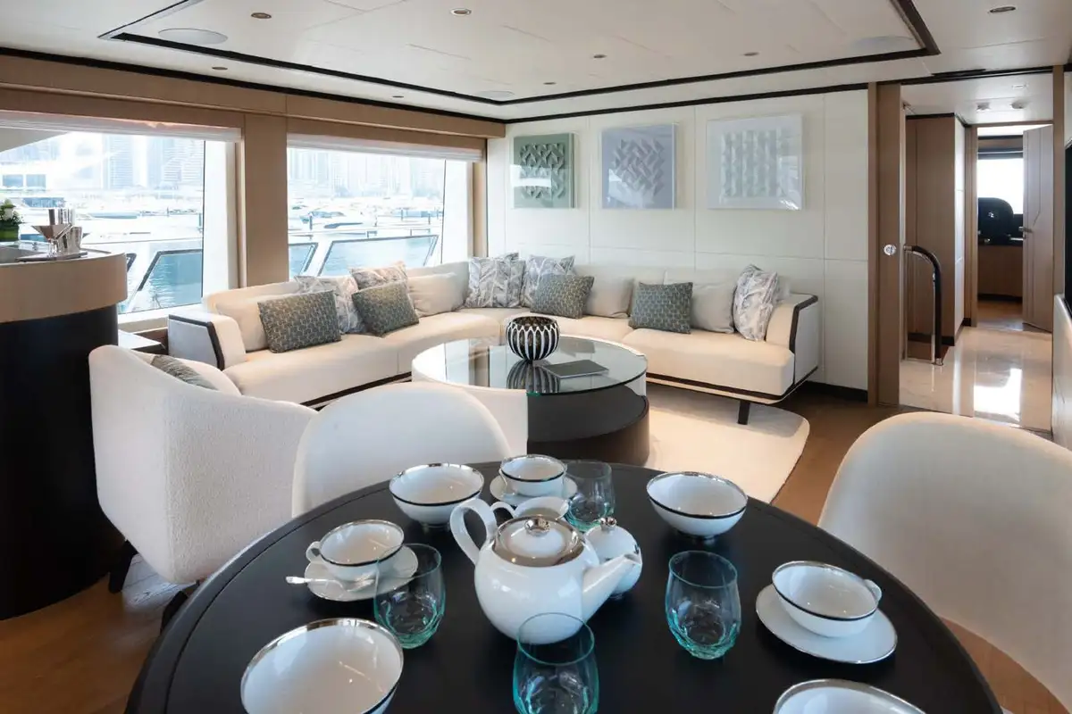 The main deck features a spacious lounge and dining area, with Majesty’s signature windows and glass handrails creating uninterrupted views. The master suite, located on the main deck, boasts a king-sized bed and a private deck area. Below deck, guests can choose between three double cabins and two convertible twin cabins, all with modern entertainment systems, ensuring immersive luxury and privacy for everyone on board.