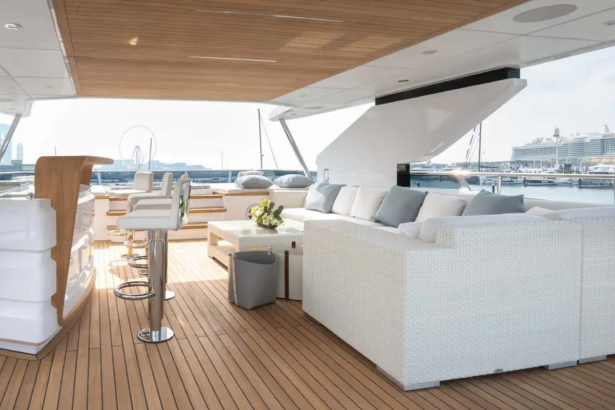 OLIVIA’s sundeck is a standout feature, with a jacuzzi, sunbathing areas, and a bar for refreshing cocktails. The flybridge offers additional sunbathing and seating, providing the perfect place to relax and enjoy the view. The yacht is also equipped with an impressive selection of watertoys, including jetskis, SeaBobs, and an inflatable towable donut – which children will love. The crew will also assist with excursions to nearby beaches or secluded coves, providing guests with exclusive access to the best of the coastline.