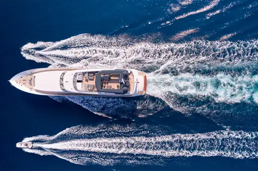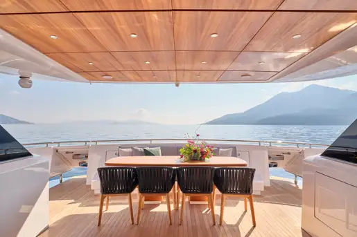 O’NEIRO’s modern design flows seamlessly to her exterior. Her spacious flybridge offers multiple configurations for lounging and al fresco dining, while the aft deck presents another inviting outdoor dining area – ideal for meals with a view.