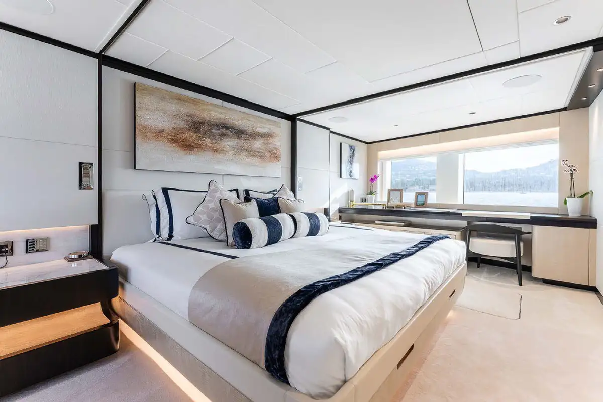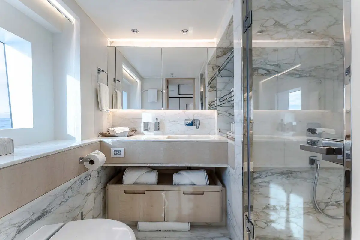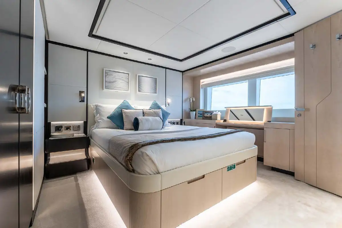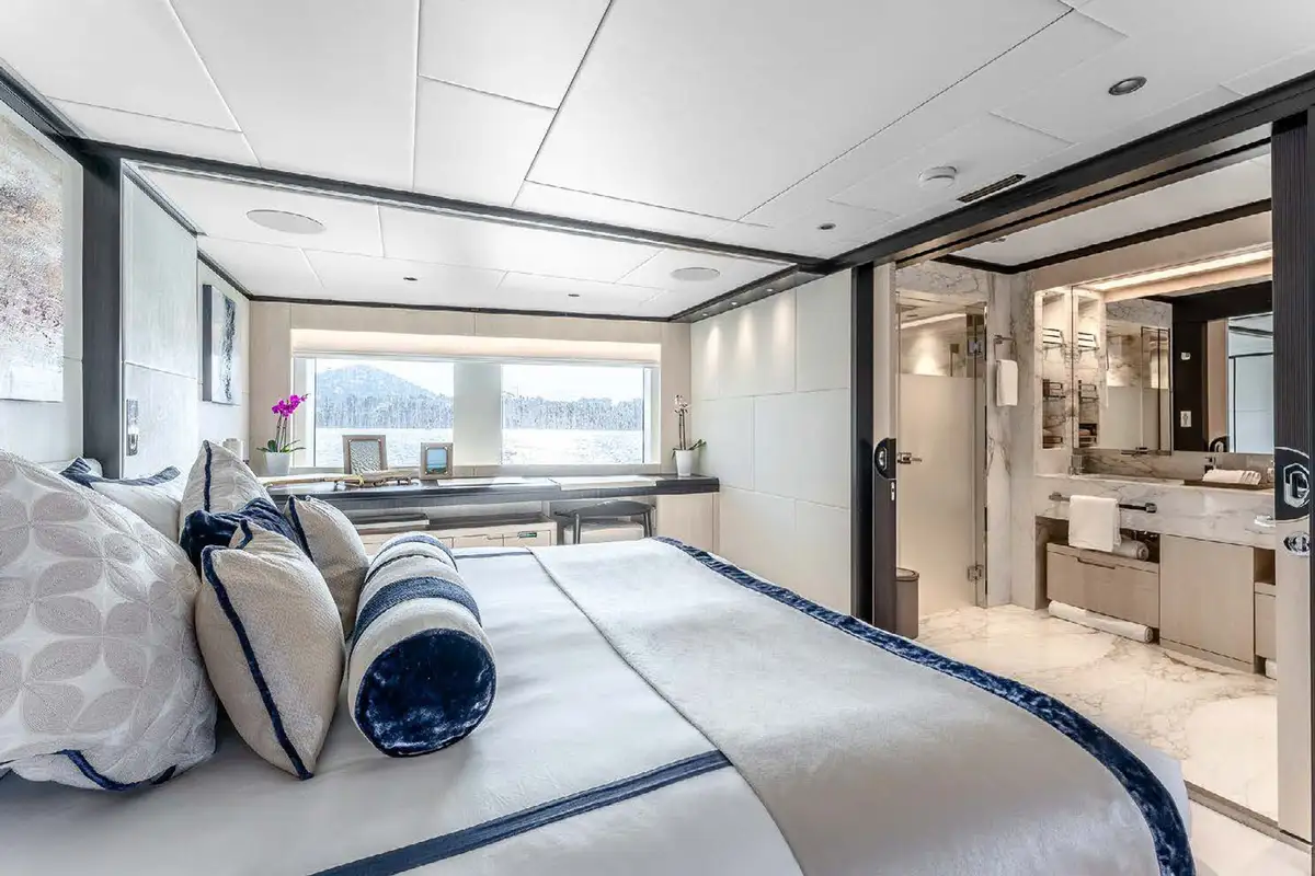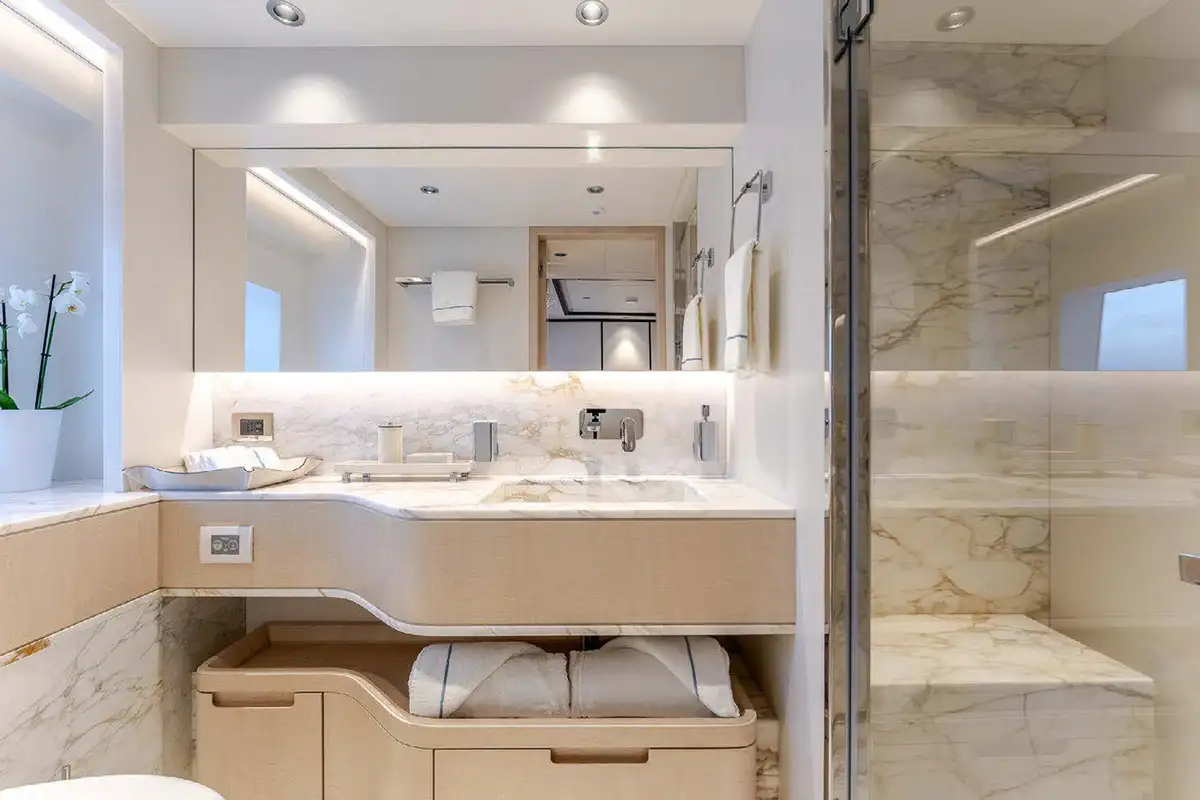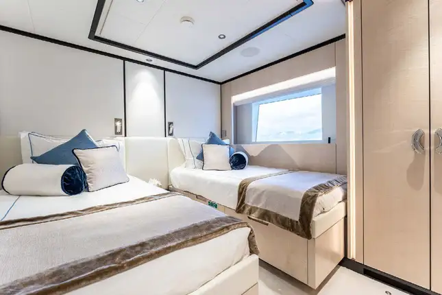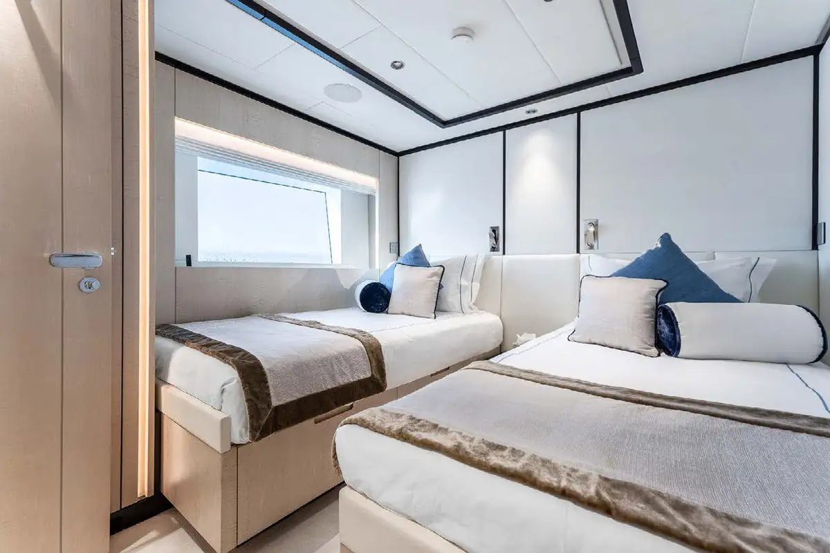 OPTIMISM welcomes up to 12 guests in six beautifully appointed cabins, offering an ideal layout for both families and friends. Accommodation includes a full-beam master suite, a VIP, two further doubles, and two flexible twin cabins that convert to doubles, each with its own en suite. The interiors are bright and welcoming, with a relaxed open-plan design, panoramic windows, and elegant furnishings that blend comfort with understated sophistication.