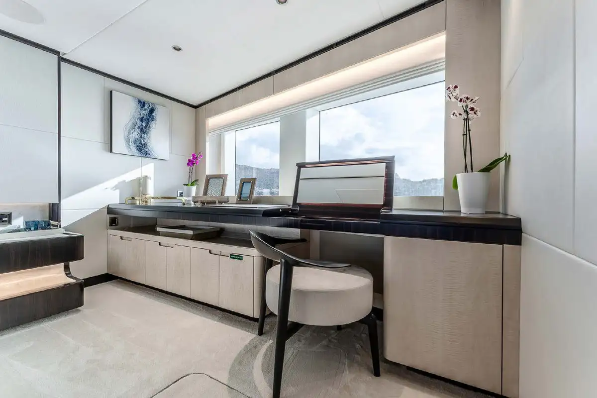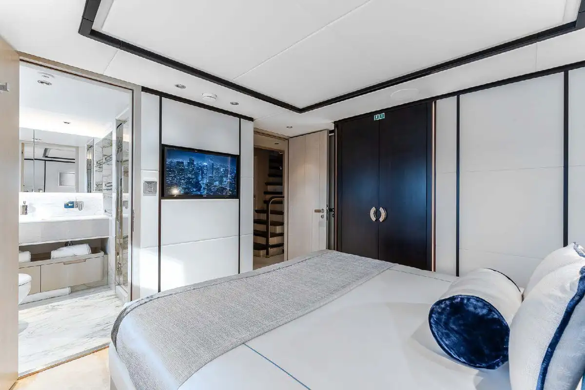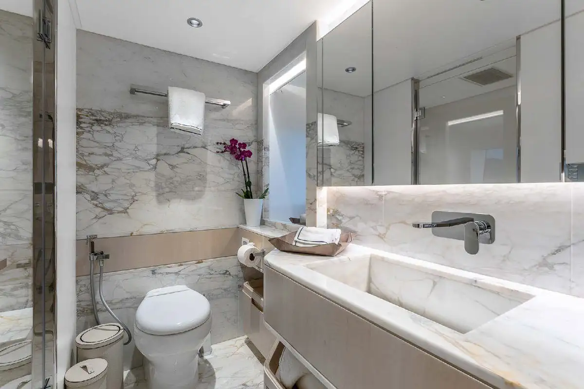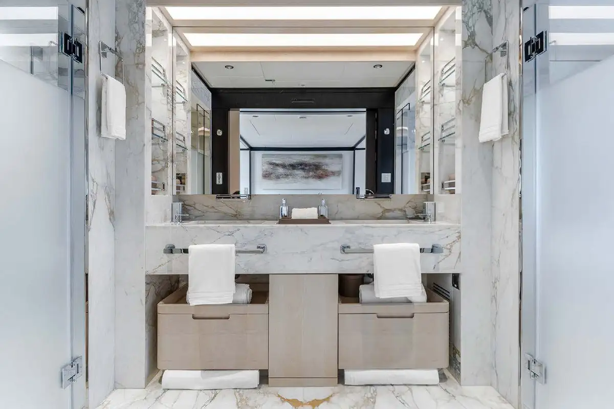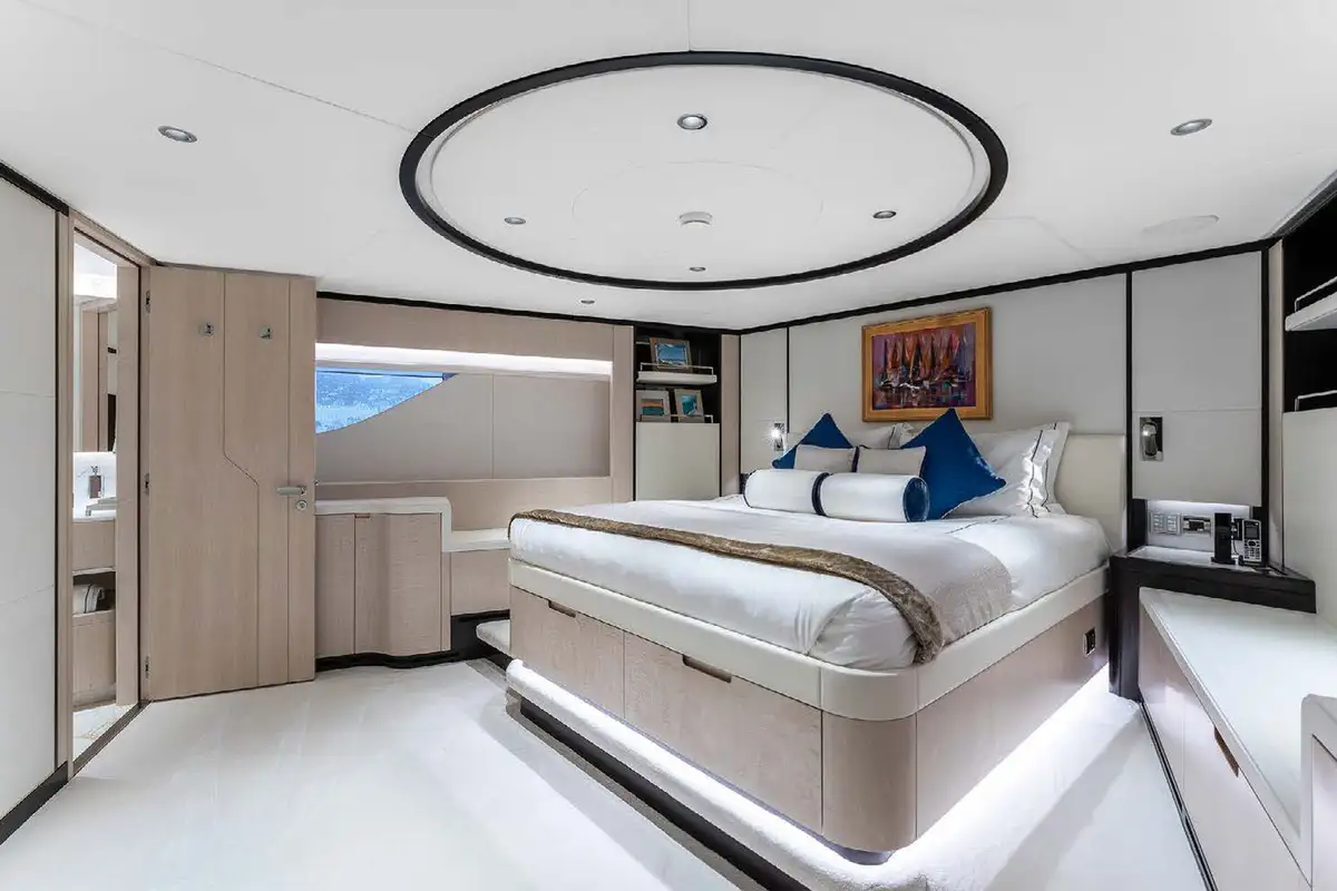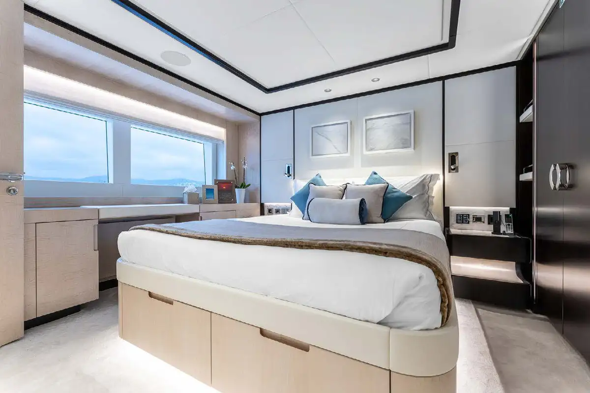 OPTIMISM welcomes up to 12 guests in six beautifully appointed cabins, offering an ideal layout for both families and friends. Accommodation includes a full-beam master suite, a VIP, two further doubles, and two flexible twin cabins that convert to doubles, each with its own en suite. The interiors are bright and welcoming, with a relaxed open-plan design, panoramic windows, and elegant furnishings that blend comfort with understated sophistication.