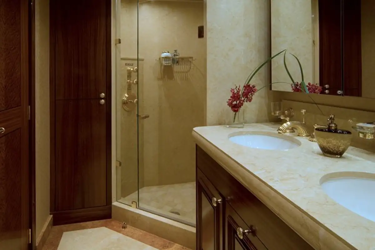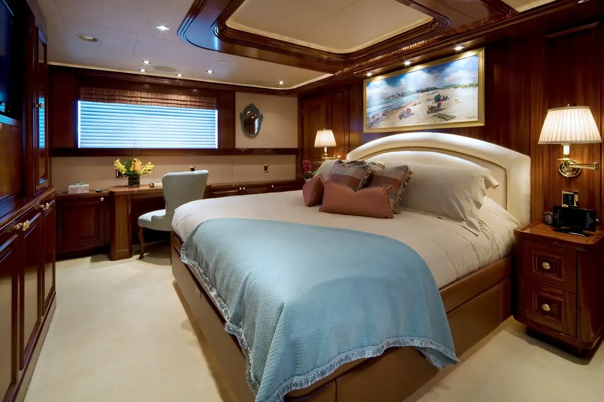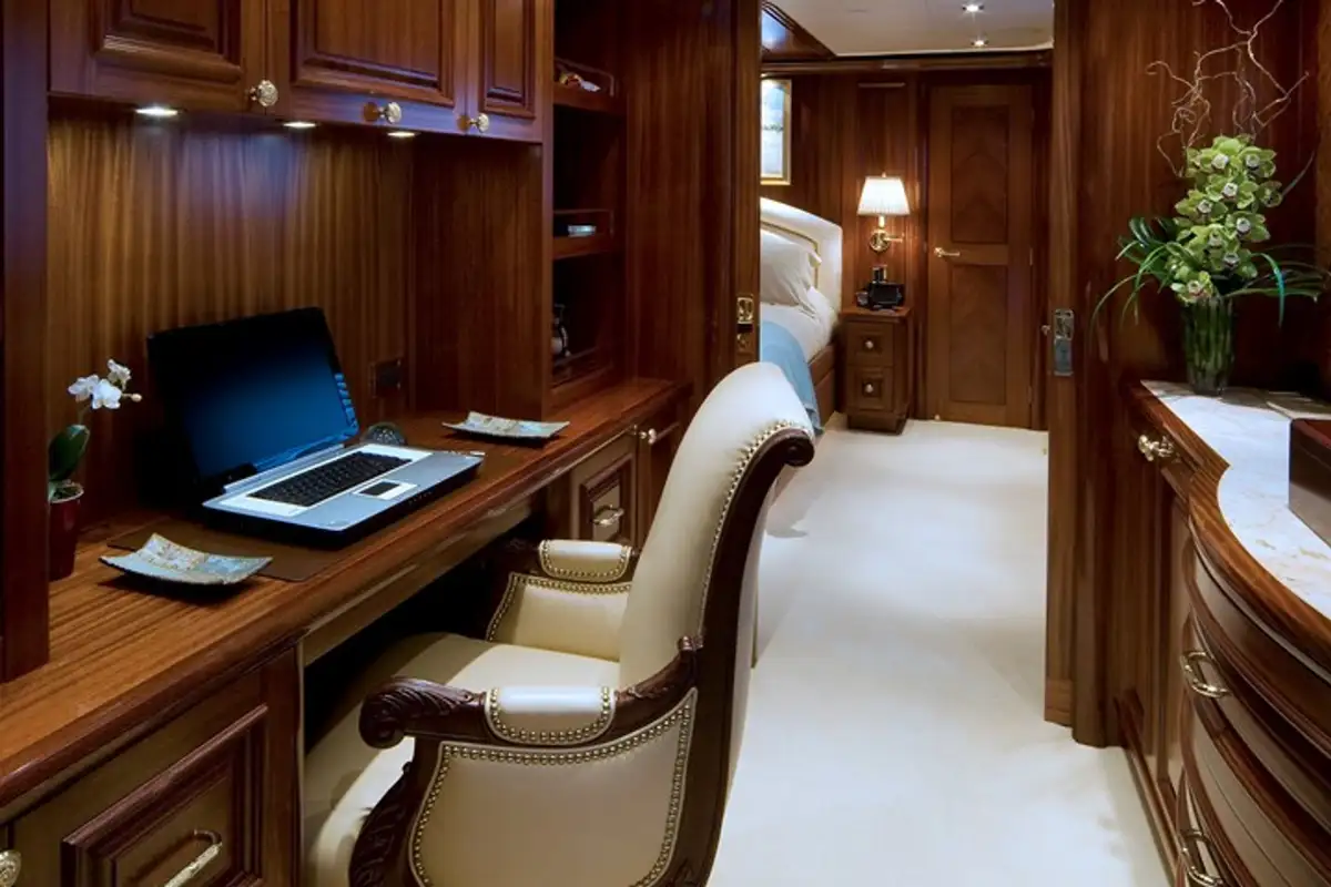 Up front on the main deck, the master suite is a full-beam cabin with a traditional nautical feel and a finely crafted finish. A private office leads into the main cabin where there’s a desk on one side of the king size bed and a lounge area on the other. Two separate walk-in closets provide a vast amount of storage space. The en suite bathroom has twin sinks and a marble finish. The lower deck guest accommodation includes two large double cabins and two twins, each with its own private en suite bathroom.