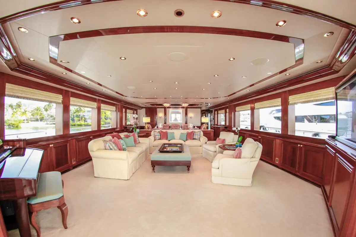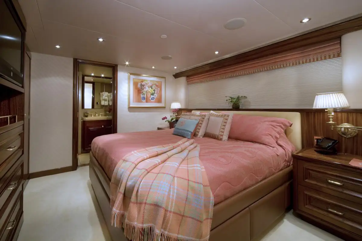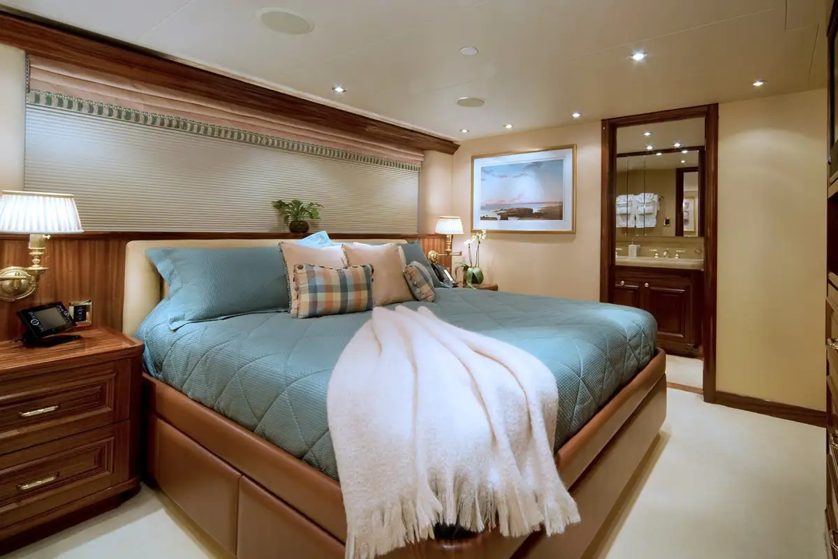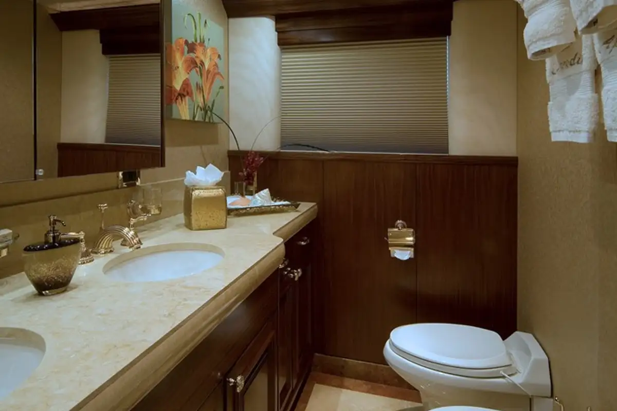 Up front on the main deck, the master suite is a full-beam cabin with a traditional nautical feel and a finely crafted finish. A private office leads into the main cabin where there’s a desk on one side of the king size bed and a lounge area on the other. Two separate walk-in closets provide a vast amount of storage space. The en suite bathroom has twin sinks and a marble finish. The lower deck guest accommodation includes two large double cabins and two twins, each with its own private en suite bathroom.